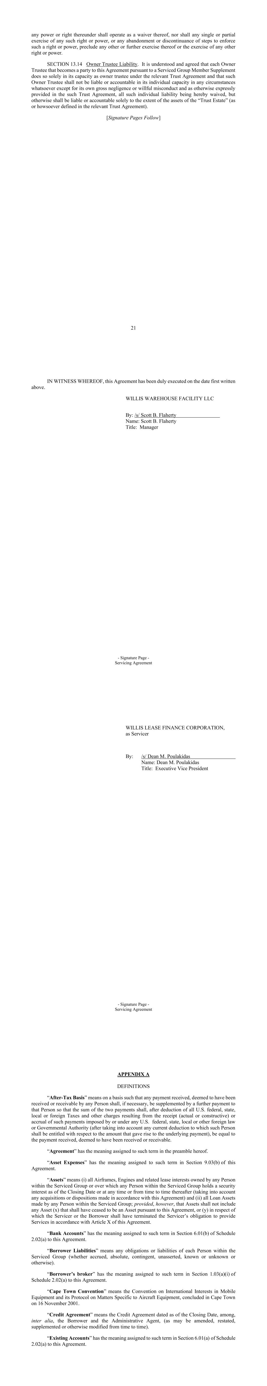 - 39 - (g) the applicable Asset Lease and Loan Asset, any head lease, lease, loan, Loan Asset Borrower Mortgage, collateral assignment to a Borrower Group Member of a sublease or related rights, conditional sale agreement or Purchase Option under any Asset Lease or Loan Asset in respect of any Aircraft Equipment, in each case not otherwise prohibited by this Agreement; (h) any Lien for air navigation authority, airport tending, gate or handling (or similar) charges or levies arising by statute or operation of law if (i) the payments for such fees and charges are not yet due and payable, (ii) promptly after the Borrower Group Company becomes aware thereof, either the Servicer is acting in accordance with the Standard of Care to contest or to direct the applicable Lessee or other relevant Person to contest such fees and charges in good faith or (iii) the continued existence of such Lien do not give rise to any reasonable likelihood of the sale, forfeiture or other loss of the affected asset; (i) Liens imposed by law with respect to liabilities that are not yet due and payable or that are being appropriately contested in good faith by appropriate proceedings and on a basis consistent with past practice; (j) Liens for Taxes that are not yet due and payable or that are being contested in good faith by appropriate proceedings for which the Borrower Group Companies have established adequate reserves in accordance with GAAP; (k) statutory Liens of landlords and Liens of carriers, warehousemen, mechanics, materialmen, workmen, repairmen and other Liens imposed by law with respect to liabilities that are not yet due and payable, that arise in the ordinary course of business or by operation of law, or that are being appropriately contested in good faith by appropriate proceedings and on a basis consistent with the Standard of Care; (l) the rights of any Owner Trustee, and any voting trust or similar rights created in relation to an Asset in connection with the registration thereof; and (m) any Liens in favor of the Security Trustee. “Permitted Holder” means each of Charles F. Willis IV and Austin Willis, any member of each of their respective immediate families, and each of their respective trusts, family limited partnerships or heirs. “Permitted Investments” means, and may include investments for which the Security Trustee or any of its affiliates serves as investment manager or advisor: (a) direct obligations of, or obligations the principal of and interest on which are unconditionally guaranteed by, the United States of America (or by any agency thereof to the extent such obligations are backed by the full faith and credit of the United States of America), in each case maturing within one year from the date of acquisition thereof; (b) investments in commercial paper maturing within 270 days from the date of acquisition thereof and having, at such date of acquisition, the highest credit rating obtainable from S&P or Moody’s; - 40 - (c) investments in certificates of deposit, deposit accounts, banker’s acceptances and time deposits maturing within 180 days from the date of acquisition thereof issued or guaranteed by or placed with, and money market deposit accounts issued or offered by, any domestic office of any commercial bank organized under the laws of the United States of America or any State thereof which has a combined capital and surplus and undivided profits of not less than $250,000,000; (d) fully collateralized repurchase agreements with a term of not more than 30 days for securities described in paragraph (a) of this definition and entered into with a financial institution satisfying the criteria described in paragraph (c) of this definition; or (e) direct obligations of any money market mutual fund or similar investment company all of whose investments consist of obligations having the highest quality rating obtainable from S&P or Moody’s. “Permitted WLFC Change in Control” means any transaction which, but for the involvement of a Permitted Holder or an Affiliate of a Permitted Holder, would otherwise be a WLFC Change in Control. “Person” means any natural person, corporation, limited liability company, trust, joint venture, association, company, partnership, Governmental Authority or other entity. “Plan” means any employee pension benefit plan (other than a Multiemployer Plan) subject to the provisions of Title IV of ERISA or Section 412 of the Code or Section 302 of ERISA, and in respect of which any Borrower Group Company or any ERISA Affiliate is (or, if such plan were terminated, would under Section 4069 of ERISA be deemed to be) an “employer” as defined in Section 3(5) of ERISA. “Pledgor” means the Parent, solely in its capacity as pledgor under the Pledge Agreement. “Portfolio Document Material Default” means, with respect to any Asset Lease or a Loan Asset, (a) any default in the payment of any amount due and payable by the Asset Lessee under such Asset Lease or the Loan Asset Borrower under such Loan Asset, in respect of which the Servicer is exercising, or notifies the Lenders that it will exercise, remedies in accordance with the Standard of Care and is continuing for 60 days or more (or such longer period as agreed to by the Required Lenders (acting reasonably)) or (b) the occurrence under such Asset Lease or Loan Asset of an “event of default,” or the substantially equivalent term, not referenced to in clause (a), and for which the applicable Borrower Group Company is exercising material remedies (other than sending a notice of default in accordance with the Standard of Care). “Portfolio Documents” means: (a) in respect of a Loan Asset, collectively, the Loan Asset and the Loan Asset Documents related to such Loan Asset; (b) in respect of an Owned Asset, the Asset Lease related thereto and the Asset Lease Documents related to such Asset Lease. - 41 - “Portfolio Transaction” means any sale of 15 or more Assets (which may oc