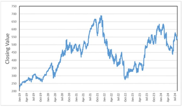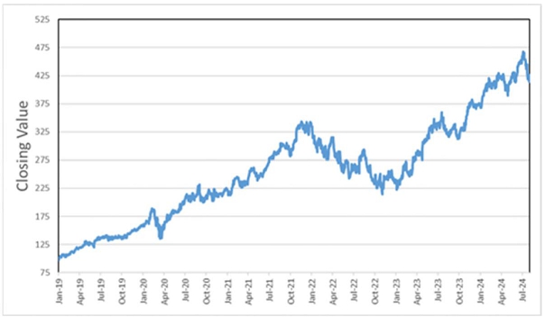 The following graph sets forth the historical performance of the common stock of Microsoft Corporation based on the daily historical closing values from January 1, 2019 through August 1, 2024. We obtained the closing values below from Bloomberg. We have not undertaken any independent review of, or made any due diligence inquiry with respect to, the information obtained from Bloomberg.