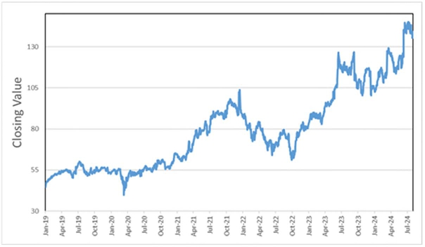The following graph sets forth the historical performance of the common stock of Oracle Corporation based on the daily historical closing values from January 1, 2019 through August 1, 2024. We obtained the closing values below from Bloomberg. We have not undertaken any independent review of, or made any due diligence inquiry with respect to, the information obtained from Bloomberg.