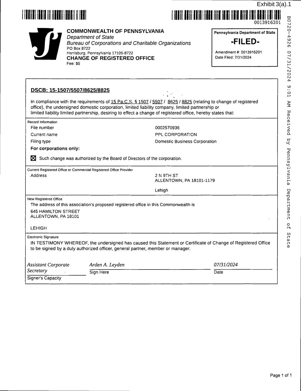 11111111111111111111111111111 111111 1111111111111111111111111111111111111111111111101111191 ii 11 COMMONWEALTH OF PENNSYLVANIA Department of State Bureau of Corporations and Charitable Organizations PO Box 8722 Harrisburg, Pennsylvania 17105-8722 CHANGE OF REGISTERED OFFICE Fee: $5 Pennsylvania Department of State -FILED- Amendment #: 0013916201 Date Filed: 7/31/2024 DSCB: 15-1507/55071862518825 . -. . In compliance with the requirements of 15 Pa.C.S. § 1507 / 5507 / 8625 / 8825 (relating to change of registered office), the undersigned domestic corporation, limited liability company, limited partnership or limited liability limited partnership, desiring to effect a change of registered office, hereby states that: Record Information File number 0002570936 Current name PPL CORPORATION Filing type Domestic Business Corporation For corporations only: Such change was authorized by the Board of Directors of the corporation. Current Registered Office or Commercial Registered Office Provider Address 2 N 9TH ST ALLENTOWN, PA 18101-1179 Lehigh New Registered Office The address of this association's proposed registered office in this Commonwealth is 645 HAMILTON STREET ALLENTOWN, PA 18101 LEHIGH Electronic Signature I N TESTIMONY WHEREOF, the undersigned has caused this Statement or Certificate of Change of Registered Office to be signed by a duly authorized officer, general partner, member or manager. Assistant Corporate Arden A. Leyden 07/31/2024 Secretary Sign Here Date Signer's Capacity R e c e i v e d b y P e n n s y l v a n i a D e p a r t m e n t o f S t a t e Page 1 of 1