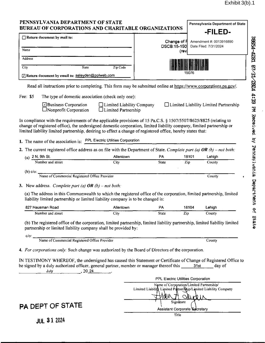| - | Certificate of Change: an amendment, effective as of July 31, 2024, to the Amended and Restated Articles of Incorporation of PPL Electric Utilities Corporation, effective as of October 31, 2013 |