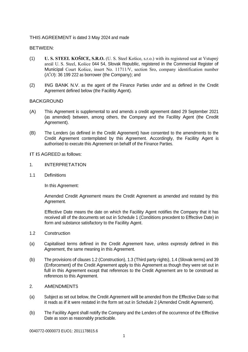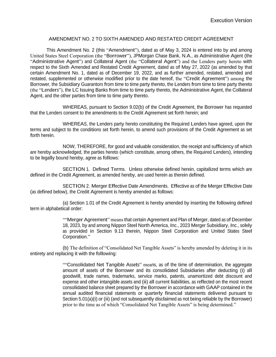 2 NOW, THEREFORE, for good and valuable consideration, the receipt and sufficiency of which are hereby acknowledged, the parties hereto, intending to be legally bound hereby, agree as follows: SECTION 1. Defined Terms. Unless otherwise defined herein, capitalized terms which are defined in the Credit Agreement, as amended hereby, are used herein as therein defined. SECTION 2. Effective Date Amendments and Consent. Effective as of the Amendment Effective Date (as defined below), (a) the Credit Agreement is hereby amended as follows: (i) Section 1.1 of the Credit Agreement is hereby amended by inserting the following defined term in alphabetical order: “Merger Agreement” means that certain Agreement and Plan of Merger, dated as of December 18, 2023, by and among Nippon Steel North America, Inc., 2023 Merger Subsidiary, Inc., solely as provided in Section 9.13 therein, Nippon Steel Corporation and the Parent Guarantor.” (ii) The definition of “Change of Control” is hereby amended by adding the following at the end of such definition: “Notwithstanding anything to the contrary in this definition, the consummation of the transactions contemplated by the Merger Agreement do not constitute a Change of Control.” (iii) Upon delivery of notice to the Facility Agent by the Borrower that the financial year end of the Borrower and Parent Guarantor (as applicable) shall be changed from December 31 to March 31, the definition of “Fiscal Year” shall be automatically amended by deleting it in its entirety and replacing it with the following: “Fiscal Year” means the period of April 1 to March 31 of each year.” (iv) Upon delivery of notice to the Facility Agent by the Borrower under Section 2(a)(iii) hereof, to the extent unaudited unconsolidated Financial Statements of the Borrower have not been delivered under Section 10.1(a)(iii)(A)(x) of the Credit Agreement, then Section 10.1(a)(iii)(A)(x) of the Credit Agreement shall be amended by deleting “(which shall not be later than the first quarter of the Fiscal Year ending 2025)” and replacing it with “(which shall not be later than the first quarter of the Fiscal Year ending March 31, 2026)”; and (b) the Majority Lenders party hereto hereby consent and agree to the Borrower’s entry into the PESA Amendment. SECTION 3. Merger Date Amendments. Effective as of the Merger Effective Date (as defined below), the Credit Agreement is hereby amended as follows: