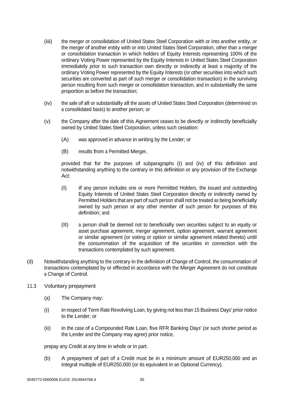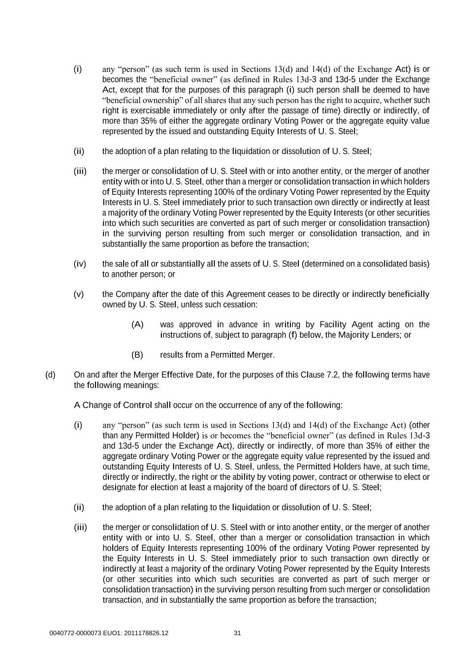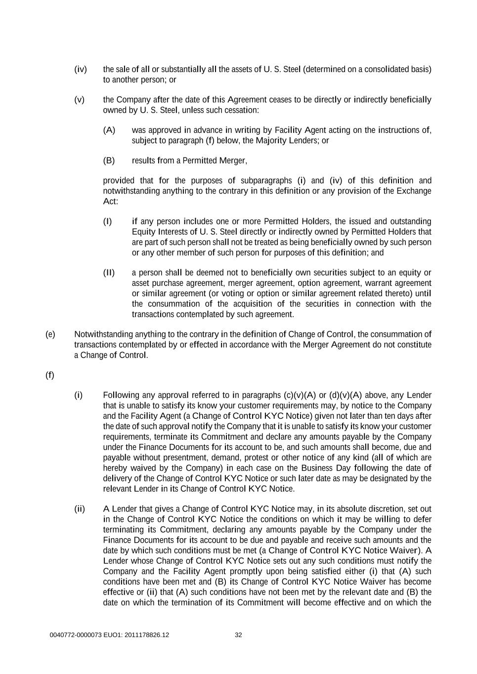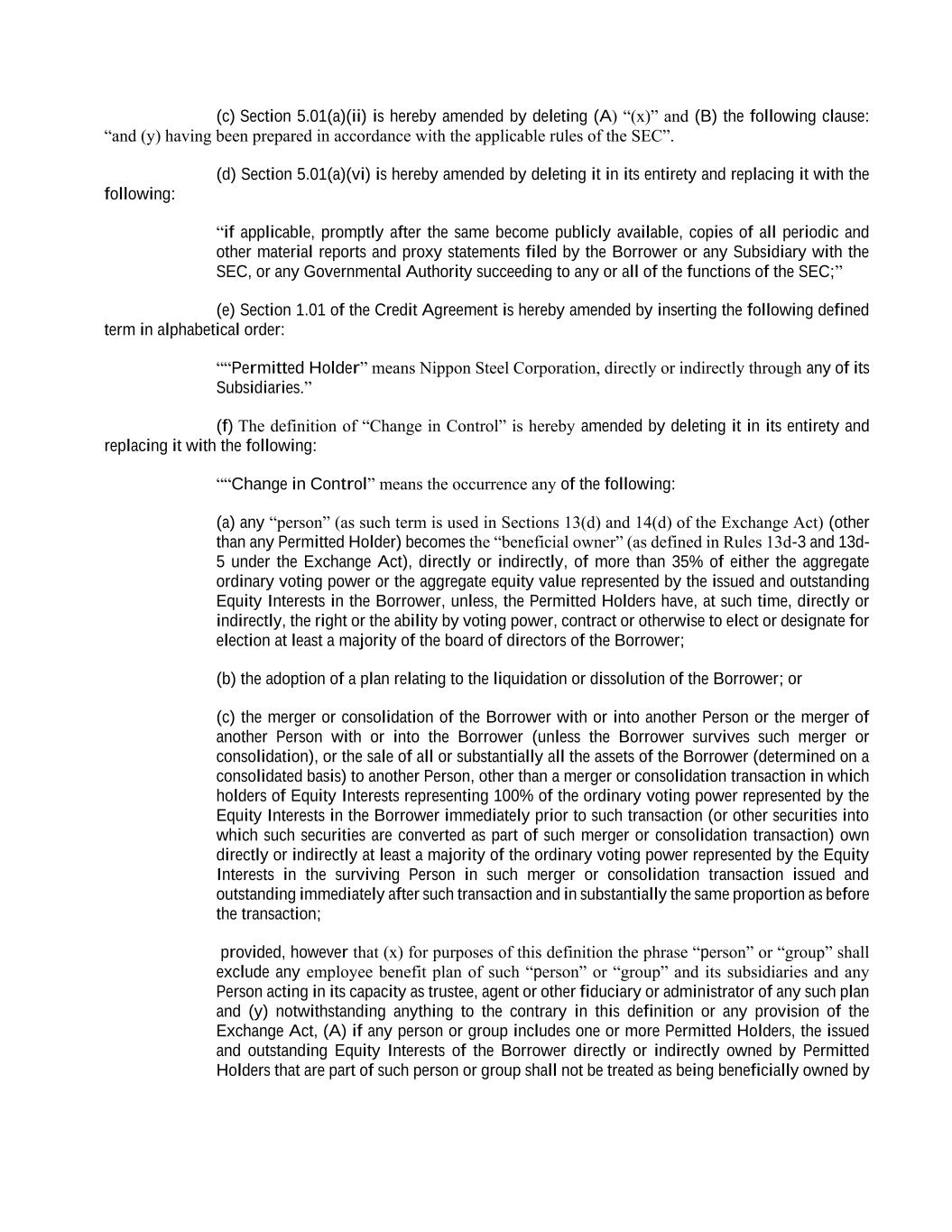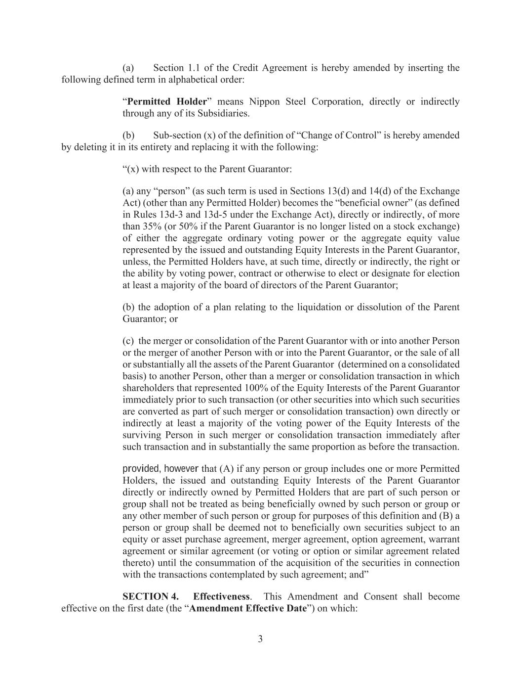 3 (a) Section 1.1 of the Credit Agreement is hereby amended by inserting the following defined term in alphabetical order: “Permitted Holder” means Nippon Steel Corporation, directly or indirectly through any of its Subsidiaries. (b) Sub-section (x) of the definition of “Change of Control” is hereby amended by deleting it in its entirety and replacing it with the following: “(x) with respect to the Parent Guarantor: (a) any “person” (as such term is used in Sections 13(d) and 14(d) of the Exchange Act) (other than any Permitted Holder) becomes the “beneficial owner” (as defined in Rules 13d-3 and 13d-5 under the Exchange Act), directly or indirectly, of more than 35% (or 50% if the Parent Guarantor is no longer listed on a stock exchange) of either the aggregate ordinary voting power or the aggregate equity value represented by the issued and outstanding Equity Interests in the Parent Guarantor, unless, the Permitted Holders have, at such time, directly or indirectly, the right or the ability by voting power, contract or otherwise to elect or designate for election at least a majority of the board of directors of the Parent Guarantor; (b) the adoption of a plan relating to the liquidation or dissolution of the Parent Guarantor; or (c) the merger or consolidation of the Parent Guarantor with or into another Person or the merger of another Person with or into the Parent Guarantor, or the sale of all or substantially all the assets of the Parent Guarantor (determined on a consolidated basis) to another Person, other than a merger or consolidation transaction in which shareholders that represented 100% of the Equity Interests of the Parent Guarantor immediately prior to such transaction (or other securities into which such securities are converted as part of such merger or consolidation transaction) own directly or indirectly at least a majority of the voting power of the Equity Interests of the surviving Person in such merger or consolidation transaction immediately after such transaction and in substantially the same proportion as before the transaction. provided, however that (A) if any person or group includes one or more Permitted Holders, the issued and outstanding Equity Interests of the Parent Guarantor directly or indirectly owned by Permitted Holders that are part of such person or group shall not be treated as being beneficially owned by such person or group or any other member of such person or group for purposes of this definition and (B) a person or group shall be deemed not to beneficially own securities subject to an equity or asset purchase agreement, merger agreement, option agreement, warrant agreement or similar agreement (or voting or option or similar agreement related thereto) until the consummation of the acquisition of the securities in connection with the transactions contemplated by such agreement; and” SECTION 4. Effectiveness. This Amendment and Consent shall become effective on the first date (the “Amendment Effective Date”) on which: