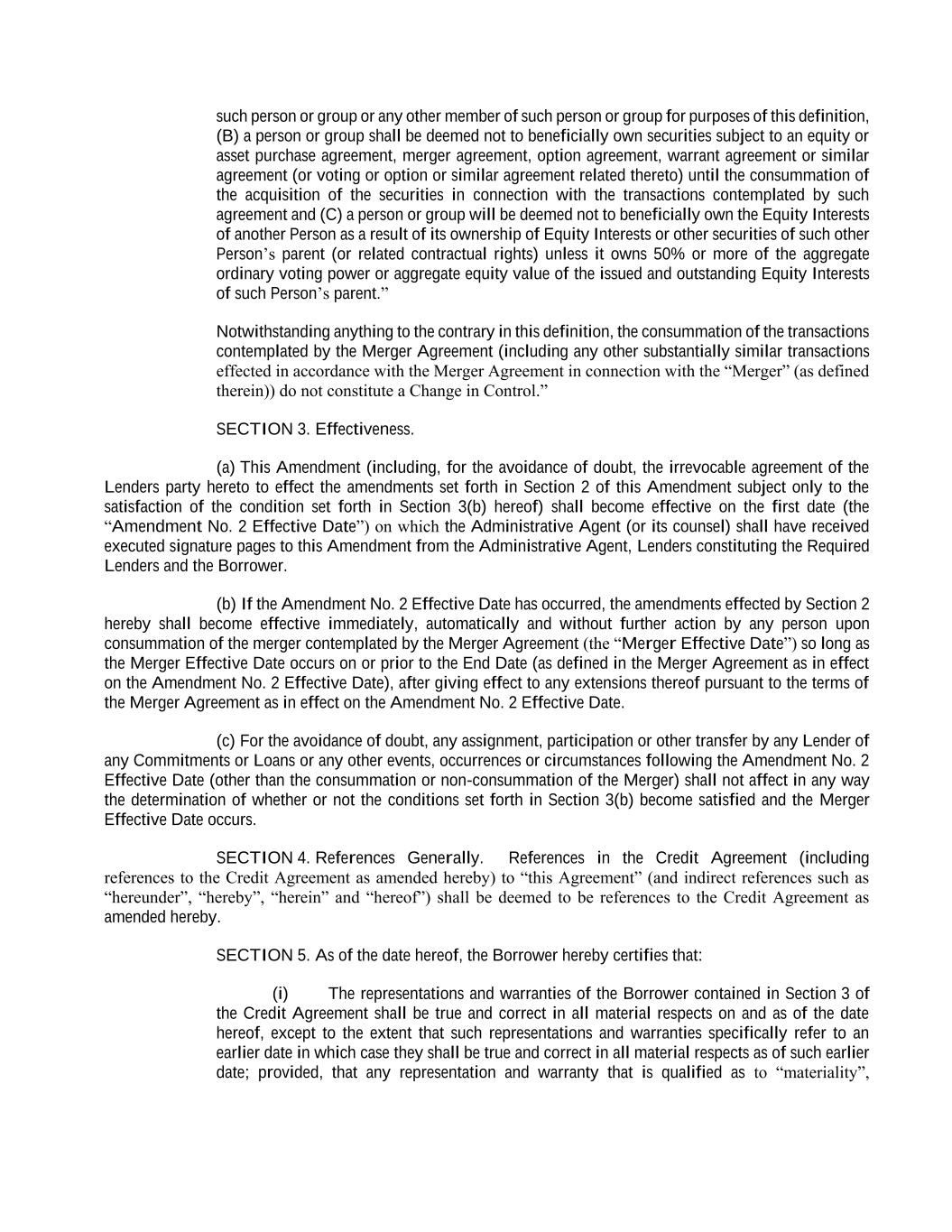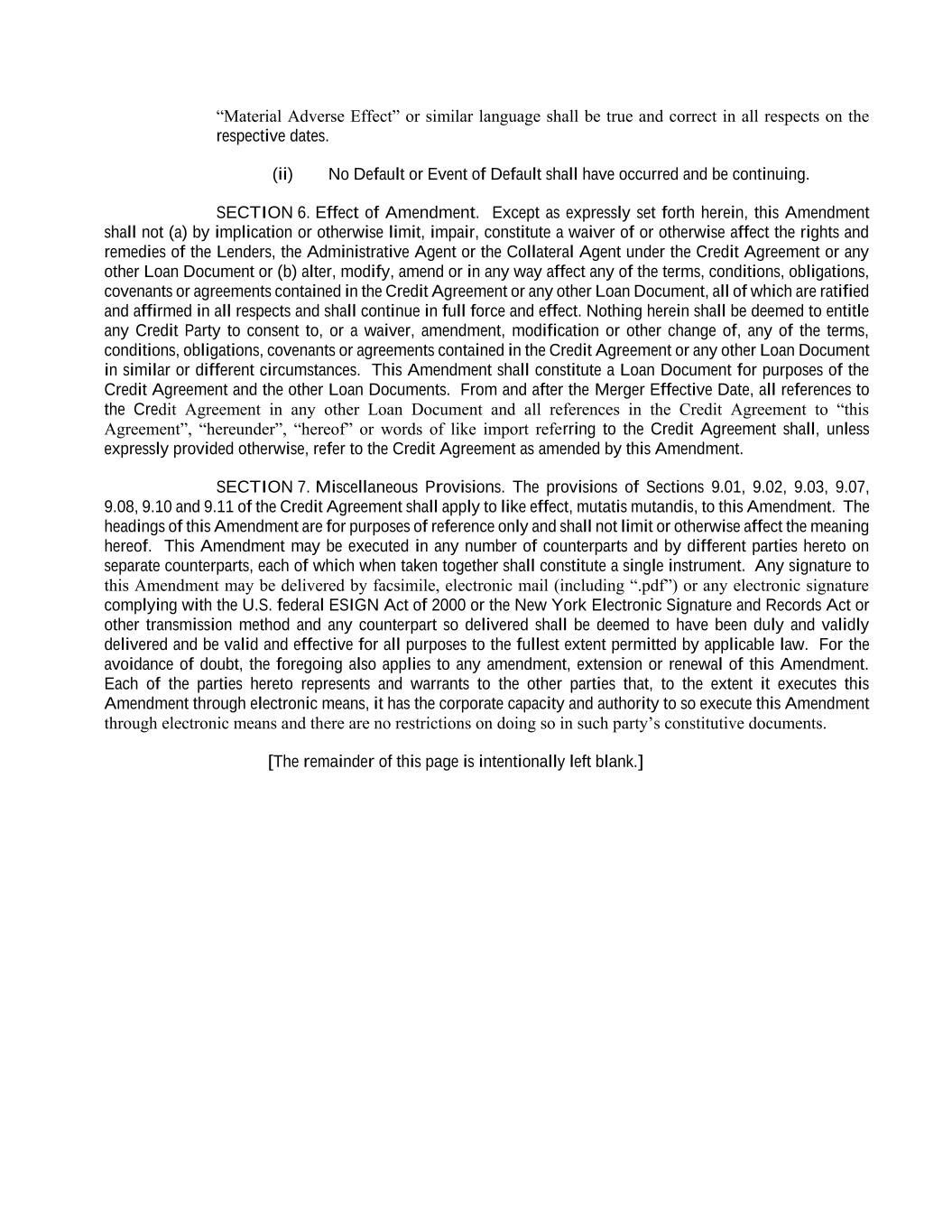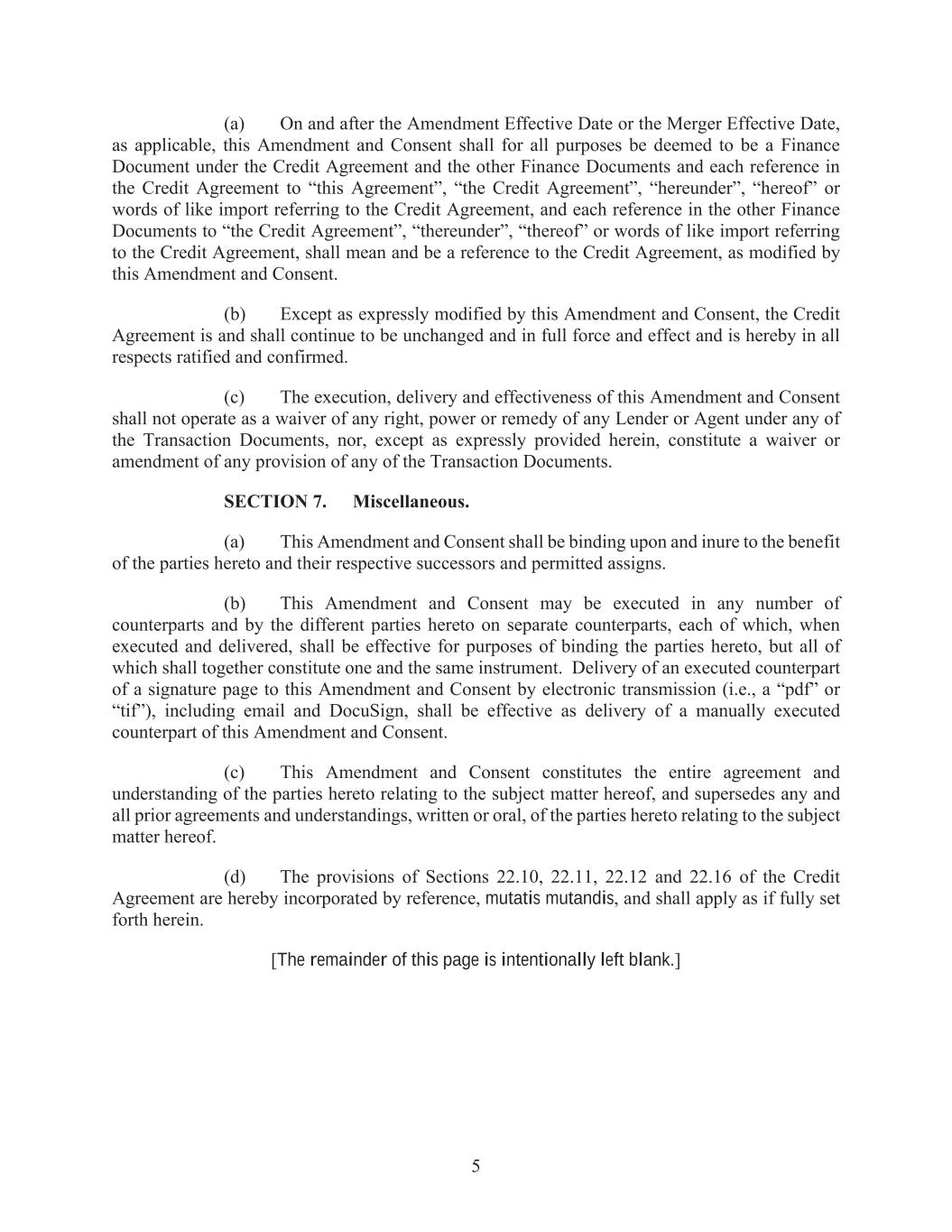 5 (a) On and after the Amendment Effective Date or the Merger Effective Date, as applicable, this Amendment and Consent shall for all purposes be deemed to be a Finance Document under the Credit Agreement and the other Finance Documents and each reference in the Credit Agreement to “this Agreement”, “the Credit Agreement”, “hereunder”, “hereof” or words of like import referring to the Credit Agreement, and each reference in the other Finance Documents to “the Credit Agreement”, “thereunder”, “thereof” or words of like import referring to the Credit Agreement, shall mean and be a reference to the Credit Agreement, as modified by this Amendment and Consent. (b) Except as expressly modified by this Amendment and Consent, the Credit Agreement is and shall continue to be unchanged and in full force and effect and is hereby in all respects ratified and confirmed. (c) The execution, delivery and effectiveness of this Amendment and Consent shall not operate as a waiver of any right, power or remedy of any Lender or Agent under any of the Transaction Documents, nor, except as expressly provided herein, constitute a waiver or amendment of any provision of any of the Transaction Documents. SECTION 7. Miscellaneous. (a) This Amendment and Consent shall be binding upon and inure to the benefit of the parties hereto and their respective successors and permitted assigns. (b) This Amendment and Consent may be executed in any number of counterparts and by the different parties hereto on separate counterparts, each of which, when executed and delivered, shall be effective for purposes of binding the parties hereto, but all of which shall together constitute one and the same instrument. Delivery of an executed counterpart of a signature page to this Amendment and Consent by electronic transmission (i.e., a “pdf” or “tif”), including email and DocuSign, shall be effective as delivery of a manually executed counterpart of this Amendment and Consent. (c) This Amendment and Consent constitutes the entire agreement and understanding of the parties hereto relating to the subject matter hereof, and supersedes any and all prior agreements and understandings, written or oral, of the parties hereto relating to the subject matter hereof. (d) The provisions of Sections 22.10, 22.11, 22.12 and 22.16 of the Credit Agreement are hereby incorporated by reference, mutatis mutandis, and shall apply as if fully set forth herein. [The remainder of this page is intentionally left blank.]