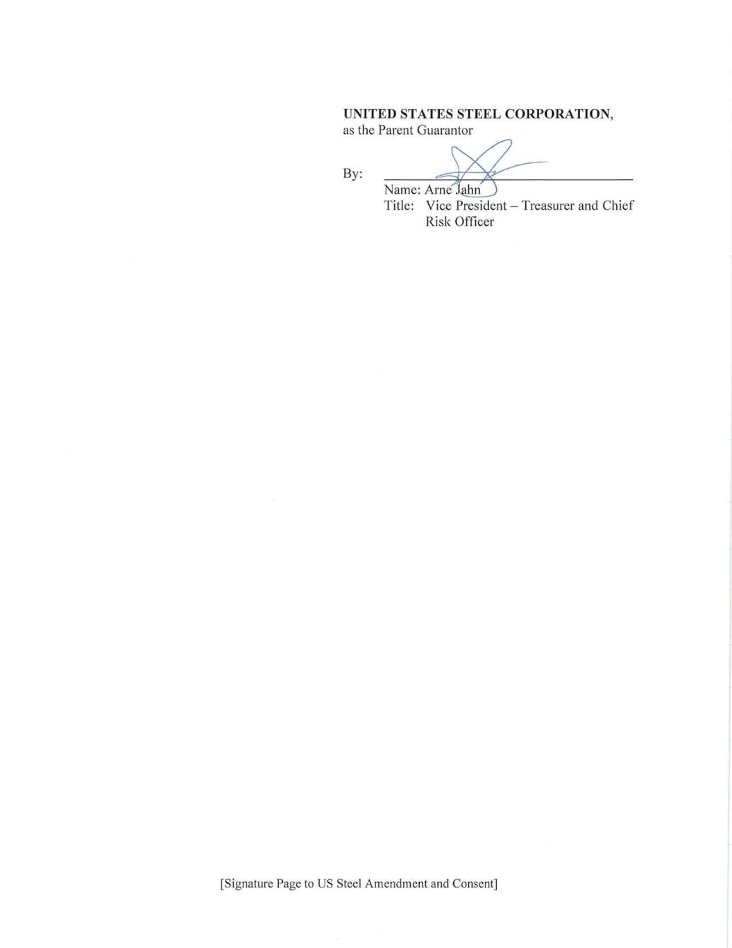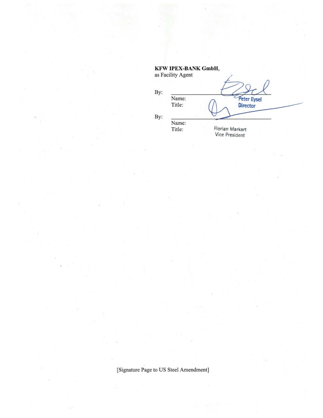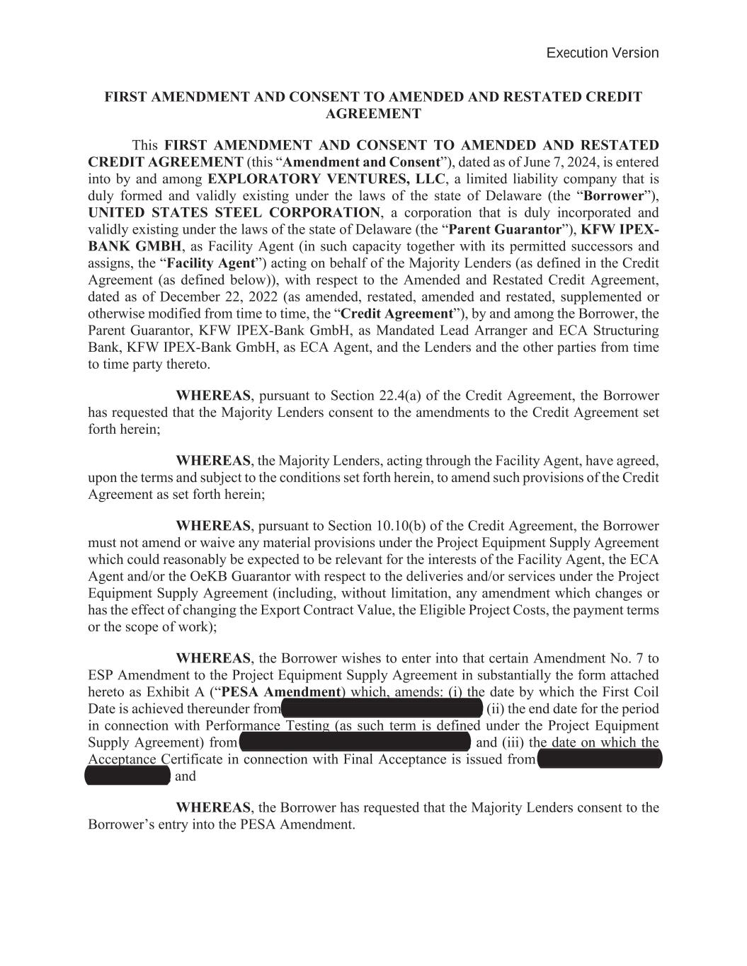 Execution Version FIRST AMENDMENT AND CONSENT TO AMENDED AND RESTATED CREDIT AGREEMENT This FIRST AMENDMENT AND CONSENT TO AMENDED AND RESTATED CREDIT AGREEMENT (this “Amendment and Consent”), dated as of June 7, 2024, is entered into by and among EXPLORATORY VENTURES, LLC, a limited liability company that is duly formed and validly existing under the laws of the state of Delaware (the “Borrower”), UNITED STATES STEEL CORPORATION, a corporation that is duly incorporated and validly existing under the laws of the state of Delaware (the “Parent Guarantor”), KFW IPEX- BANK GMBH, as Facility Agent (in such capacity together with its permitted successors and assigns, the “Facility Agent”) acting on behalf of the Majority Lenders (as defined in the Credit Agreement (as defined below)), with respect to the Amended and Restated Credit Agreement, dated as of December 22, 2022 (as amended, restated, amended and restated, supplemented or otherwise modified from time to time, the “Credit Agreement”), by and among the Borrower, the Parent Guarantor, KFW IPEX-Bank GmbH, as Mandated Lead Arranger and ECA Structuring Bank, KFW IPEX-Bank GmbH, as ECA Agent, and the Lenders and the other parties from time to time party thereto. WHEREAS, pursuant to Section 22.4(a) of the Credit Agreement, the Borrower has requested that the Majority Lenders consent to the amendments to the Credit Agreement set forth herein; WHEREAS, the Majority Lenders, acting through the Facility Agent, have agreed, upon the terms and subject to the conditions set forth herein, to amend such provisions of the Credit Agreement as set forth herein; WHEREAS, pursuant to Section 10.10(b) of the Credit Agreement, the Borrower must not amend or waive any material provisions under the Project Equipment Supply Agreement which could reasonably be expected to be relevant for the interests of the Facility Agent, the ECA Agent and/or the OeKB Guarantor with respect to the deliveries and/or services under the Project Equipment Supply Agreement (including, without limitation, any amendment which changes or has the effect of changing the Export Contract Value, the Eligible Project Costs, the payment terms or the scope of work); WHEREAS, the Borrower wishes to enter into that certain Amendment No. 7 to ESP Amendment to the Project Equipment Supply Agreement in substantially the form attached hereto as Exhibit A (“PESA Amendment) which, amends: (i) the date by which the First Coil Date is achieved thereunder from July 15, 2024 to January 15, 2025, (ii) the end date for the period in connection with Performance Testing (as such term is defined under the Project Equipment Supply Agreement) from November 1, 2024 until May 1, 2025, and (iii) the date on which the Acceptance Certificate in connection with Final Acceptance is issued from January 31, 2025 to July 31, 2025; and WHEREAS, the Borrower has requested that the Majority Lenders consent to the Borrower’s entry into the PESA Amendment.