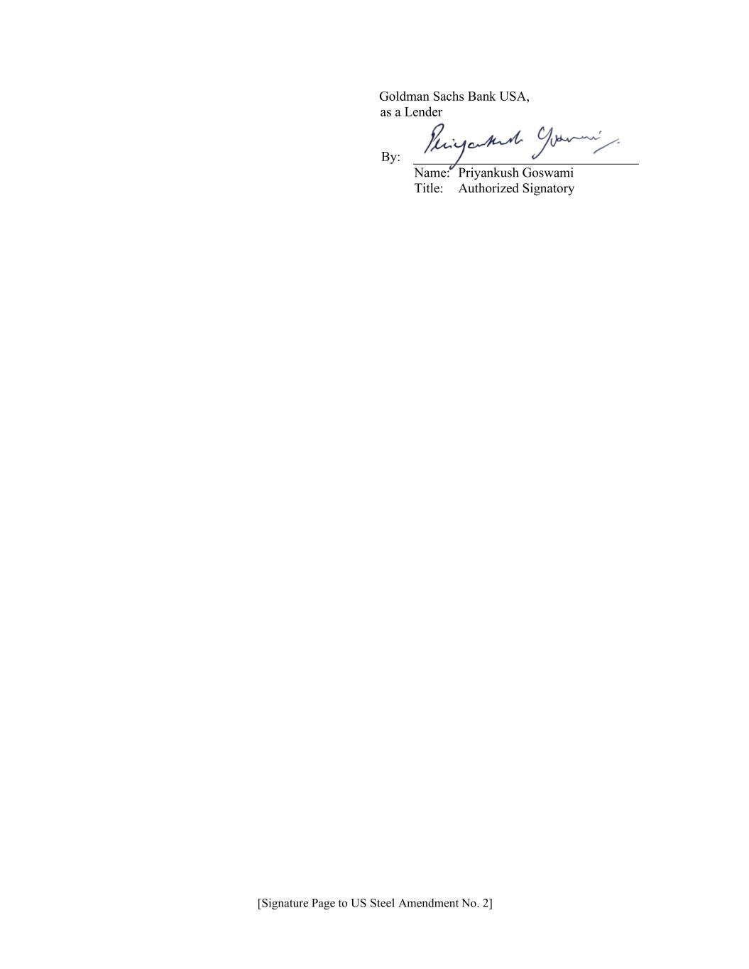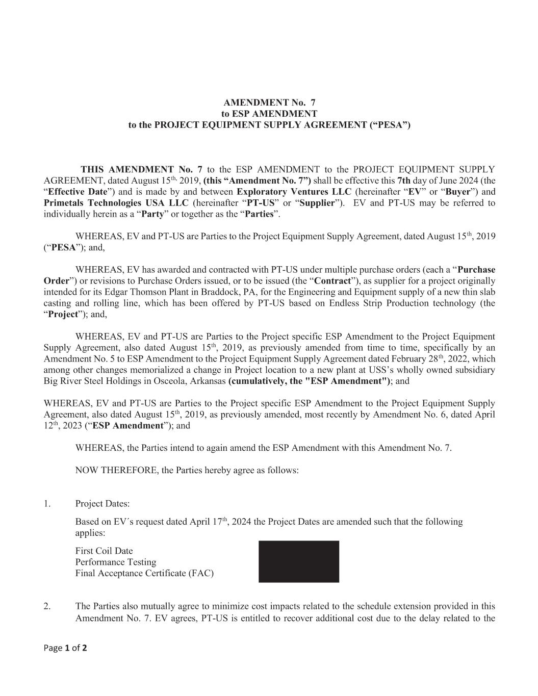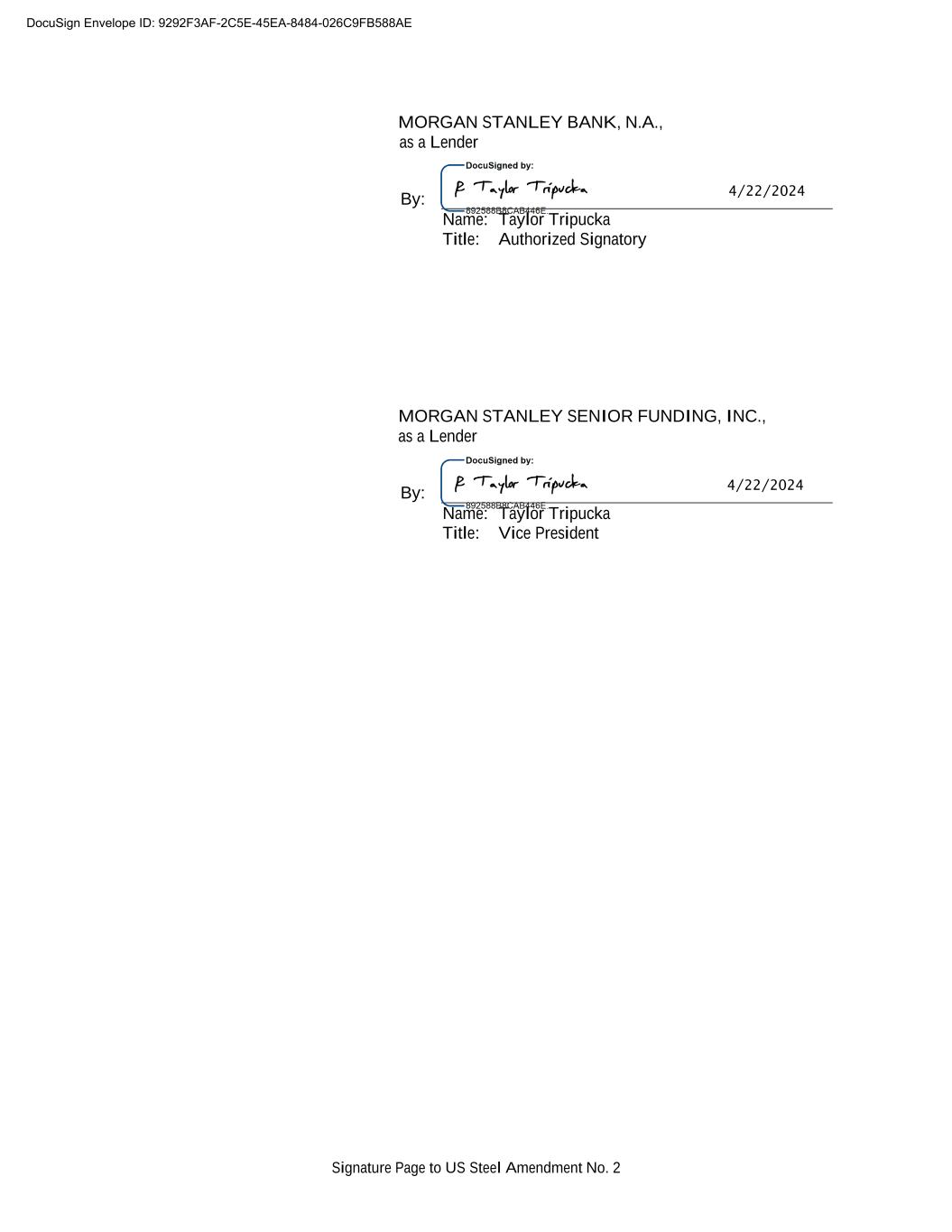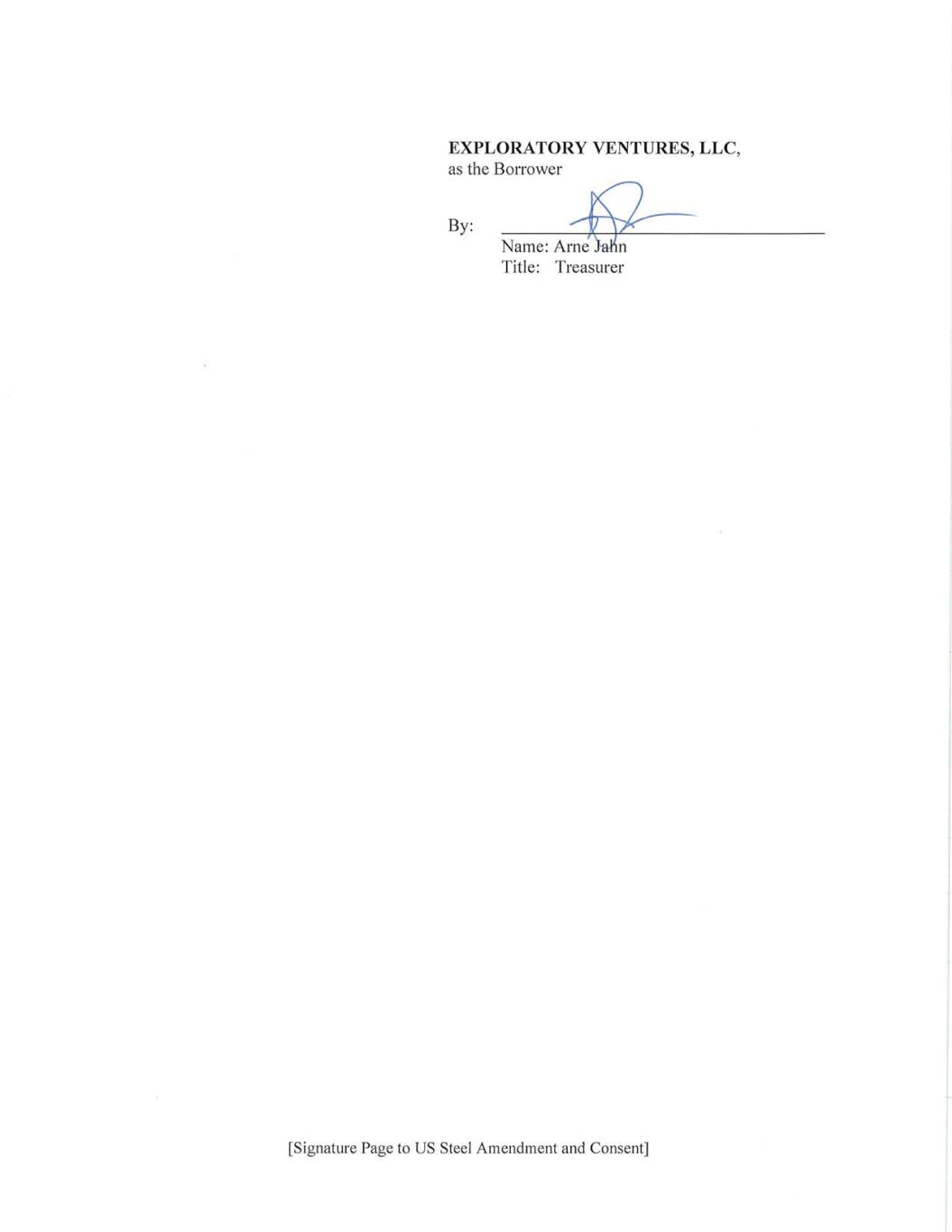 Execution Version FIRST AMENDMENT AND CONSENT TO AMENDED AND RESTATED CREDIT AGREEMENT This FIRST AMENDMENT AND CONSENT TO AMENDED AND RESTATED CREDIT AGREEMENT (this “Amendment and Consent”), dated as of June 7, 2024, is entered into by and among EXPLORATORY VENTURES, LLC, a limited liability company that is duly formed and validly existing under the laws of the state of Delaware (the “Borrower”), UNITED STATES STEEL CORPORATION, a corporation that is duly incorporated and validly existing under the laws of the state of Delaware (the “Parent Guarantor”), KFW IPEX- BANK GMBH, as Facility Agent (in such capacity together with its permitted successors and assigns, the “Facility Agent”) acting on behalf of the Majority Lenders (as defined in the Credit Agreement (as defined below)), with respect to the Amended and Restated Credit Agreement, dated as of December 22, 2022 (as amended, restated, amended and restated, supplemented or otherwise modified from time to time, the “Credit Agreement”), by and among the Borrower, the Parent Guarantor, KFW IPEX-Bank GmbH, as Mandated Lead Arranger and ECA Structuring Bank, KFW IPEX-Bank GmbH, as ECA Agent, and the Lenders and the other parties from time to time party thereto. WHEREAS, pursuant to Section 22.4(a) of the Credit Agreement, the Borrower has requested that the Majority Lenders consent to the amendments to the Credit Agreement set forth herein; WHEREAS, the Majority Lenders, acting through the Facility Agent, have agreed, upon the terms and subject to the conditions set forth herein, to amend such provisions of the Credit Agreement as set forth herein; WHEREAS, pursuant to Section 10.10(b) of the Credit Agreement, the Borrower must not amend or waive any material provisions under the Project Equipment Supply Agreement which could reasonably be expected to be relevant for the interests of the Facility Agent, the ECA Agent and/or the OeKB Guarantor with respect to the deliveries and/or services under the Project Equipment Supply Agreement (including, without limitation, any amendment which changes or has the effect of changing the Export Contract Value, the Eligible Project Costs, the payment terms or the scope of work); WHEREAS, the Borrower wishes to enter into that certain Amendment No. 7 to ESP Amendment to the Project Equipment Supply Agreement in substantially the form attached hereto as Exhibit A (“PESA Amendment) which, amends: (i) the date by which the First Coil Date is achieved thereunder from July 15, 2024 to January 15, 2025, (ii) the end date for the period in connection with Performance Testing (as such term is defined under the Project Equipment Supply Agreement) from November 1, 2024 until May 1, 2025, and (iii) the date on which the Acceptance Certificate in connection with Final Acceptance is issued from January 31, 2025 to July 31, 2025; and WHEREAS, the Borrower has requested that the Majority Lenders consent to the Borrower’s entry into the PESA Amendment.
