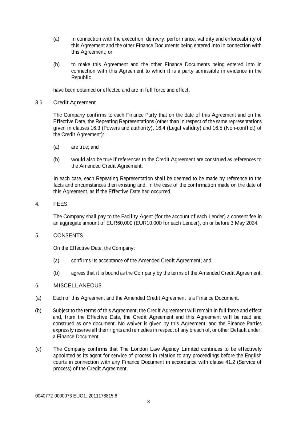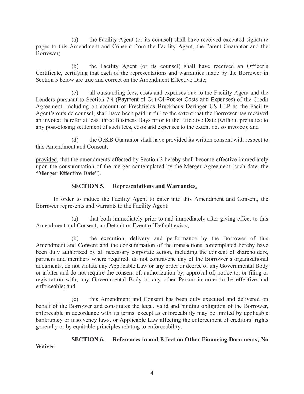 4 (a) the Facility Agent (or its counsel) shall have received executed signature pages to this Amendment and Consent from the Facility Agent, the Parent Guarantor and the Borrower; (b) the Facility Agent (or its counsel) shall have received an Officer’s Certificate, certifying that each of the representations and warranties made by the Borrower in Section 5 below are true and correct on the Amendment Effective Date; (c) all outstanding fees, costs and expenses due to the Facility Agent and the Lenders pursuant to Section 7.4 (Payment of Out-Of-Pocket Costs and Expenses) of the Credit Agreement, including on account of Freshfields Bruckhaus Deringer US LLP as the Facility Agent’s outside counsel, shall have been paid in full to the extent that the Borrower has received an invoice therefor at least three Business Days prior to the Effective Date (without prejudice to any post-closing settlement of such fees, costs and expenses to the extent not so invoice); and (d) the OeKB Guarantor shall have provided its written consent with respect to this Amendment and Consent; provided, that the amendments effected by Section 3 hereby shall become effective immediately upon the consummation of the merger contemplated by the Merger Agreement (such date, the “Merger Effective Date”). SECTION 5. Representations and Warranties. In order to induce the Facility Agent to enter into this Amendment and Consent, the Borrower represents and warrants to the Facility Agent: (a) that both immediately prior to and immediately after giving effect to this Amendment and Consent, no Default or Event of Default exists; (b) the execution, delivery and performance by the Borrower of this Amendment and Consent and the consummation of the transactions contemplated hereby have been duly authorized by all necessary corporate action, including the consent of shareholders, partners and members where required, do not contravene any of the Borrower’s organizational documents, do not violate any Applicable Law or any order or decree of any Governmental Body or arbiter and do not require the consent of, authorization by, approval of, notice to, or filing or registration with, any Governmental Body or any other Person in order to be effective and enforceable; and (c) this Amendment and Consent has been duly executed and delivered on behalf of the Borrower and constitutes the legal, valid and binding obligation of the Borrower, enforceable in accordance with its terms, except as enforceability may be limited by applicable bankruptcy or insolvency laws, or Applicable Law affecting the enforcement of creditors’ rights generally or by equitable principles relating to enforceability. SECTION 6. References to and Effect on Other Financing Documents; No Waiver.