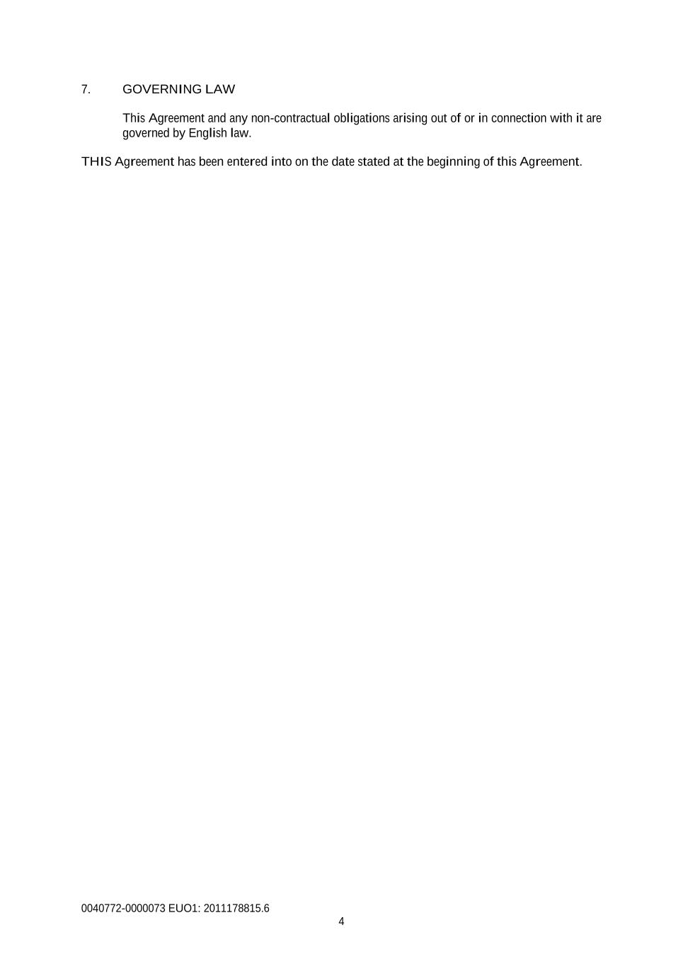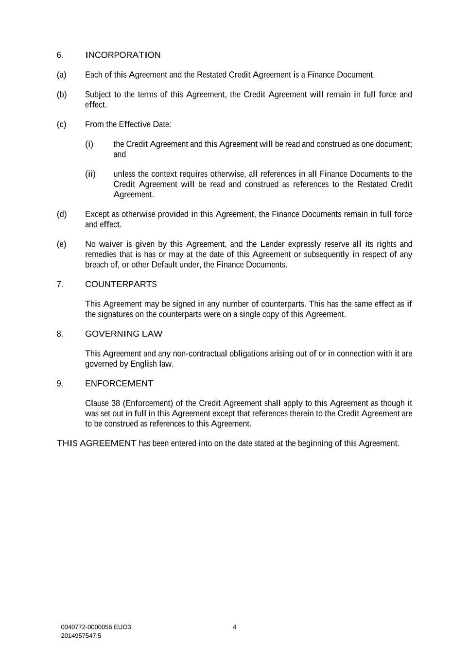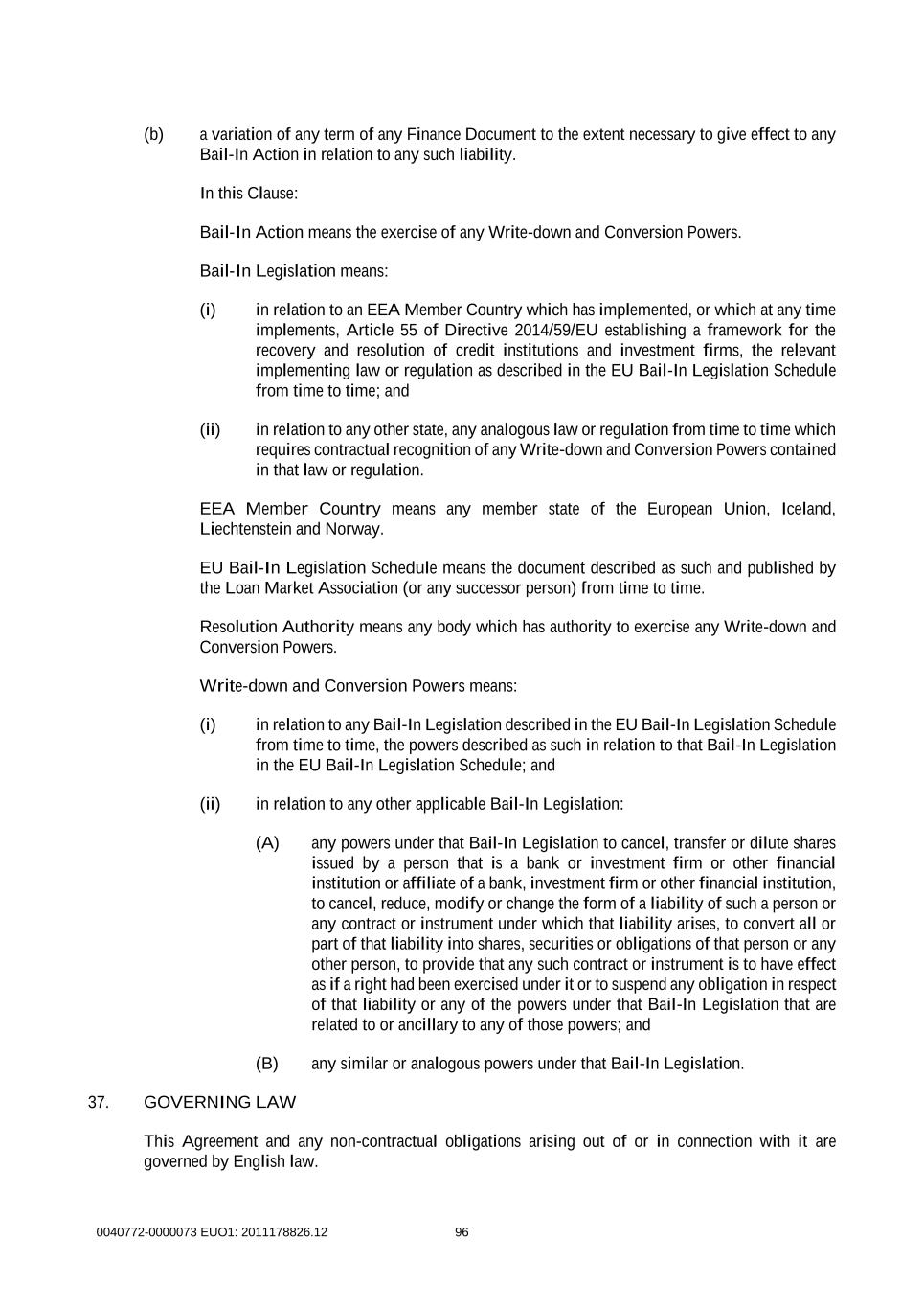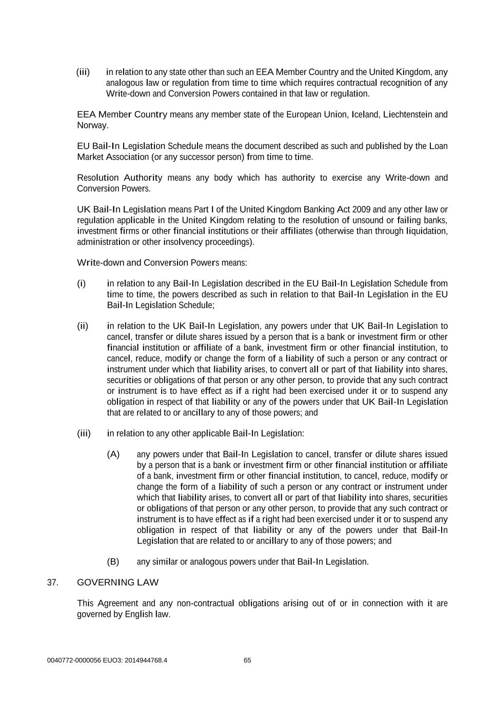 0040772-0000056 EUO3: 2014944768.4 65 (iii) in relation to any state other than such an EEA Member Country and the United Kingdom, any analogous law or regulation from time to time which requires contractual recognition of any Write-down and Conversion Powers contained in that law or regulation. EEA Member Country means any member state of the European Union, Iceland, Liechtenstein and Norway. EU Bail-In Legislation Schedule means the document described as such and published by the Loan Market Association (or any successor person) from time to time. Resolution Authority means any body which has authority to exercise any Write-down and Conversion Powers. UK Bail-In Legislation means Part I of the United Kingdom Banking Act 2009 and any other law or regulation applicable in the United Kingdom relating to the resolution of unsound or failing banks, investment firms or other financial institutions or their affiliates (otherwise than through liquidation, administration or other insolvency proceedings). Write-down and Conversion Powers means: (i) in relation to any Bail-In Legislation described in the EU Bail-In Legislation Schedule from time to time, the powers described as such in relation to that Bail-In Legislation in the EU Bail-In Legislation Schedule; (ii) in relation to the UK Bail-In Legislation, any powers under that UK Bail-In Legislation to cancel, transfer or dilute shares issued by a person that is a bank or investment firm or other financial institution or affiliate of a bank, investment firm or other financial institution, to cancel, reduce, modify or change the form of a liability of such a person or any contract or instrument under which that liability arises, to convert all or part of that liability into shares, securities or obligations of that person or any other person, to provide that any such contract or instrument is to have effect as if a right had been exercised under it or to suspend any obligation in respect of that liability or any of the powers under that UK Bail-In Legislation that are related to or ancillary to any of those powers; and (iii) in relation to any other applicable Bail-In Legislation: (A) any powers under that Bail-In Legislation to cancel, transfer or dilute shares issued by a person that is a bank or investment firm or other financial institution or affiliate of a bank, investment firm or other financial institution, to cancel, reduce, modify or change the form of a liability of such a person or any contract or instrument under which that liability arises, to convert all or part of that liability into shares, securities or obligations of that person or any other person, to provide that any such contract or instrument is to have effect as if a right had been exercised under it or to suspend any obligation in respect of that liability or any of the powers under that Bail-In Legislation that are related to or ancillary to any of those powers; and (B) any similar or analogous powers under that Bail-In Legislation. 37. GOVERNING LAW This Agreement and any non-contractual obligations arising out of or in connection with it are governed by English law.