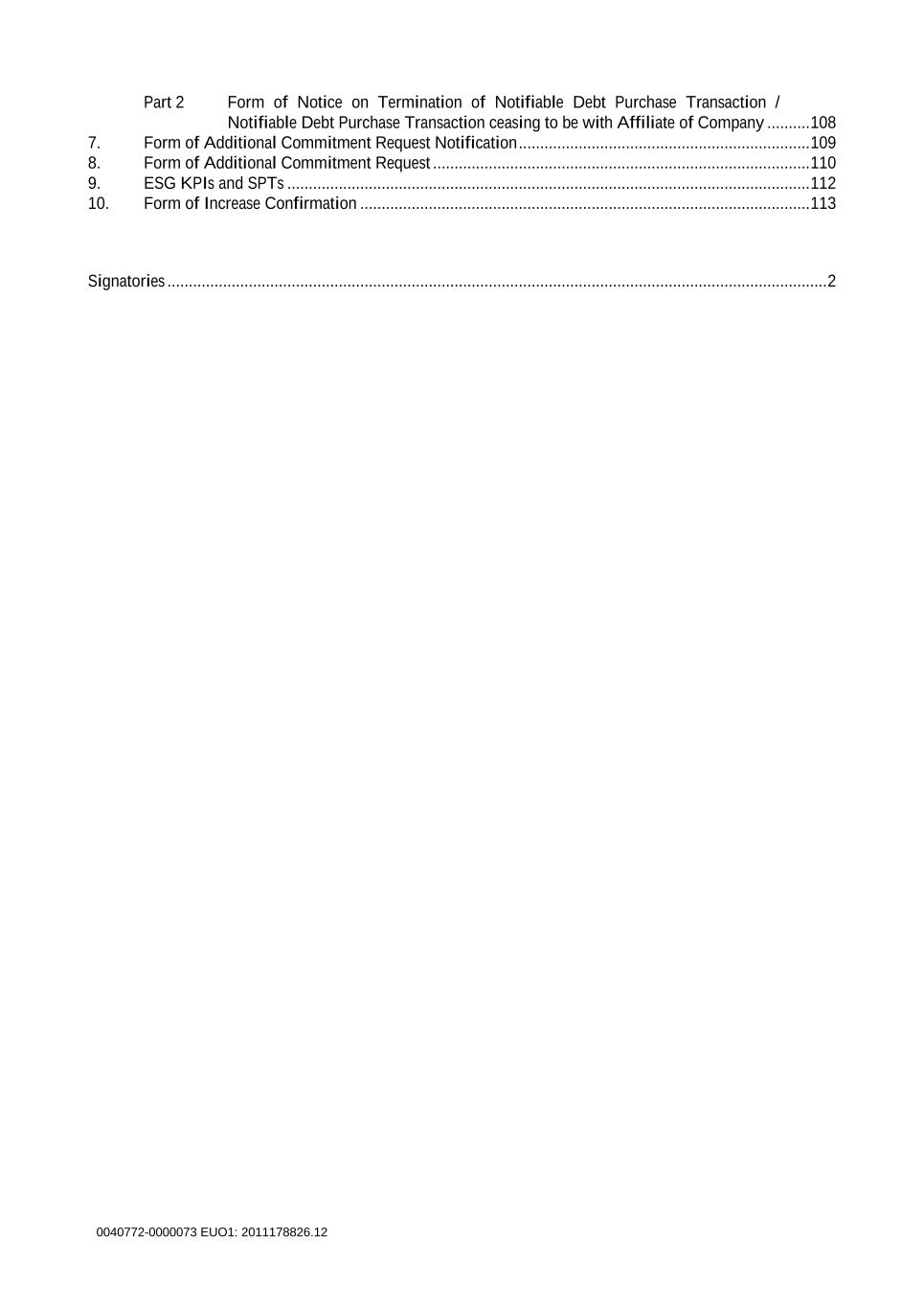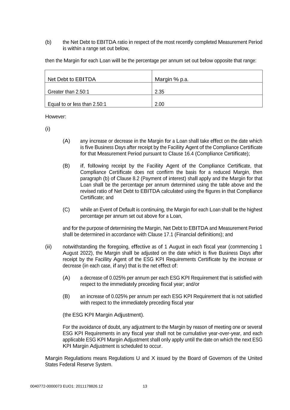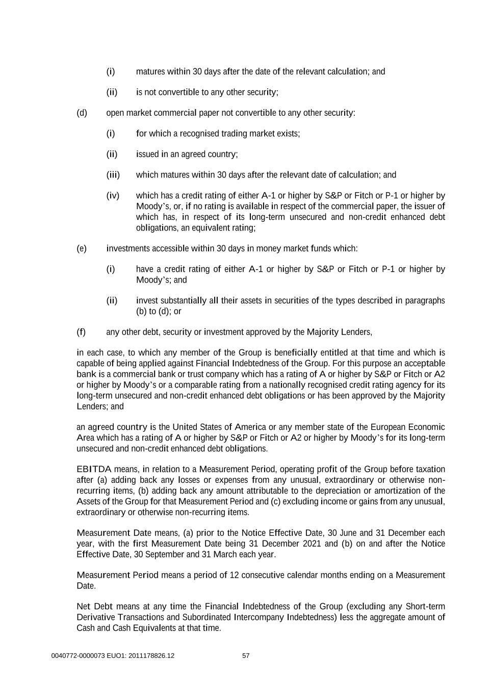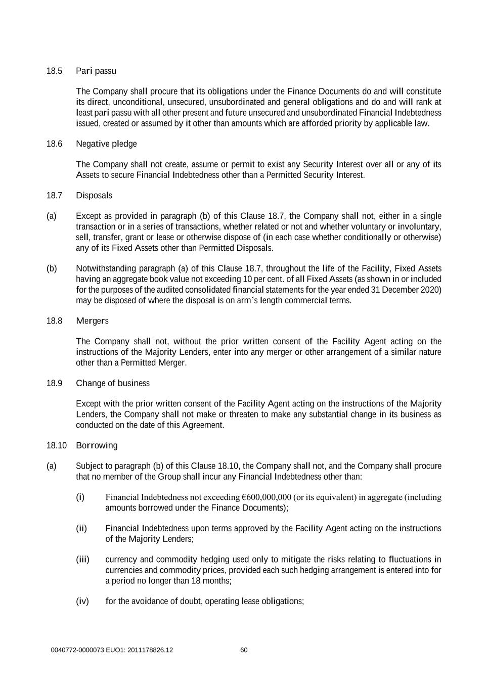 0040772-0000056 EUO3: 2014944768.4 51 commercial terms; provided, however, that in no case shall the Company be permitted to dispose of more than 50 per cent of all Fixed Assets (as shown in or included for purpose of the financial statement of the Company for the six-month period ended 30 June 2021). 21.8 Mergers The Company shall not, without the prior consent of the Lender in writing, enter into any merger or other arrangement of a similar nature other than a Permitted Merger. 21.9 Change of business Except with the prior consent of the Lender in writing, the Company shall not make or threaten to make any substantial change in its business as conducted on the date of this Agreement. 21.10 Environmental compliance Except to the extent disclosed in writing to the Lender, the Company shall comply with applicable Environmental Law except where failure to do so would not reasonably be expected to have a material adverse effect on the ability of the Company to perform its obligations under the Finance Documents. For this purpose, Environmental Law means: (a) all environmental authorisations applicable to the Company; and (b) all other applicable environmental laws, rules and regulations concerning the protection of human health or the environment or the transportation of any substance capable of causing harm to man or any other living organism or the environment or public health or welfare, including, without limitation, hazardous, toxic, radioactive or dangerous waste. 21.11 Lending and Borrowing (a) Subject to paragraph (b) below, the Company shall not, and the Company shall procure that no member of the Group shall incur any Financial Indebtedness other than: (i) Financial Indebtedness not exceeding EUR600,000,000 (or its equivalent) in aggregate (including amounts borrowed under the Finance Documents); (ii) Financial Indebtedness upon terms approved by the Lender; (iii) currency and commodity hedging used only to mitigate the risks relating to fluctuations in currencies and commodity prices, provided each such hedging arrangement is entered into for a period no longer than 18 months; (iv) for the avoidance of doubt, operating lease obligations; (v) for the avoidance of doubt, trade payables and other contractual obligations to suppliers and customers in the ordinary course of trading; (vi) debt subordinated to the Loans under subordination agreements acceptable to the Lender; and (vii) any refinancing of any of the foregoing up to the same principal amount. (b) The obligation under paragraph (a) above shall apply only until the Company delivers to the Facility Agent under, and as defined in, the Syndicated Facility Agreement the first Compliance Certificate (as defined in the Syndicated Facility Agreement) in accordance with