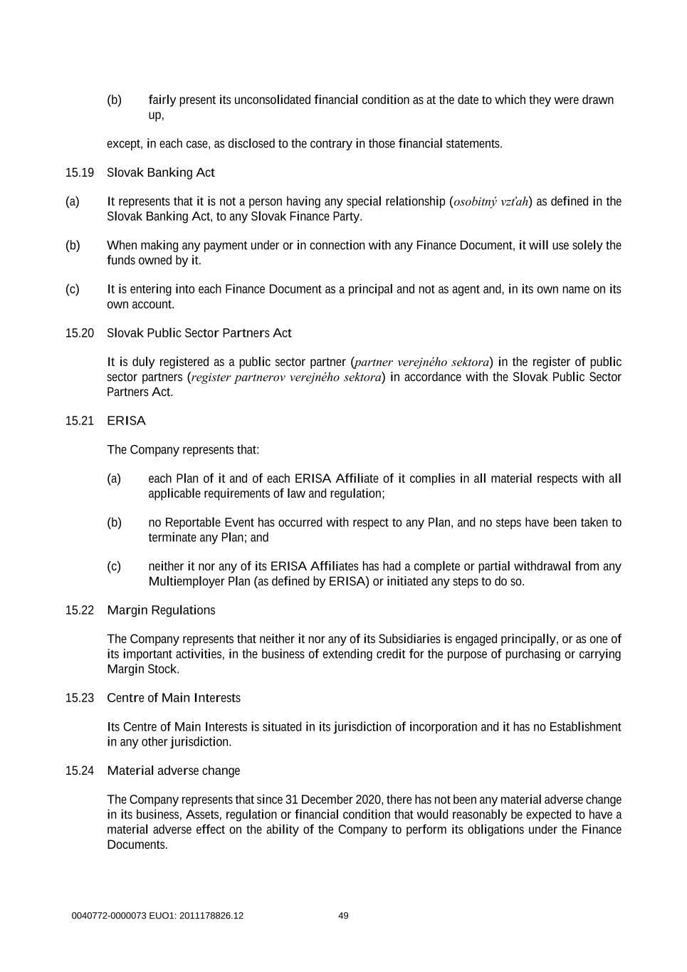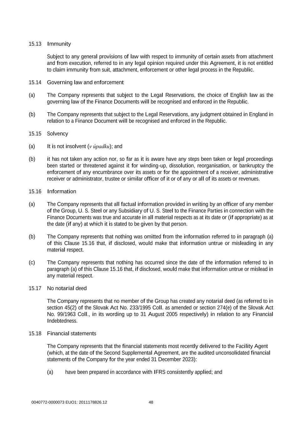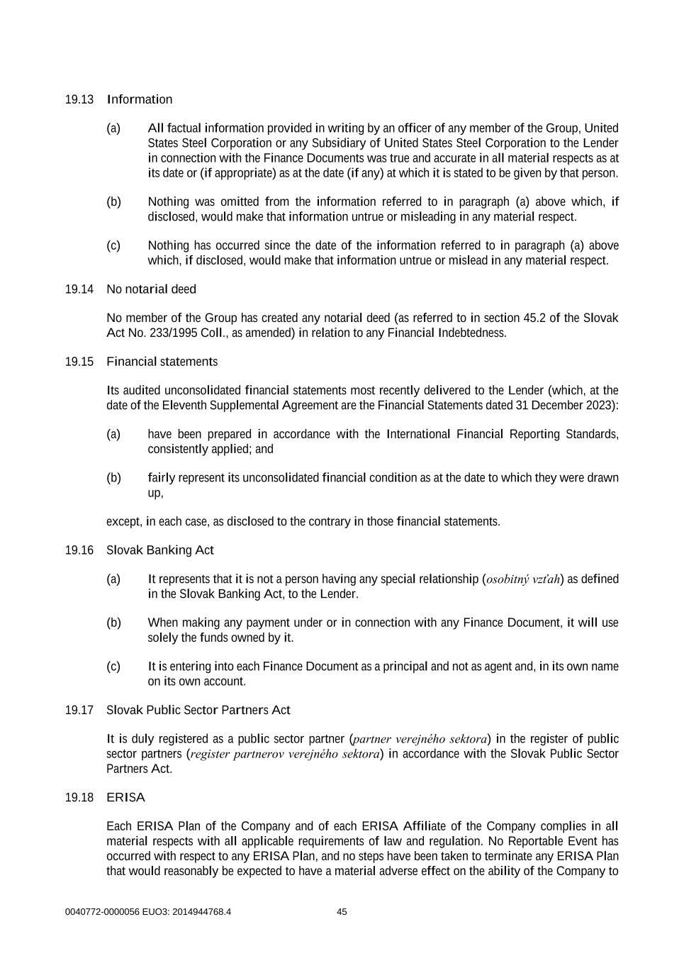 0040772-0000056 EUO3: 2014944768.4 45 19.13 Information (a) All factual information provided in writing by an officer of any member of the Group, United States Steel Corporation or any Subsidiary of United States Steel Corporation to the Lender in connection with the Finance Documents was true and accurate in all material respects as at its date or (if appropriate) as at the date (if any) at which it is stated to be given by that person. (b) Nothing was omitted from the information referred to in paragraph (a) above which, if disclosed, would make that information untrue or misleading in any material respect. (c) Nothing has occurred since the date of the information referred to in paragraph (a) above which, if disclosed, would make that information untrue or mislead in any material respect. 19.14 No notarial deed No member of the Group has created any notarial deed (as referred to in section 45.2 of the Slovak Act No. 233/1995 Coll., as amended) in relation to any Financial Indebtedness. 19.15 Financial statements Its audited unconsolidated financial statements most recently delivered to the Lender (which, at the date of the Eleventh Supplemental Agreement are the Financial Statements dated 31 December 2023): (a) have been prepared in accordance with the International Financial Reporting Standards, consistently applied; and (b) fairly represent its unconsolidated financial condition as at the date to which they were drawn up, except, in each case, as disclosed to the contrary in those financial statements. 19.16 Slovak Banking Act (a) It represents that it is not a person having any special relationship (osobitný vzťah) as defined in the Slovak Banking Act, to the Lender. (b) When making any payment under or in connection with any Finance Document, it will use solely the funds owned by it. (c) It is entering into each Finance Document as a principal and not as agent and, in its own name on its own account. 19.17 Slovak Public Sector Partners Act It is duly registered as a public sector partner (partner verejného sektora) in the register of public sector partners (register partnerov verejného sektora) in accordance with the Slovak Public Sector Partners Act. 19.18 ERISA Each ERISA Plan of the Company and of each ERISA Affiliate of the Company complies in all material respects with all applicable requirements of law and regulation. No Reportable Event has occurred with respect to any ERISA Plan, and no steps have been taken to terminate any ERISA Plan that would reasonably be expected to have a material adverse effect on the ability of the Company to