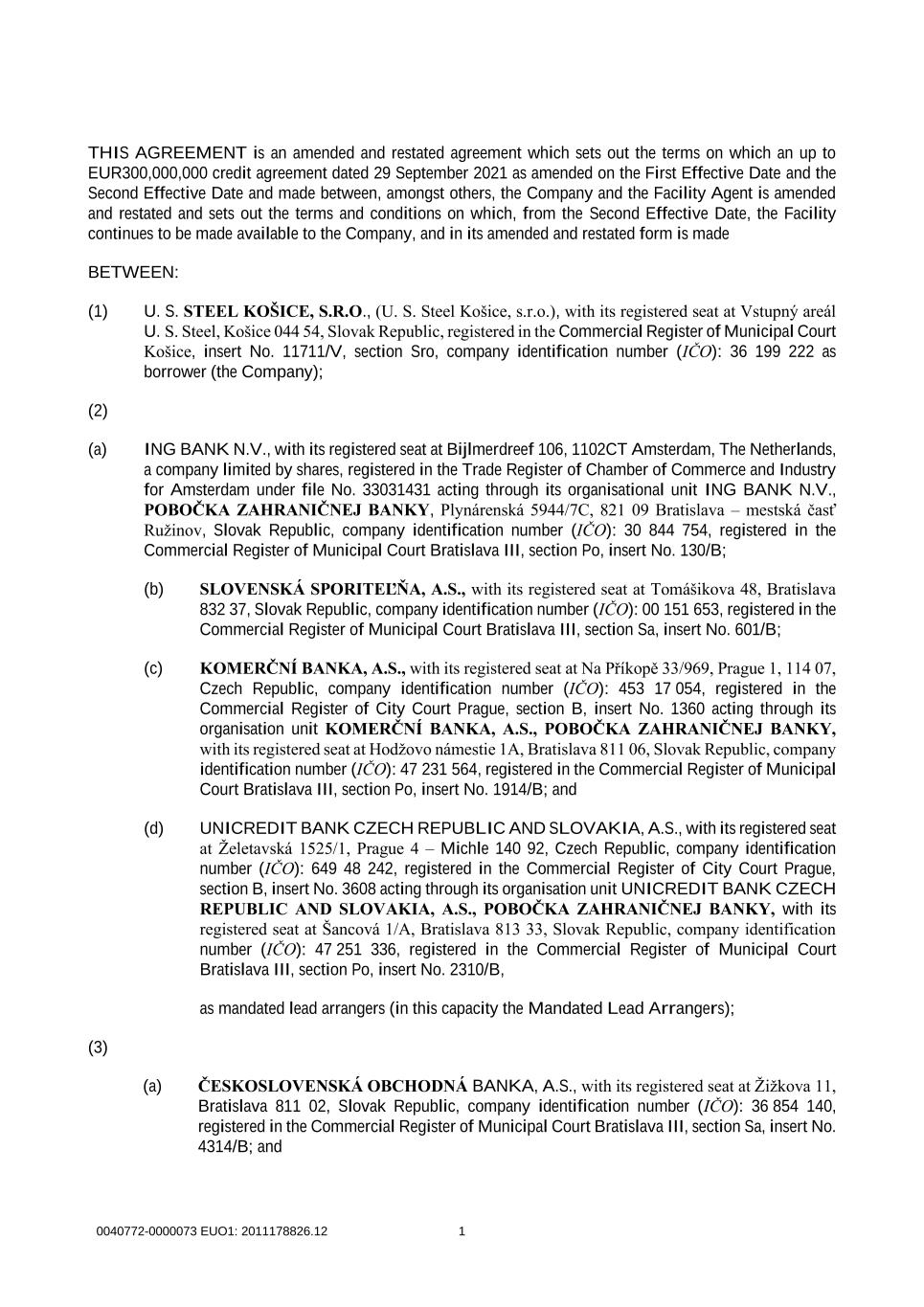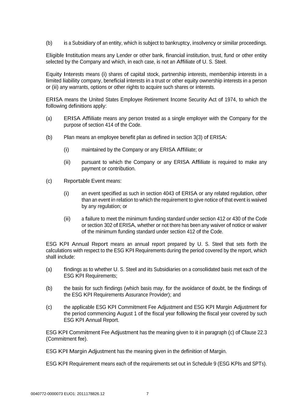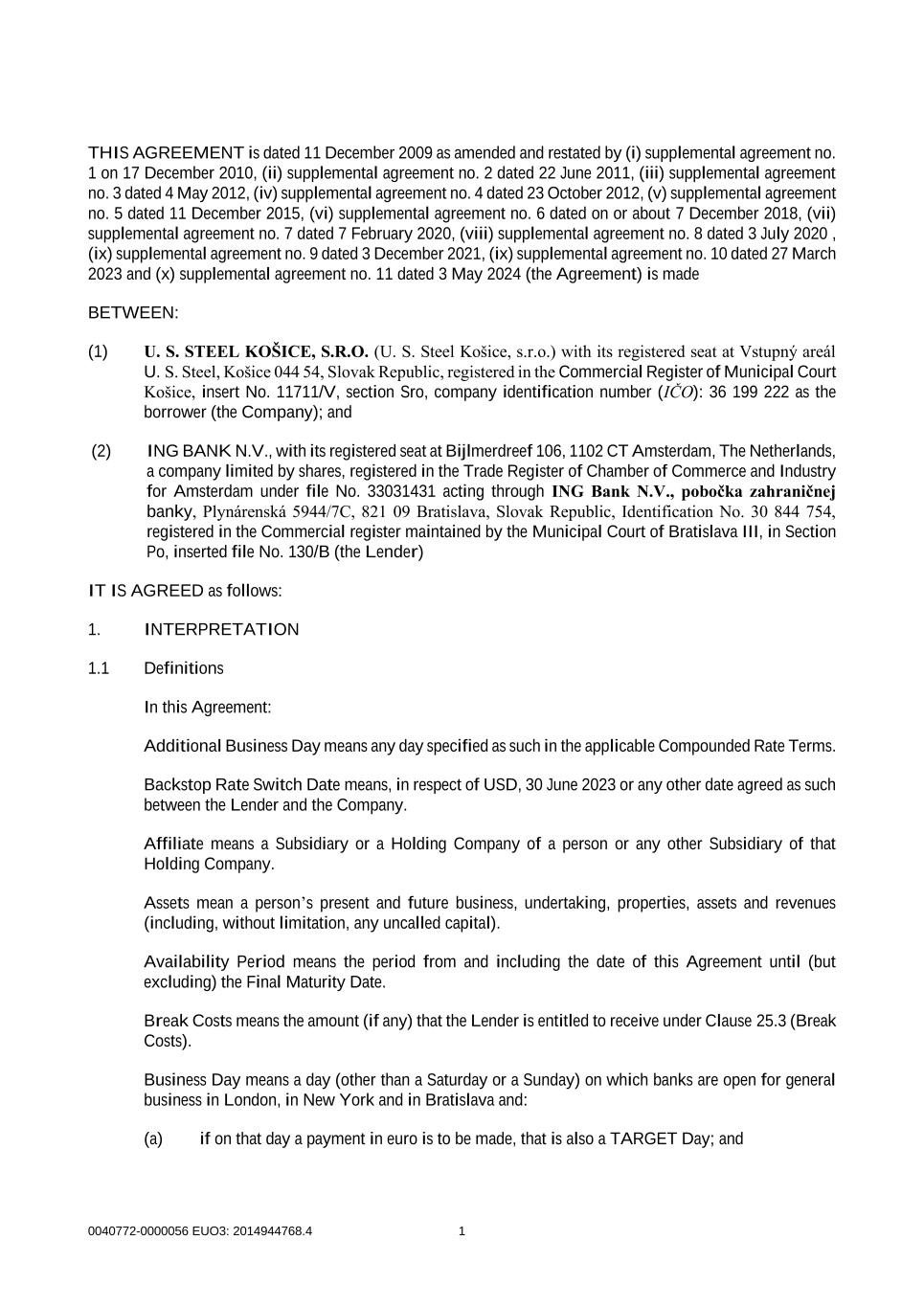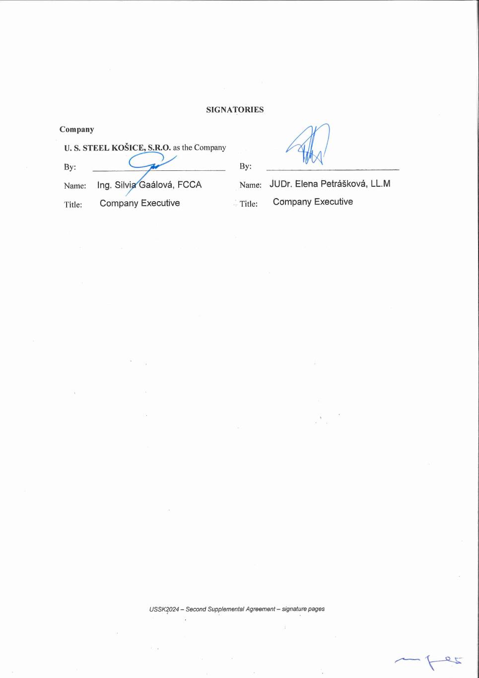 0040772-0000056 EUO3: 2014944768.4 45 19.13 Information (a) All factual information provided in writing by an officer of any member of the Group, United States Steel Corporation or any Subsidiary of United States Steel Corporation to the Lender in connection with the Finance Documents was true and accurate in all material respects as at its date or (if appropriate) as at the date (if any) at which it is stated to be given by that person. (b) Nothing was omitted from the information referred to in paragraph (a) above which, if disclosed, would make that information untrue or misleading in any material respect. (c) Nothing has occurred since the date of the information referred to in paragraph (a) above which, if disclosed, would make that information untrue or mislead in any material respect. 19.14 No notarial deed No member of the Group has created any notarial deed (as referred to in section 45.2 of the Slovak Act No. 233/1995 Coll., as amended) in relation to any Financial Indebtedness. 19.15 Financial statements Its audited unconsolidated financial statements most recently delivered to the Lender (which, at the date of the Eleventh Supplemental Agreement are the Financial Statements dated 31 December 2023): (a) have been prepared in accordance with the International Financial Reporting Standards, consistently applied; and (b) fairly represent its unconsolidated financial condition as at the date to which they were drawn up, except, in each case, as disclosed to the contrary in those financial statements. 19.16 Slovak Banking Act (a) It represents that it is not a person having any special relationship (osobitný vzťah) as defined in the Slovak Banking Act, to the Lender. (b) When making any payment under or in connection with any Finance Document, it will use solely the funds owned by it. (c) It is entering into each Finance Document as a principal and not as agent and, in its own name on its own account. 19.17 Slovak Public Sector Partners Act It is duly registered as a public sector partner (partner verejného sektora) in the register of public sector partners (register partnerov verejného sektora) in accordance with the Slovak Public Sector Partners Act. 19.18 ERISA Each ERISA Plan of the Company and of each ERISA Affiliate of the Company complies in all material respects with all applicable requirements of law and regulation. No Reportable Event has occurred with respect to any ERISA Plan, and no steps have been taken to terminate any ERISA Plan that would reasonably be expected to have a material adverse effect on the ability of the Company to