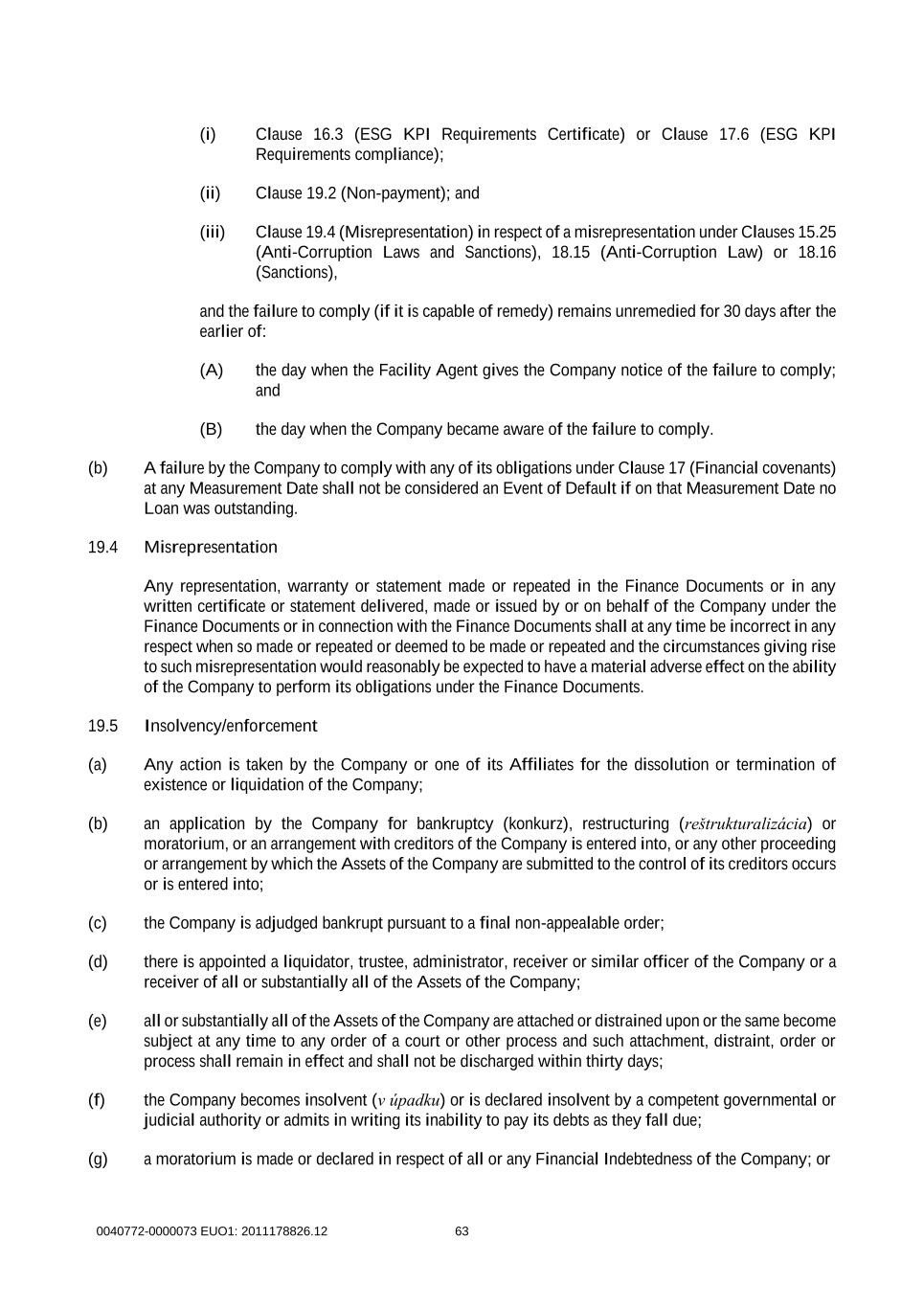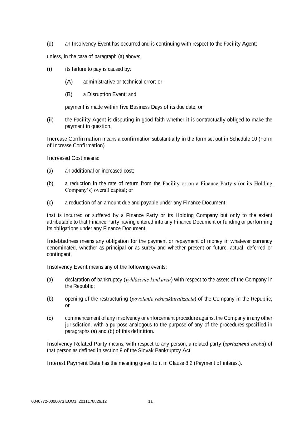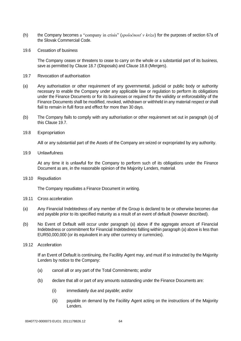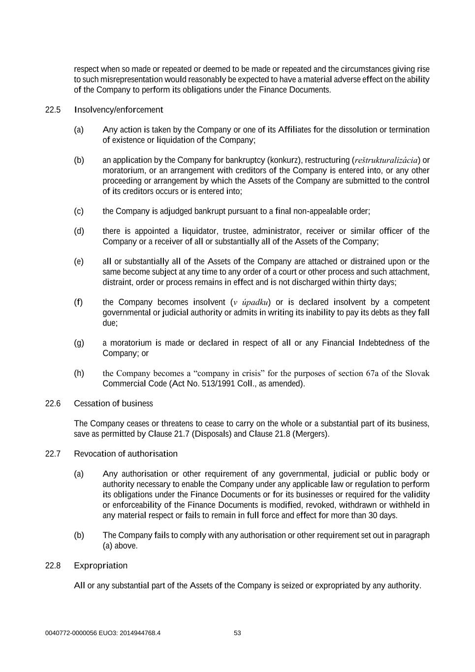 0040772-0000056 EUO3: 2014944768.4 53 respect when so made or repeated or deemed to be made or repeated and the circumstances giving rise to such misrepresentation would reasonably be expected to have a material adverse effect on the ability of the Company to perform its obligations under the Finance Documents. 22.5 Insolvency/enforcement (a) Any action is taken by the Company or one of its Affiliates for the dissolution or termination of existence or liquidation of the Company; (b) an application by the Company for bankruptcy (konkurz), restructuring (reštrukturalizácia) or moratorium, or an arrangement with creditors of the Company is entered into, or any other proceeding or arrangement by which the Assets of the Company are submitted to the control of its creditors occurs or is entered into; (c) the Company is adjudged bankrupt pursuant to a final non-appealable order; (d) there is appointed a liquidator, trustee, administrator, receiver or similar officer of the Company or a receiver of all or substantially all of the Assets of the Company; (e) all or substantially all of the Assets of the Company are attached or distrained upon or the same become subject at any time to any order of a court or other process and such attachment, distraint, order or process remains in effect and is not discharged within thirty days; (f) the Company becomes insolvent (v úpadku) or is declared insolvent by a competent governmental or judicial authority or admits in writing its inability to pay its debts as they fall due; (g) a moratorium is made or declared in respect of all or any Financial Indebtedness of the Company; or (h) the Company becomes a “company in crisis” for the purposes of section 67a of the Slovak Commercial Code (Act No. 513/1991 Coll., as amended). 22.6 Cessation of business The Company ceases or threatens to cease to carry on the whole or a substantial part of its business, save as permitted by Clause 21.7 (Disposals) and Clause 21.8 (Mergers). 22.7 Revocation of authorisation (a) Any authorisation or other requirement of any governmental, judicial or public body or authority necessary to enable the Company under any applicable law or regulation to perform its obligations under the Finance Documents or for its businesses or required for the validity or enforceability of the Finance Documents is modified, revoked, withdrawn or withheld in any material respect or fails to remain in full force and effect for more than 30 days. (b) The Company fails to comply with any authorisation or other requirement set out in paragraph (a) above. 22.8 Expropriation All or any substantial part of the Assets of the Company is seized or expropriated by any authority.