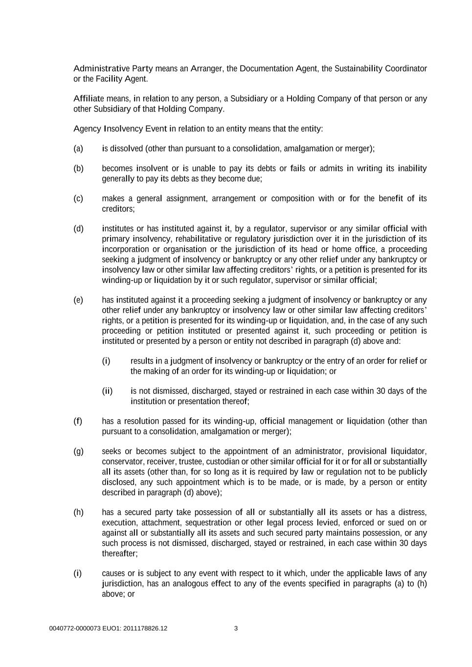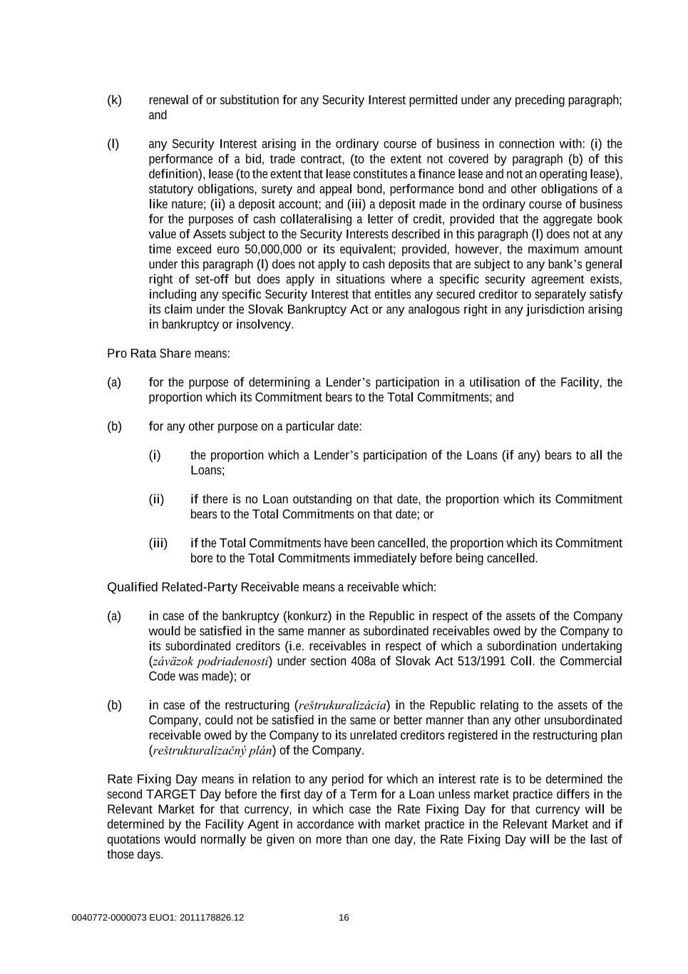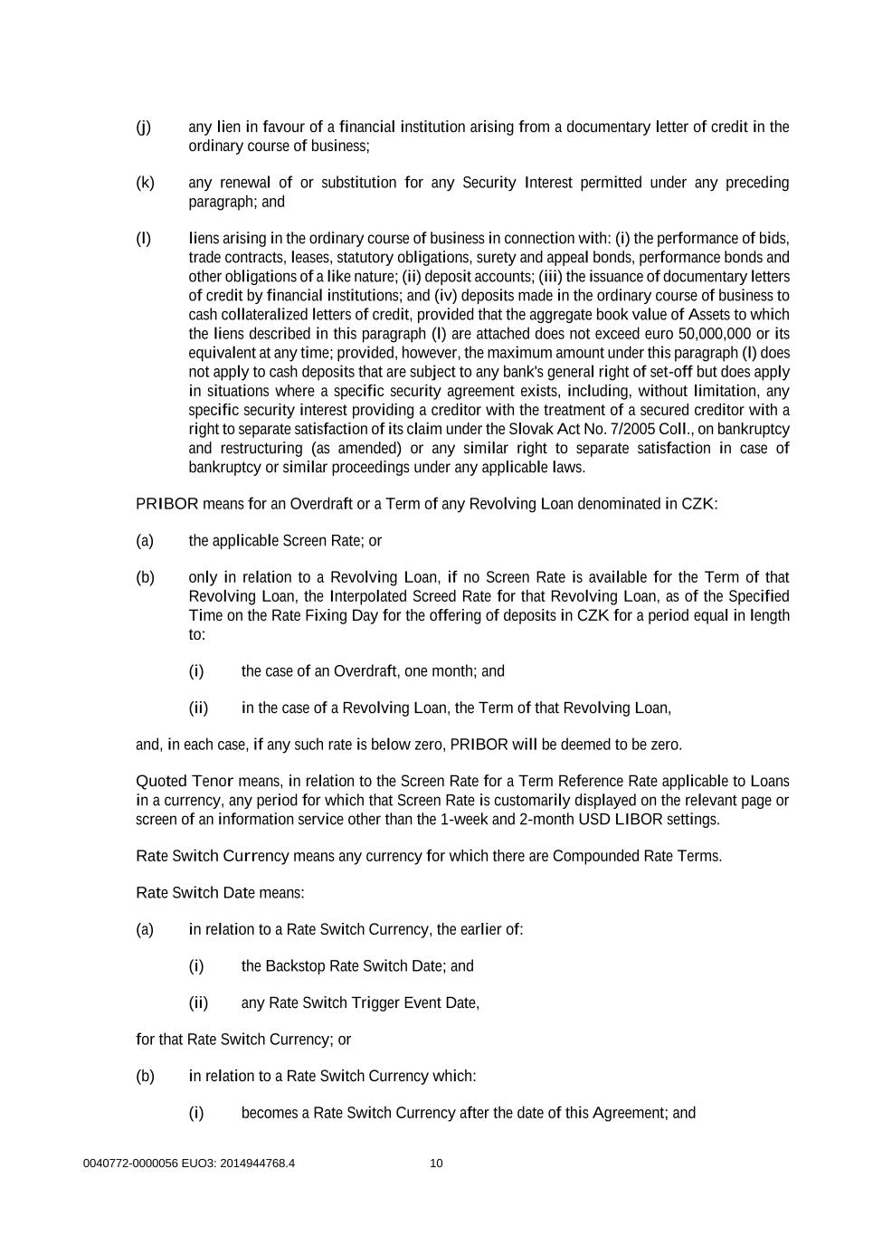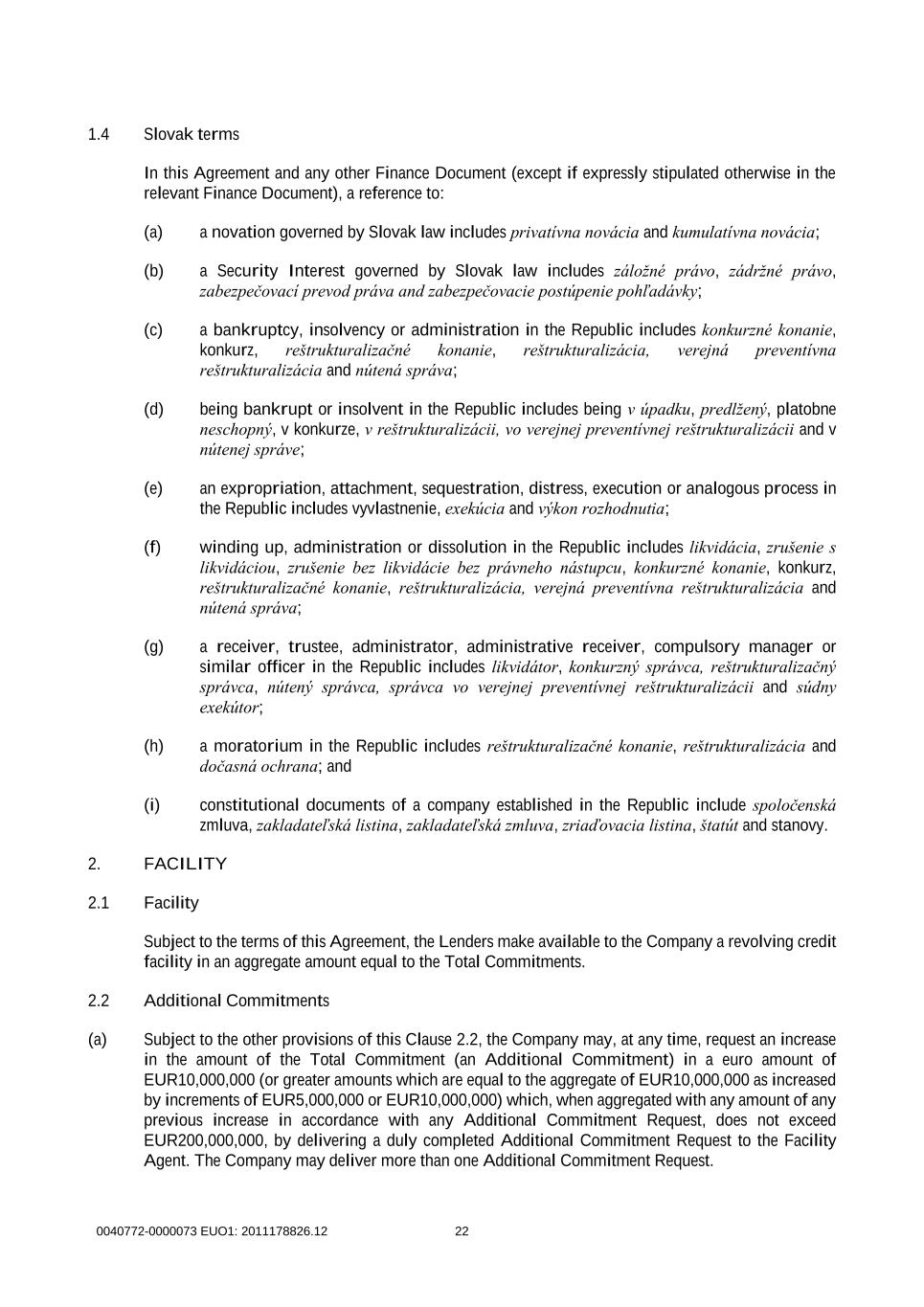 0040772-0000056 EUO3: 2014944768.4 53 respect when so made or repeated or deemed to be made or repeated and the circumstances giving rise to such misrepresentation would reasonably be expected to have a material adverse effect on the ability of the Company to perform its obligations under the Finance Documents. 22.5 Insolvency/enforcement (a) Any action is taken by the Company or one of its Affiliates for the dissolution or termination of existence or liquidation of the Company; (b) an application by the Company for bankruptcy (konkurz), restructuring (reštrukturalizácia) or moratorium, or an arrangement with creditors of the Company is entered into, or any other proceeding or arrangement by which the Assets of the Company are submitted to the control of its creditors occurs or is entered into; (c) the Company is adjudged bankrupt pursuant to a final non-appealable order; (d) there is appointed a liquidator, trustee, administrator, receiver or similar officer of the Company or a receiver of all or substantially all of the Assets of the Company; (e) all or substantially all of the Assets of the Company are attached or distrained upon or the same become subject at any time to any order of a court or other process and such attachment, distraint, order or process remains in effect and is not discharged within thirty days; (f) the Company becomes insolvent (v úpadku) or is declared insolvent by a competent governmental or judicial authority or admits in writing its inability to pay its debts as they fall due; (g) a moratorium is made or declared in respect of all or any Financial Indebtedness of the Company; or (h) the Company becomes a “company in crisis” for the purposes of section 67a of the Slovak Commercial Code (Act No. 513/1991 Coll., as amended). 22.6 Cessation of business The Company ceases or threatens to cease to carry on the whole or a substantial part of its business, save as permitted by Clause 21.7 (Disposals) and Clause 21.8 (Mergers). 22.7 Revocation of authorisation (a) Any authorisation or other requirement of any governmental, judicial or public body or authority necessary to enable the Company under any applicable law or regulation to perform its obligations under the Finance Documents or for its businesses or required for the validity or enforceability of the Finance Documents is modified, revoked, withdrawn or withheld in any material respect or fails to remain in full force and effect for more than 30 days. (b) The Company fails to comply with any authorisation or other requirement set out in paragraph (a) above. 22.8 Expropriation All or any substantial part of the Assets of the Company is seized or expropriated by any authority.