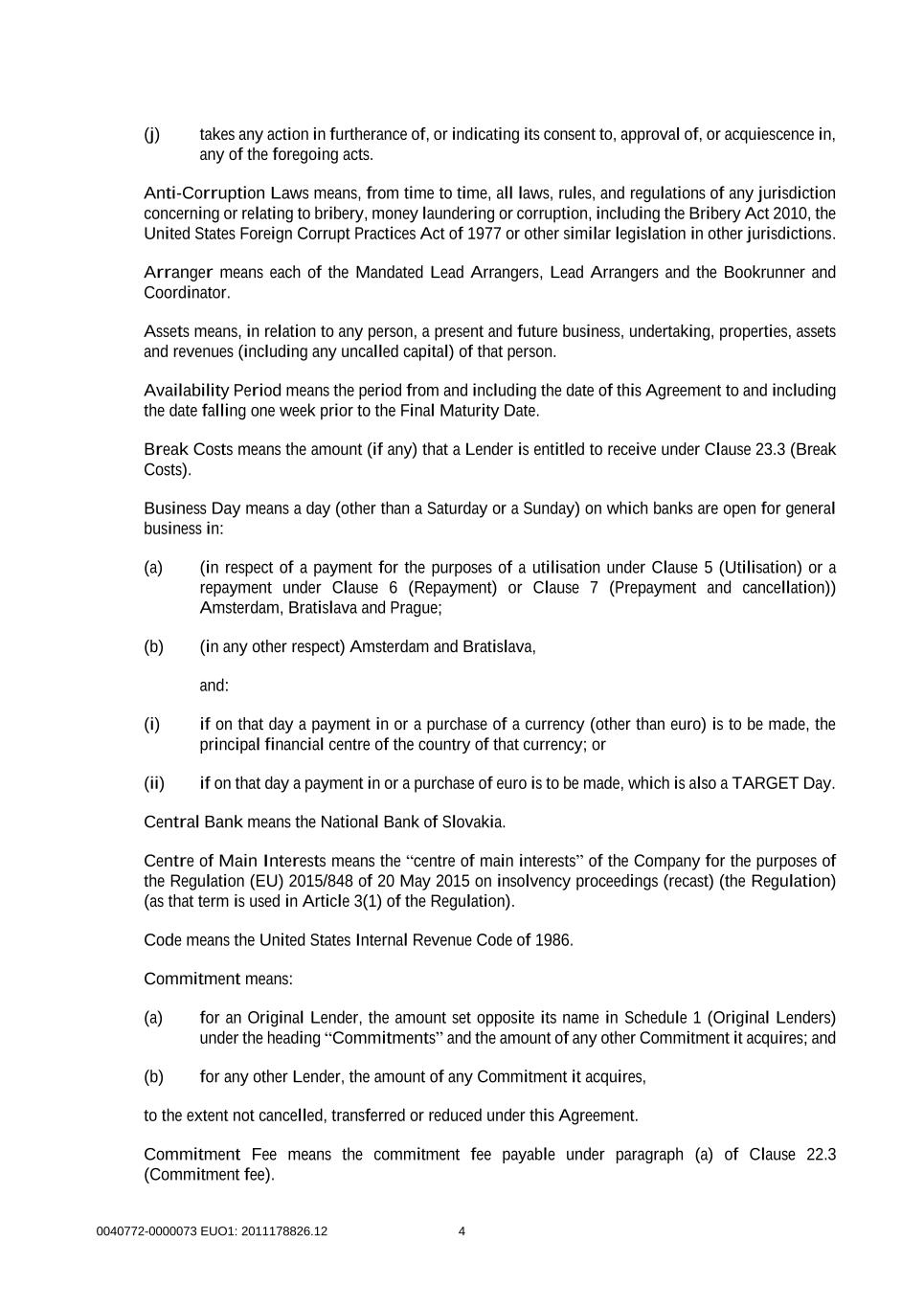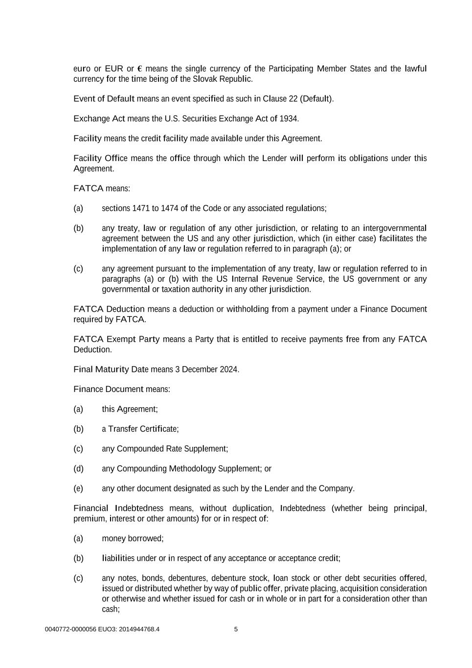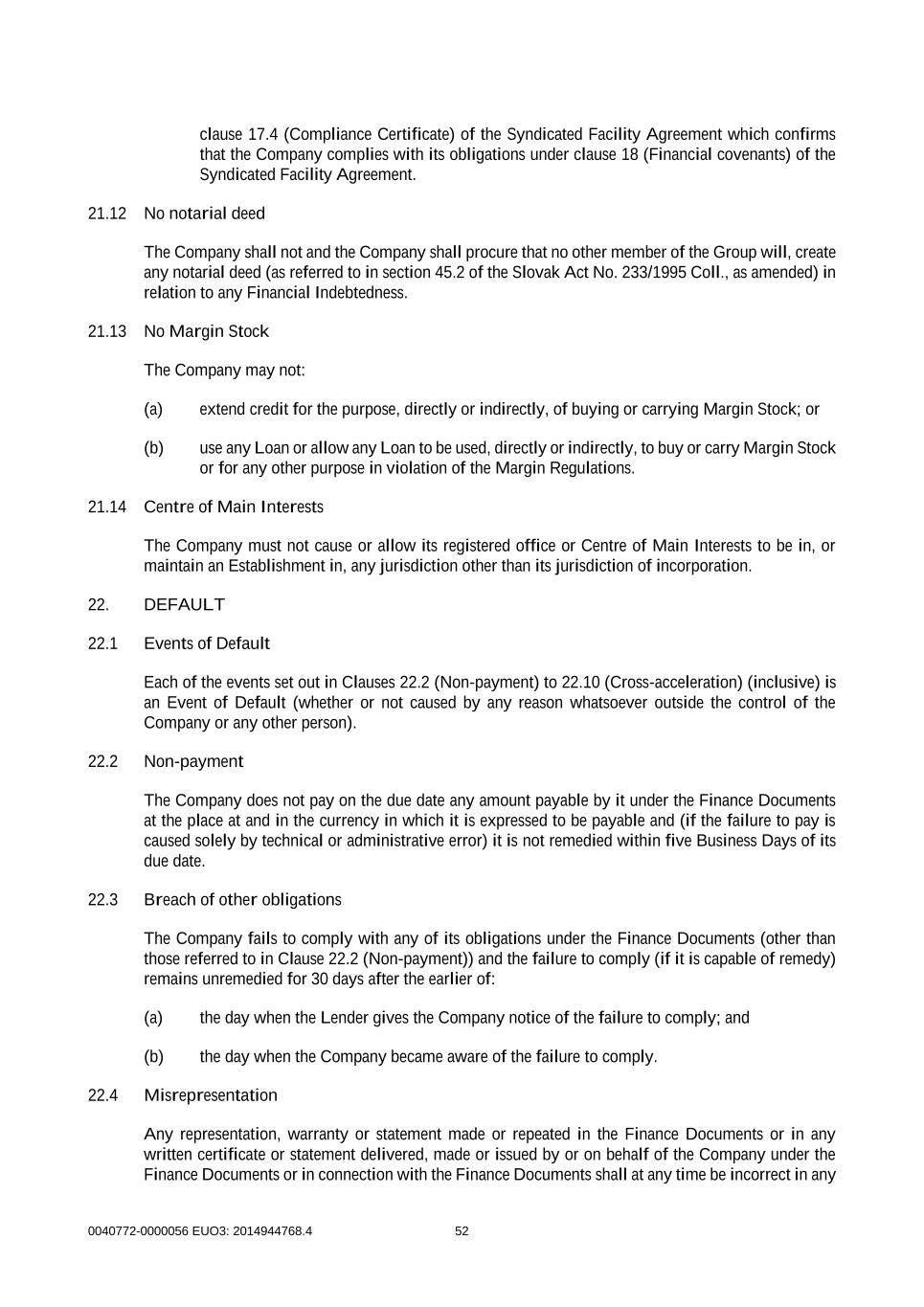 0040772-0000056 EUO3: 2014944768.4 52 clause 17.4 (Compliance Certificate) of the Syndicated Facility Agreement which confirms that the Company complies with its obligations under clause 18 (Financial covenants) of the Syndicated Facility Agreement. 21.12 No notarial deed The Company shall not and the Company shall procure that no other member of the Group will, create any notarial deed (as referred to in section 45.2 of the Slovak Act No. 233/1995 Coll., as amended) in relation to any Financial Indebtedness. 21.13 No Margin Stock The Company may not: (a) extend credit for the purpose, directly or indirectly, of buying or carrying Margin Stock; or (b) use any Loan or allow any Loan to be used, directly or indirectly, to buy or carry Margin Stock or for any other purpose in violation of the Margin Regulations. 21.14 Centre of Main Interests The Company must not cause or allow its registered office or Centre of Main Interests to be in, or maintain an Establishment in, any jurisdiction other than its jurisdiction of incorporation. 22. DEFAULT 22.1 Events of Default Each of the events set out in Clauses 22.2 (Non-payment) to 22.10 (Cross-acceleration) (inclusive) is an Event of Default (whether or not caused by any reason whatsoever outside the control of the Company or any other person). 22.2 Non-payment The Company does not pay on the due date any amount payable by it under the Finance Documents at the place at and in the currency in which it is expressed to be payable and (if the failure to pay is caused solely by technical or administrative error) it is not remedied within five Business Days of its due date. 22.3 Breach of other obligations The Company fails to comply with any of its obligations under the Finance Documents (other than those referred to in Clause 22.2 (Non-payment)) and the failure to comply (if it is capable of remedy) remains unremedied for 30 days after the earlier of: (a) the day when the Lender gives the Company notice of the failure to comply; and (b) the day when the Company became aware of the failure to comply. 22.4 Misrepresentation Any representation, warranty or statement made or repeated in the Finance Documents or in any written certificate or statement delivered, made or issued by or on behalf of the Company under the Finance Documents or in connection with the Finance Documents shall at any time be incorrect in any