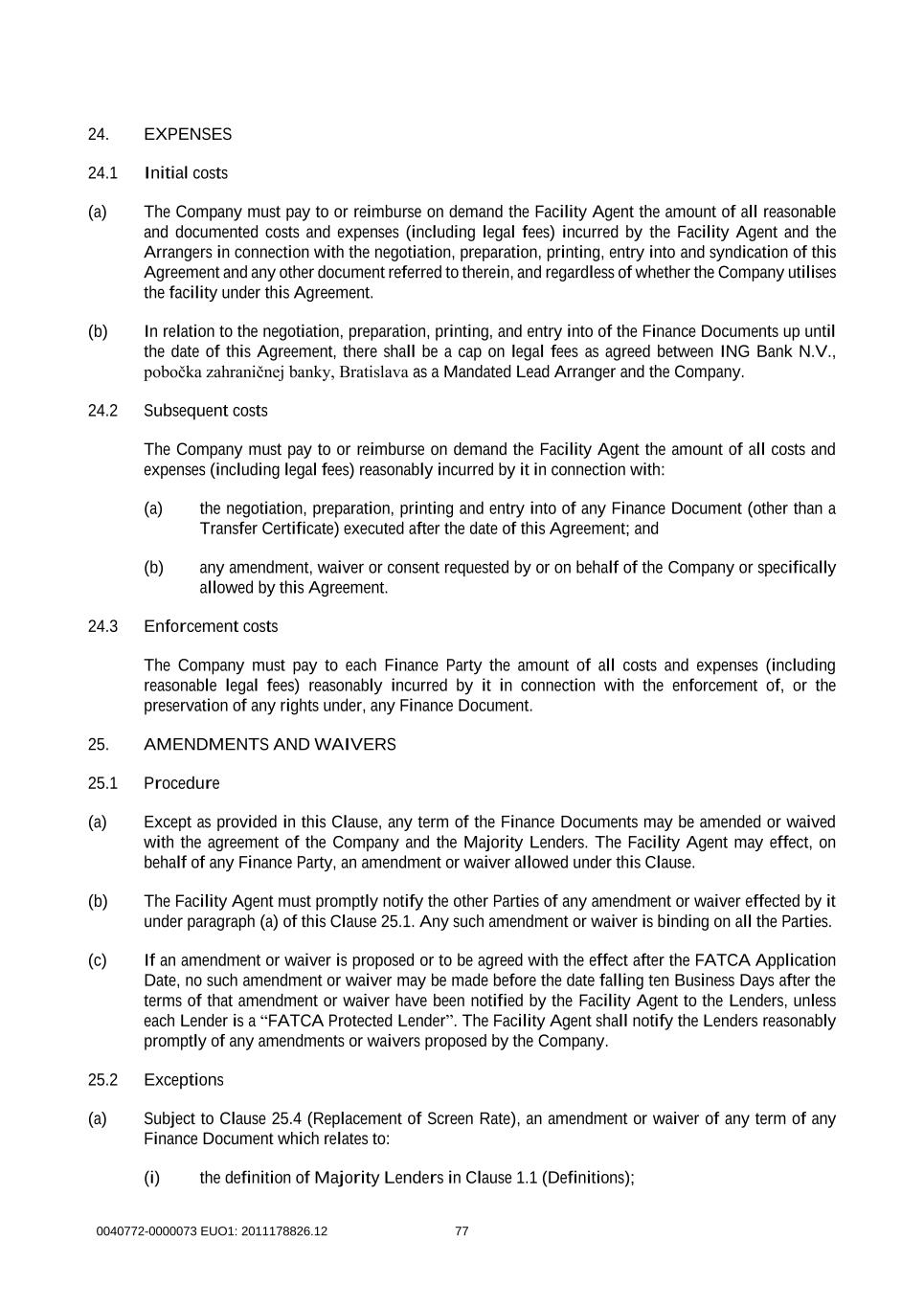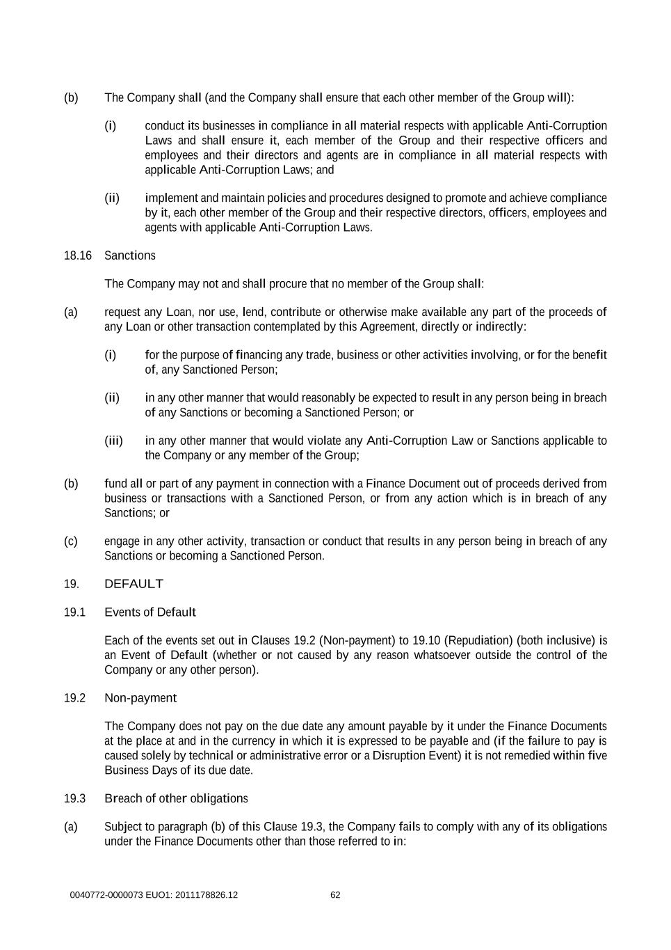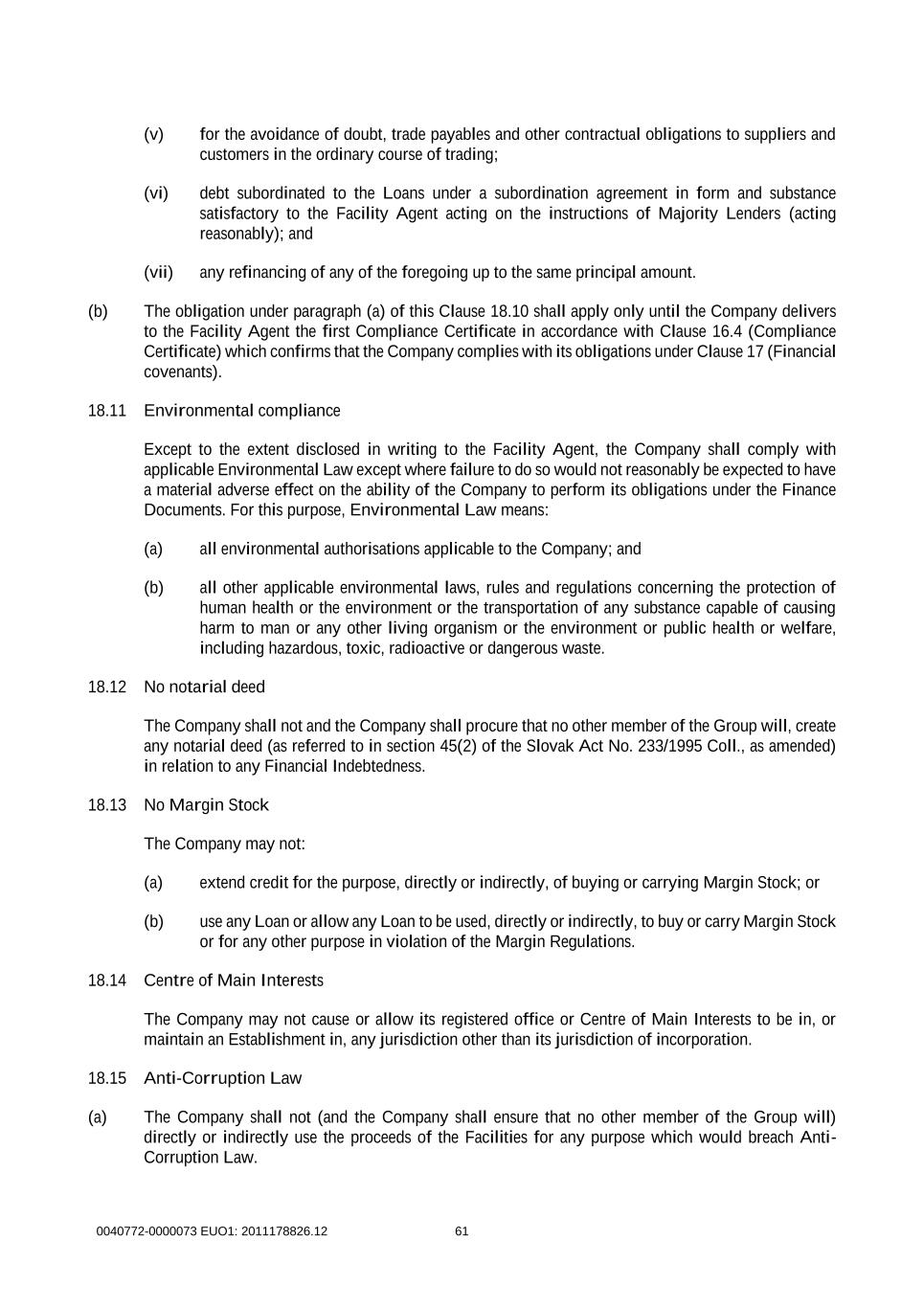 0040772-0000056 EUO3: 2014944768.4 52 clause 17.4 (Compliance Certificate) of the Syndicated Facility Agreement which confirms that the Company complies with its obligations under clause 18 (Financial covenants) of the Syndicated Facility Agreement. 21.12 No notarial deed The Company shall not and the Company shall procure that no other member of the Group will, create any notarial deed (as referred to in section 45.2 of the Slovak Act No. 233/1995 Coll., as amended) in relation to any Financial Indebtedness. 21.13 No Margin Stock The Company may not: (a) extend credit for the purpose, directly or indirectly, of buying or carrying Margin Stock; or (b) use any Loan or allow any Loan to be used, directly or indirectly, to buy or carry Margin Stock or for any other purpose in violation of the Margin Regulations. 21.14 Centre of Main Interests The Company must not cause or allow its registered office or Centre of Main Interests to be in, or maintain an Establishment in, any jurisdiction other than its jurisdiction of incorporation. 22. DEFAULT 22.1 Events of Default Each of the events set out in Clauses 22.2 (Non-payment) to 22.10 (Cross-acceleration) (inclusive) is an Event of Default (whether or not caused by any reason whatsoever outside the control of the Company or any other person). 22.2 Non-payment The Company does not pay on the due date any amount payable by it under the Finance Documents at the place at and in the currency in which it is expressed to be payable and (if the failure to pay is caused solely by technical or administrative error) it is not remedied within five Business Days of its due date. 22.3 Breach of other obligations The Company fails to comply with any of its obligations under the Finance Documents (other than those referred to in Clause 22.2 (Non-payment)) and the failure to comply (if it is capable of remedy) remains unremedied for 30 days after the earlier of: (a) the day when the Lender gives the Company notice of the failure to comply; and (b) the day when the Company became aware of the failure to comply. 22.4 Misrepresentation Any representation, warranty or statement made or repeated in the Finance Documents or in any written certificate or statement delivered, made or issued by or on behalf of the Company under the Finance Documents or in connection with the Finance Documents shall at any time be incorrect in any