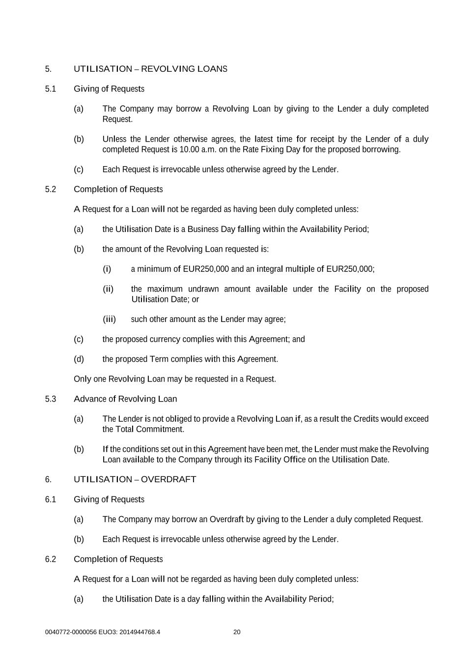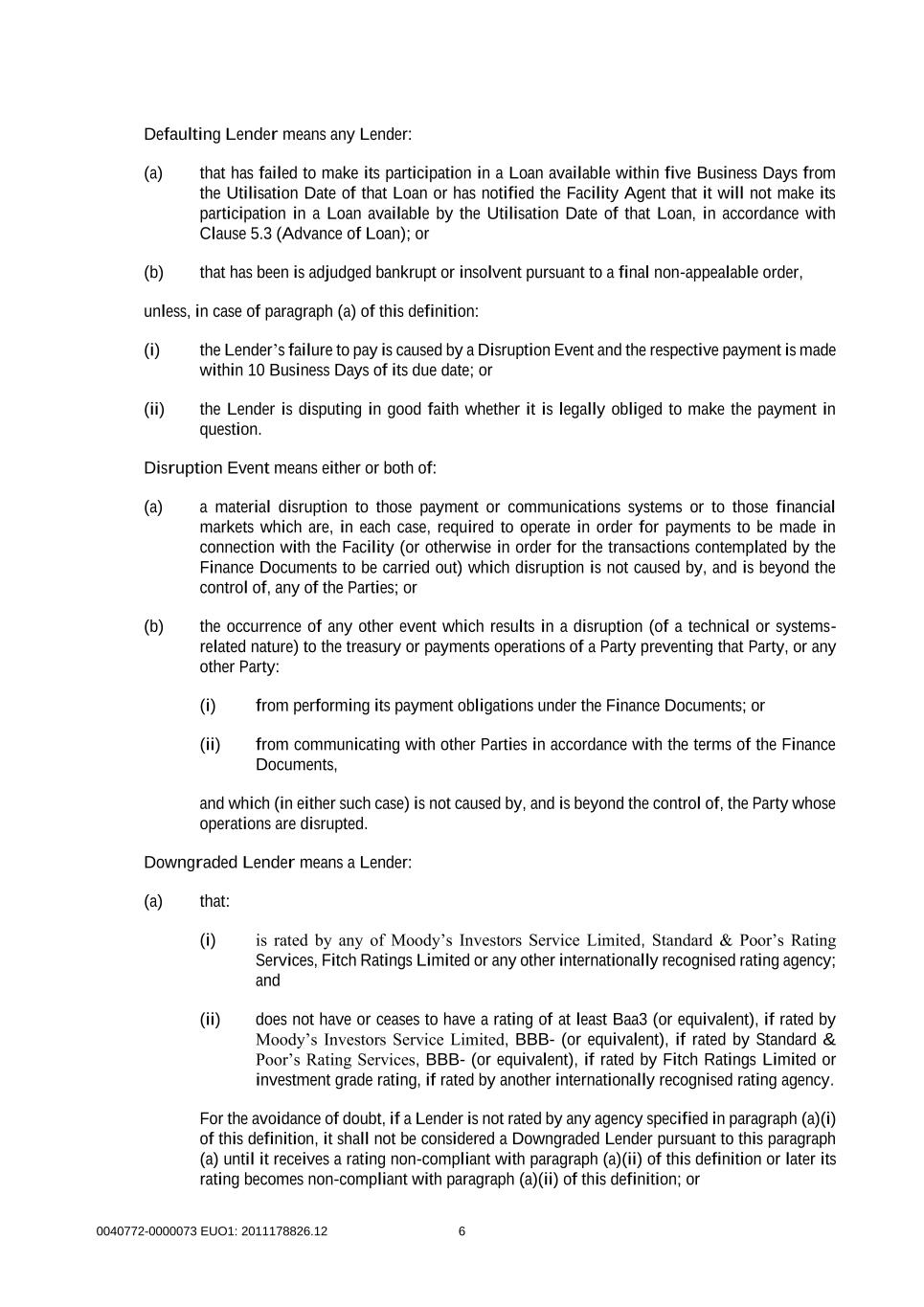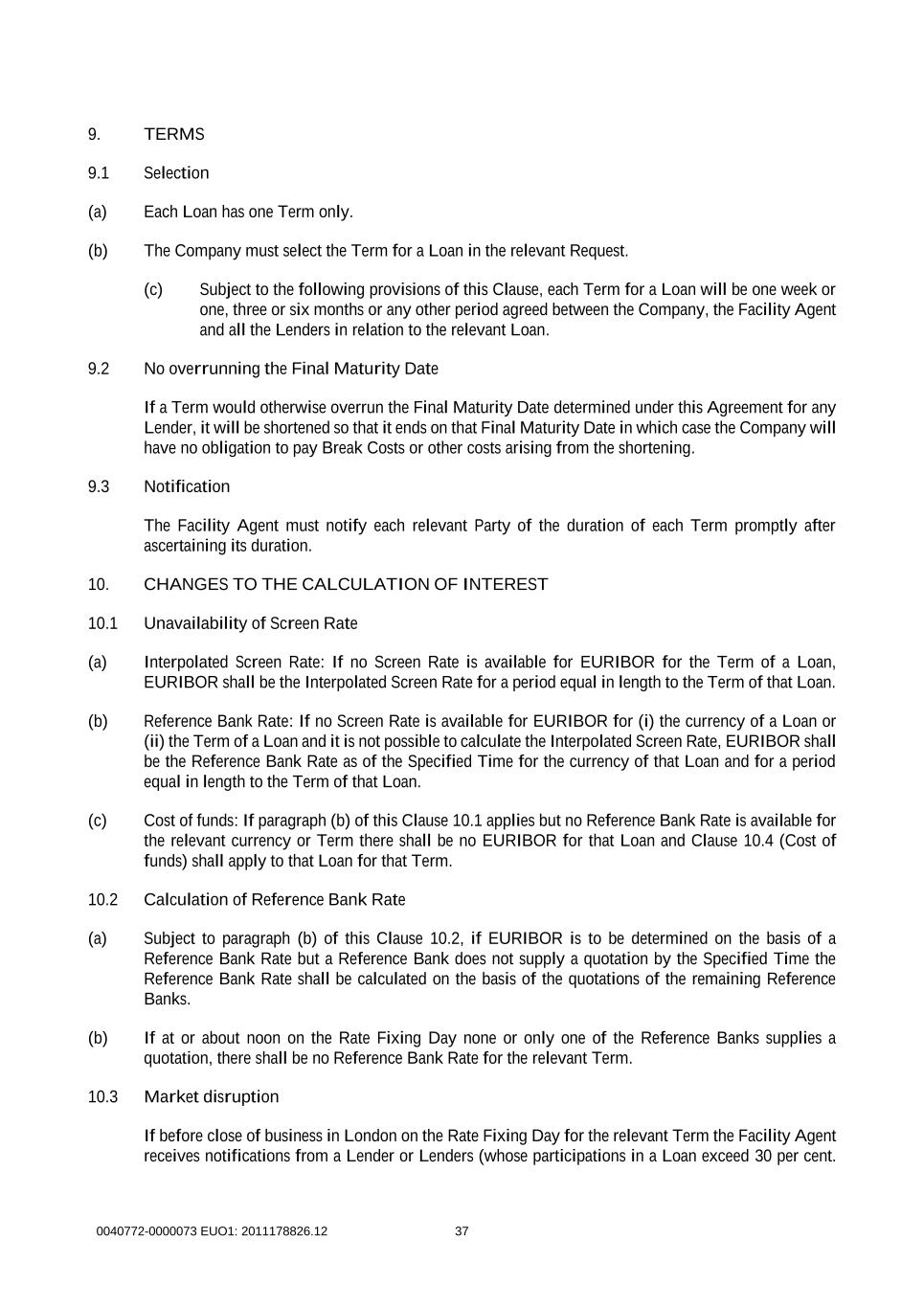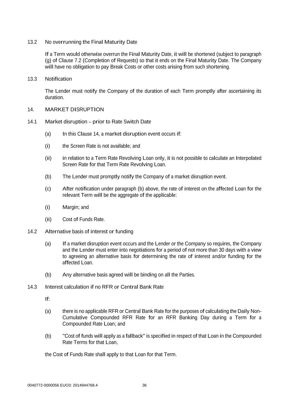 0040772-0000056 EUO3: 2014944768.4 36 13.2 No overrunning the Final Maturity Date If a Term would otherwise overrun the Final Maturity Date, it will be shortened (subject to paragraph (g) of Clause 7.2 (Completion of Requests) so that it ends on the Final Maturity Date. The Company will have no obligation to pay Break Costs or other costs arising from such shortening. 13.3 Notification The Lender must notify the Company of the duration of each Term promptly after ascertaining its duration. 14. MARKET DISRUPTION 14.1 Market disruption – prior to Rate Switch Date (a) In this Clause 14, a market disruption event occurs if: (i) the Screen Rate is not available; and (ii) in relation to a Term Rate Revolving Loan only, it is not possible to calculate an Interpolated Screen Rate for that Term Rate Revolving Loan. (b) The Lender must promptly notify the Company of a market disruption event. (c) After notification under paragraph (b) above, the rate of interest on the affected Loan for the relevant Term will be the aggregate of the applicable: (i) Margin; and (ii) Cost of Funds Rate. 14.2 Alternative basis of interest or funding (a) If a market disruption event occurs and the Lender or the Company so requires, the Company and the Lender must enter into negotiations for a period of not more than 30 days with a view to agreeing an alternative basis for determining the rate of interest and/or funding for the affected Loan. (b) Any alternative basis agreed will be binding on all the Parties. 14.3 Interest calculation if no RFR or Central Bank Rate If: (a) there is no applicable RFR or Central Bank Rate for the purposes of calculating the Daily Non- Cumulative Compounded RFR Rate for an RFR Banking Day during a Term for a Compounded Rate Loan; and (b) "Cost of funds will apply as a fallback" is specified in respect of that Loan in the Compounded Rate Terms for that Loan, the Cost of Funds Rate shall apply to that Loan for that Term.