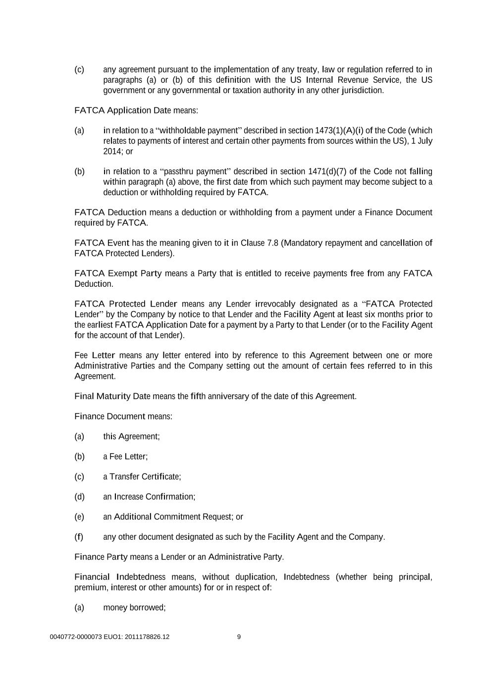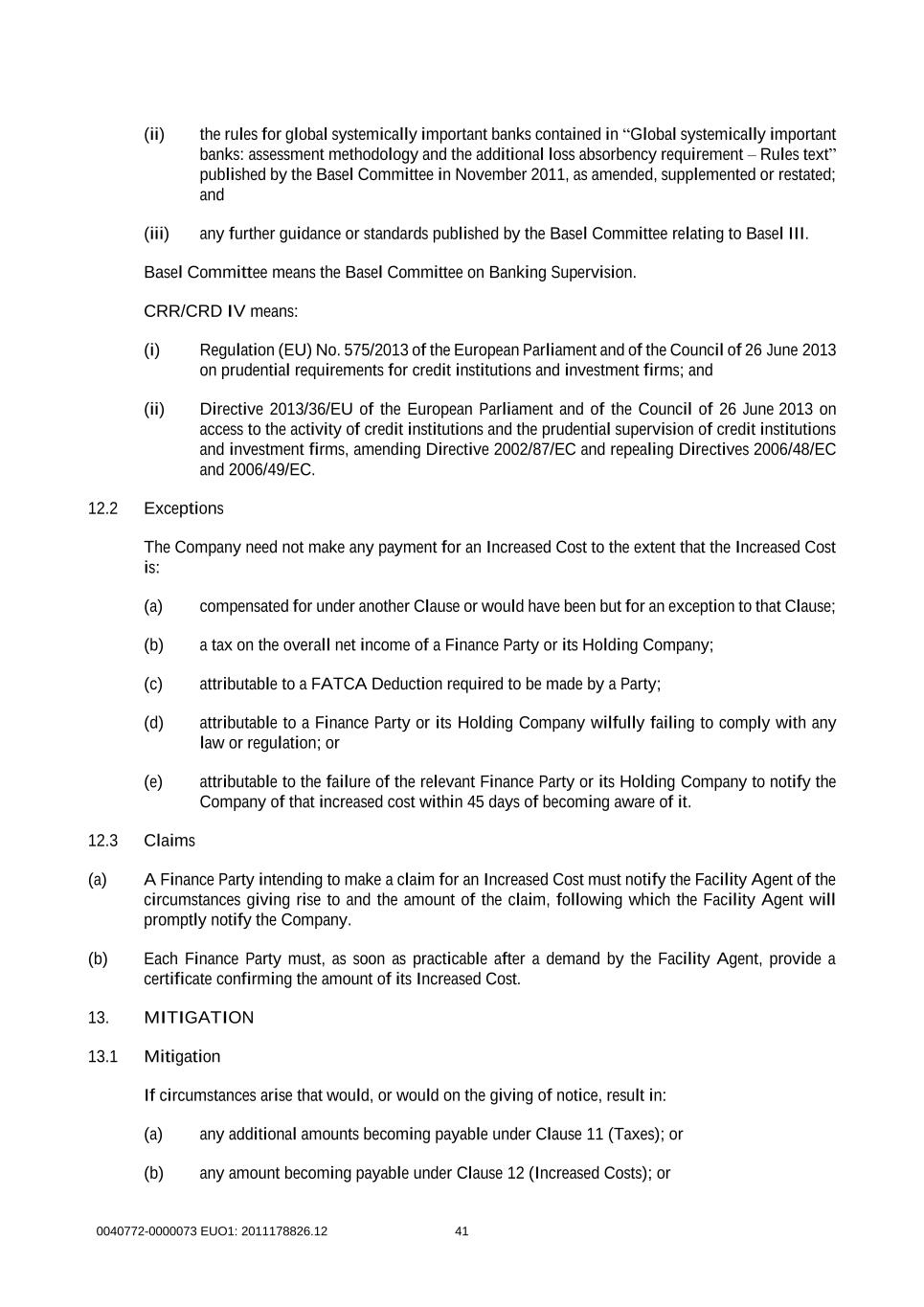 0040772-0000056 EUO3: 2014944768.4 40 (b) compliance with any law or regulation made after the date of this Agreement; or (c) the implementation or application of, or compliance with, Basel III or CRD IV or any law or regulation that implements or applies Basel III or CRD IV. The Lender agrees to notify the Company promptly upon becoming aware that this Clause 16.1 applies. 16.2 Exceptions (a) The Company need not make any payment for an Increased Cost to the extent that the Increased Cost is: (i) compensated for under another Clause or would have been but for an exception to that Clause; (ii) a tax on the overall net income of the Lender or its Holding Company; (iii) attributable to a FATCA Deduction required to be made by a Party; (iv) attributable to the Lender or its Holding Company wilfully failing to comply with any law or regulation; (v) on failure of the Lender or its Holding Company to notify the Company of that increased cost within 45 days of becoming aware of it; or (vi) attributable to the implementation or application of or compliance with the "International Convergence of Capital Measurement and Capital Standards, a Revised Framework" published by the Basel Committee in June 2004 in the form existing on the date of this Agreement (but excluding any amendment arising out of Basel III or CRD IV) (Basel II) or any other law or regulation which implements Basel II (whether such implementation, application or compliance is by a government, regulator, the Lender or any of its Affiliates). (b) In this Agreement: Basel III means: (i) the agreements on capital requirements, a leverage ratio and liquidity standards contained in "Basel III: A global regulatory framework for more resilient banks and banking systems", "Basel III: International framework for liquidity risk measurement, standards and monitoring" and "Guidance for national authorities operating the countercyclical capital buffer" published by the Basel Committee in December 2010, each as amended; and (ii) any further guidance or standards published by the Basel Committee relating to "Basel III". Basel Committee means the Basel Committee on Banking Supervision. CRD IV means: (i) Regulation (EU) No 575/2013 of the European Parliament and of the Council of 26 June 2013 on prudential requirements for credit institutions and investment firms and amending Regulation (EU No 648/2012); and (ii) Directive 2013/36/EU of the European Parliament and of the Council of 26 June 2013 on access to the activity of credit institutions and the prudential supervision of credit institutions