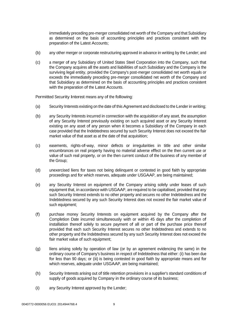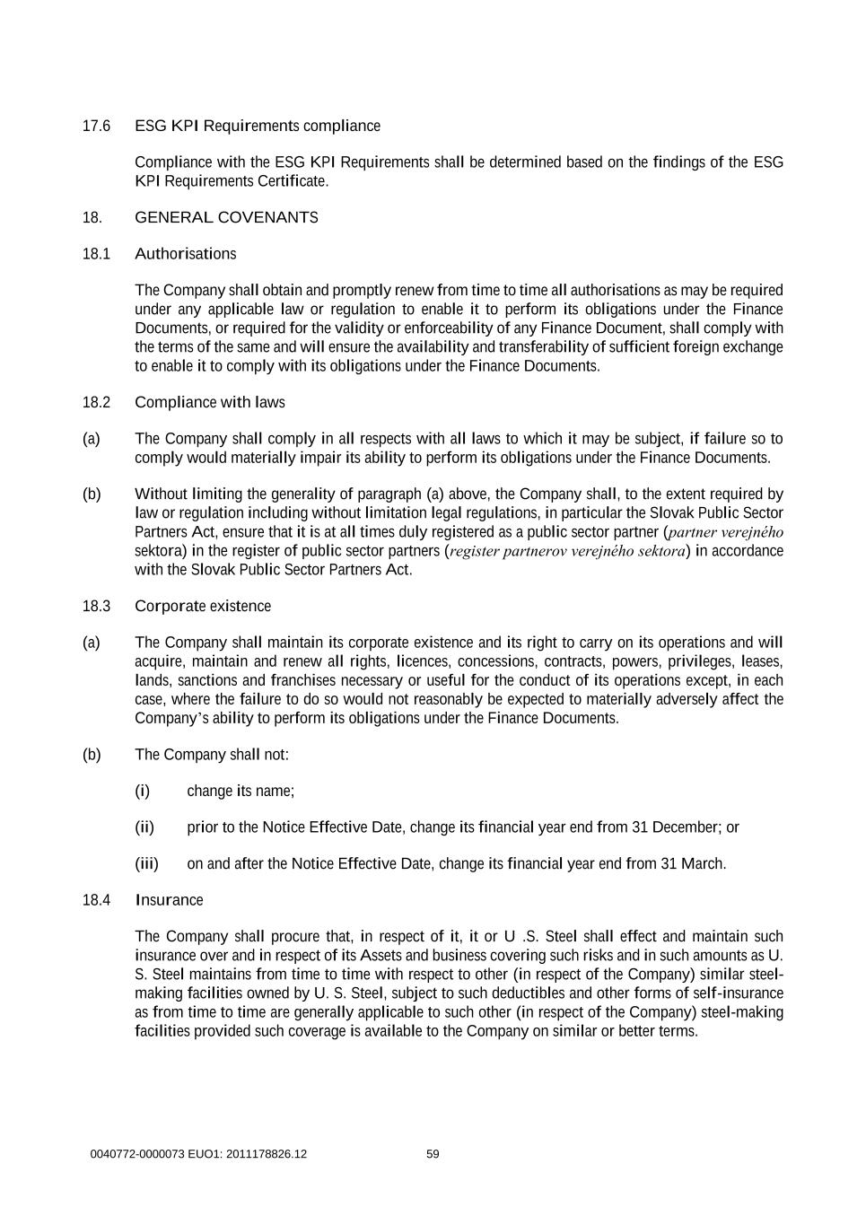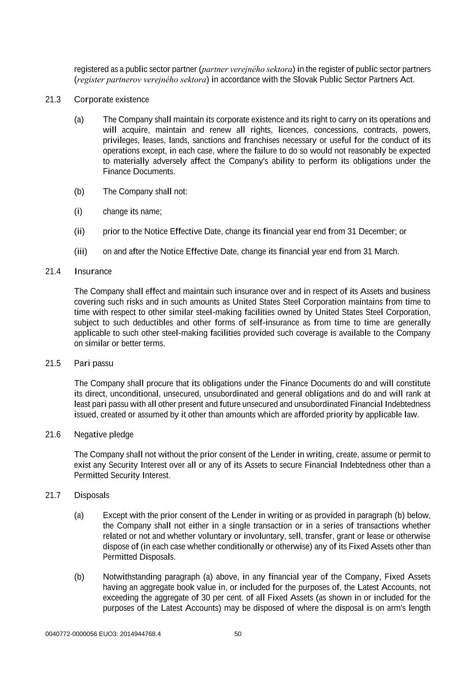 0040772-0000056 EUO3: 2014944768.4 50 registered as a public sector partner (partner verejného sektora) in the register of public sector partners (register partnerov verejného sektora) in accordance with the Slovak Public Sector Partners Act. 21.3 Corporate existence (a) The Company shall maintain its corporate existence and its right to carry on its operations and will acquire, maintain and renew all rights, licences, concessions, contracts, powers, privileges, leases, lands, sanctions and franchises necessary or useful for the conduct of its operations except, in each case, where the failure to do so would not reasonably be expected to materially adversely affect the Company's ability to perform its obligations under the Finance Documents. (b) The Company shall not: (i) change its name; (ii) prior to the Notice Effective Date, change its financial year end from 31 December; or (iii) on and after the Notice Effective Date, change its financial year end from 31 March. 21.4 Insurance The Company shall effect and maintain such insurance over and in respect of its Assets and business covering such risks and in such amounts as United States Steel Corporation maintains from time to time with respect to other similar steel-making facilities owned by United States Steel Corporation, subject to such deductibles and other forms of self-insurance as from time to time are generally applicable to such other steel-making facilities provided such coverage is available to the Company on similar or better terms. 21.5 Pari passu The Company shall procure that its obligations under the Finance Documents do and will constitute its direct, unconditional, unsecured, unsubordinated and general obligations and do and will rank at least pari passu with all other present and future unsecured and unsubordinated Financial Indebtedness issued, created or assumed by it other than amounts which are afforded priority by applicable law. 21.6 Negative pledge The Company shall not without the prior consent of the Lender in writing, create, assume or permit to exist any Security Interest over all or any of its Assets to secure Financial Indebtedness other than a Permitted Security Interest. 21.7 Disposals (a) Except with the prior consent of the Lender in writing or as provided in paragraph (b) below, the Company shall not either in a single transaction or in a series of transactions whether related or not and whether voluntary or involuntary, sell, transfer, grant or lease or otherwise dispose of (in each case whether conditionally or otherwise) any of its Fixed Assets other than Permitted Disposals. (b) Notwithstanding paragraph (a) above, in any financial year of the Company, Fixed Assets having an aggregate book value in, or included for the purposes of, the Latest Accounts, not exceeding the aggregate of 30 per cent. of all Fixed Assets (as shown in or included for the purposes of the Latest Accounts) may be disposed of where the disposal is on arm's length