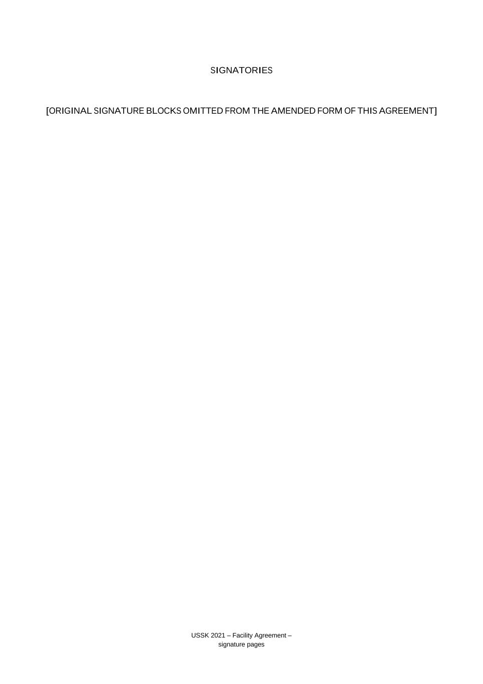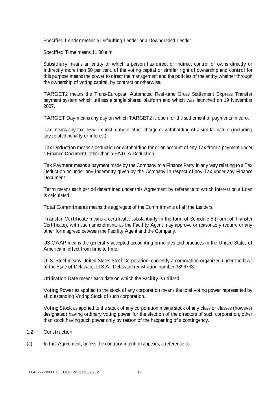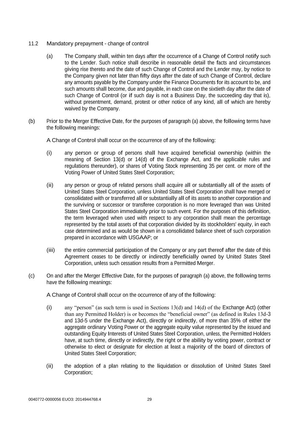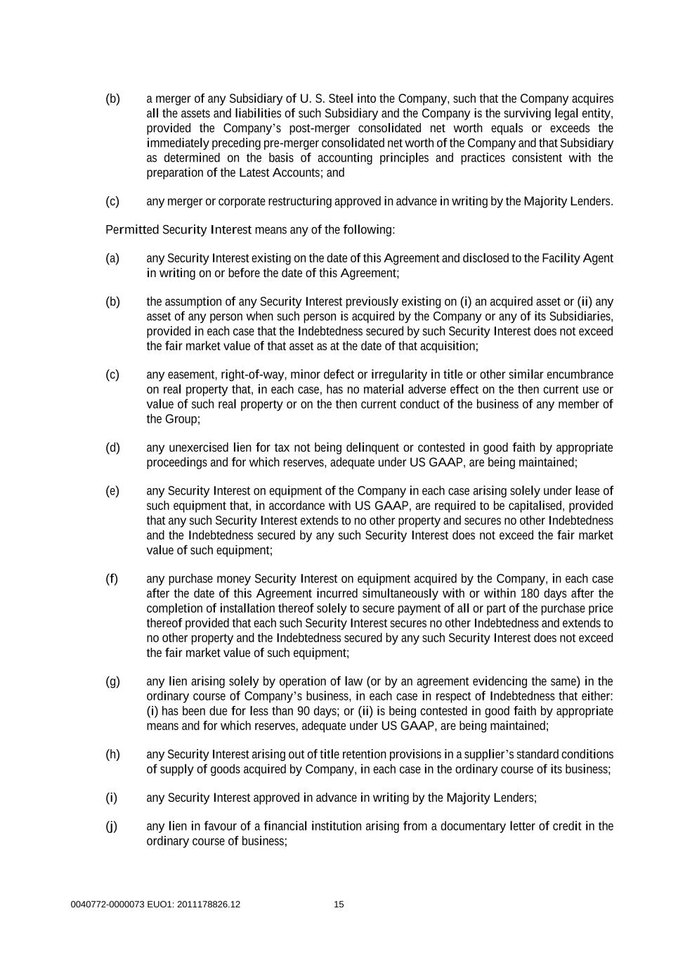 0040772-0000056 EUO3: 2014944768.4 50 registered as a public sector partner (partner verejného sektora) in the register of public sector partners (register partnerov verejného sektora) in accordance with the Slovak Public Sector Partners Act. 21.3 Corporate existence (a) The Company shall maintain its corporate existence and its right to carry on its operations and will acquire, maintain and renew all rights, licences, concessions, contracts, powers, privileges, leases, lands, sanctions and franchises necessary or useful for the conduct of its operations except, in each case, where the failure to do so would not reasonably be expected to materially adversely affect the Company's ability to perform its obligations under the Finance Documents. (b) The Company shall not: (i) change its name; (ii) prior to the Notice Effective Date, change its financial year end from 31 December; or (iii) on and after the Notice Effective Date, change its financial year end from 31 March. 21.4 Insurance The Company shall effect and maintain such insurance over and in respect of its Assets and business covering such risks and in such amounts as United States Steel Corporation maintains from time to time with respect to other similar steel-making facilities owned by United States Steel Corporation, subject to such deductibles and other forms of self-insurance as from time to time are generally applicable to such other steel-making facilities provided such coverage is available to the Company on similar or better terms. 21.5 Pari passu The Company shall procure that its obligations under the Finance Documents do and will constitute its direct, unconditional, unsecured, unsubordinated and general obligations and do and will rank at least pari passu with all other present and future unsecured and unsubordinated Financial Indebtedness issued, created or assumed by it other than amounts which are afforded priority by applicable law. 21.6 Negative pledge The Company shall not without the prior consent of the Lender in writing, create, assume or permit to exist any Security Interest over all or any of its Assets to secure Financial Indebtedness other than a Permitted Security Interest. 21.7 Disposals (a) Except with the prior consent of the Lender in writing or as provided in paragraph (b) below, the Company shall not either in a single transaction or in a series of transactions whether related or not and whether voluntary or involuntary, sell, transfer, grant or lease or otherwise dispose of (in each case whether conditionally or otherwise) any of its Fixed Assets other than Permitted Disposals. (b) Notwithstanding paragraph (a) above, in any financial year of the Company, Fixed Assets having an aggregate book value in, or included for the purposes of, the Latest Accounts, not exceeding the aggregate of 30 per cent. of all Fixed Assets (as shown in or included for the purposes of the Latest Accounts) may be disposed of where the disposal is on arm's length
