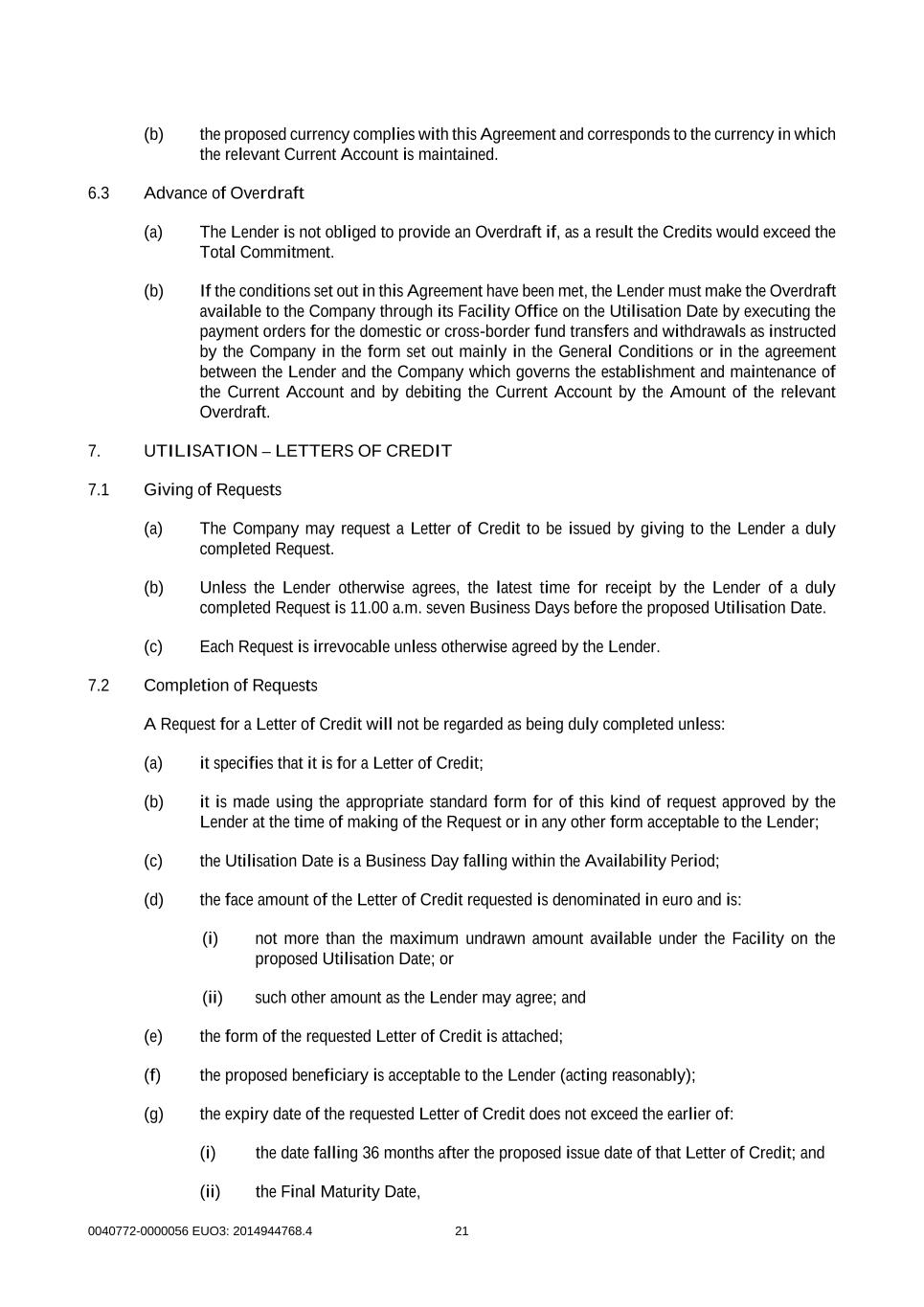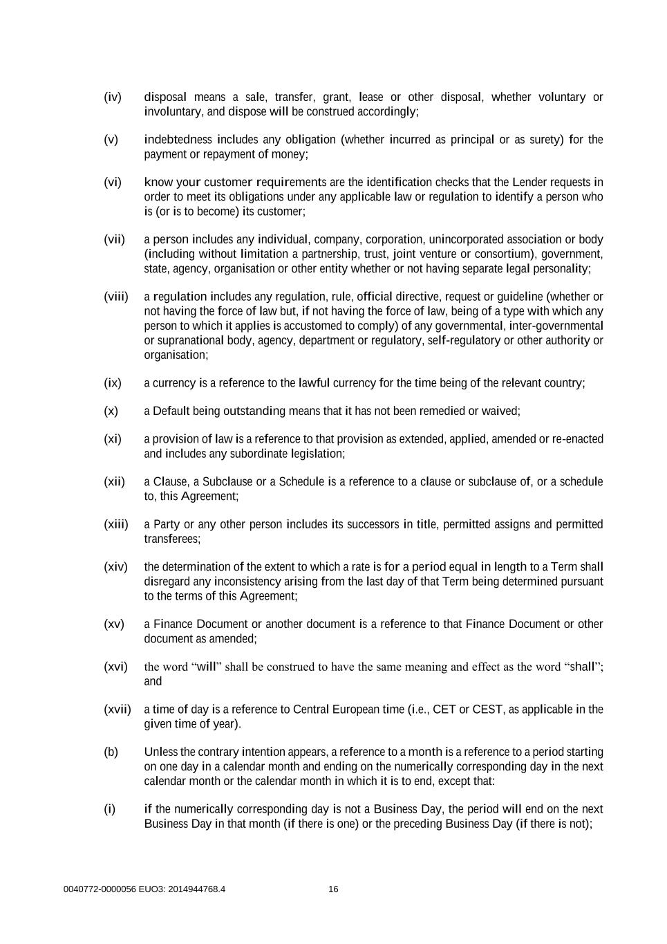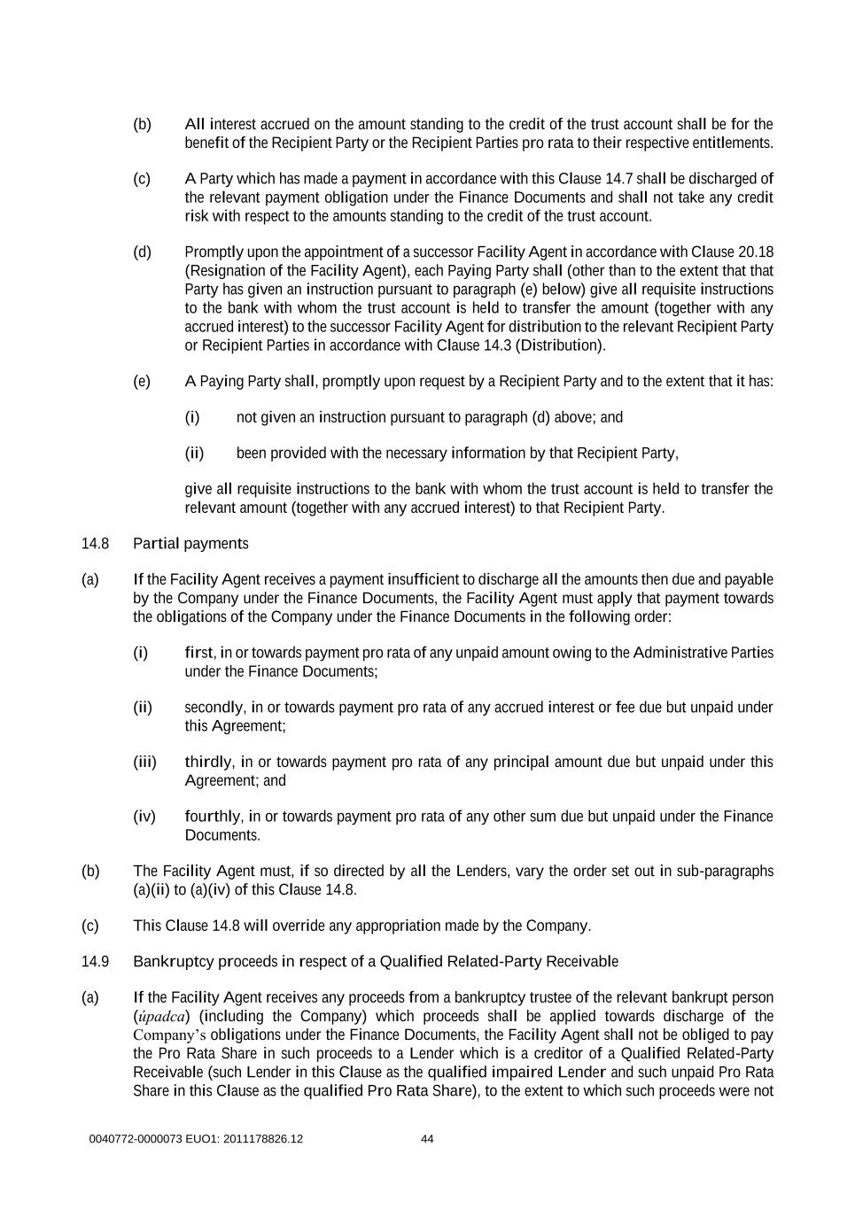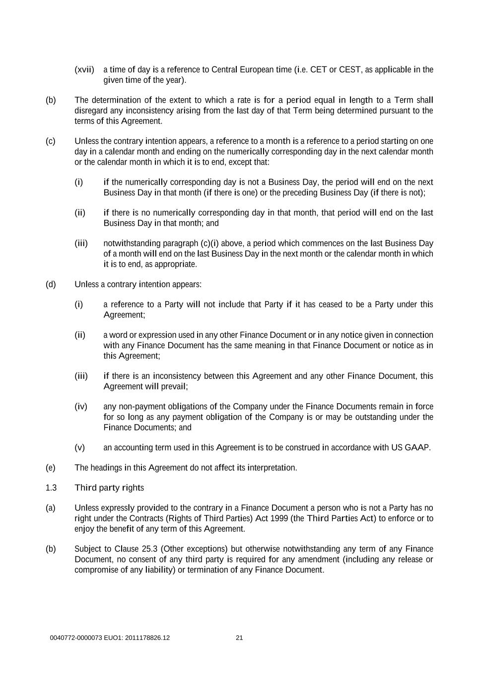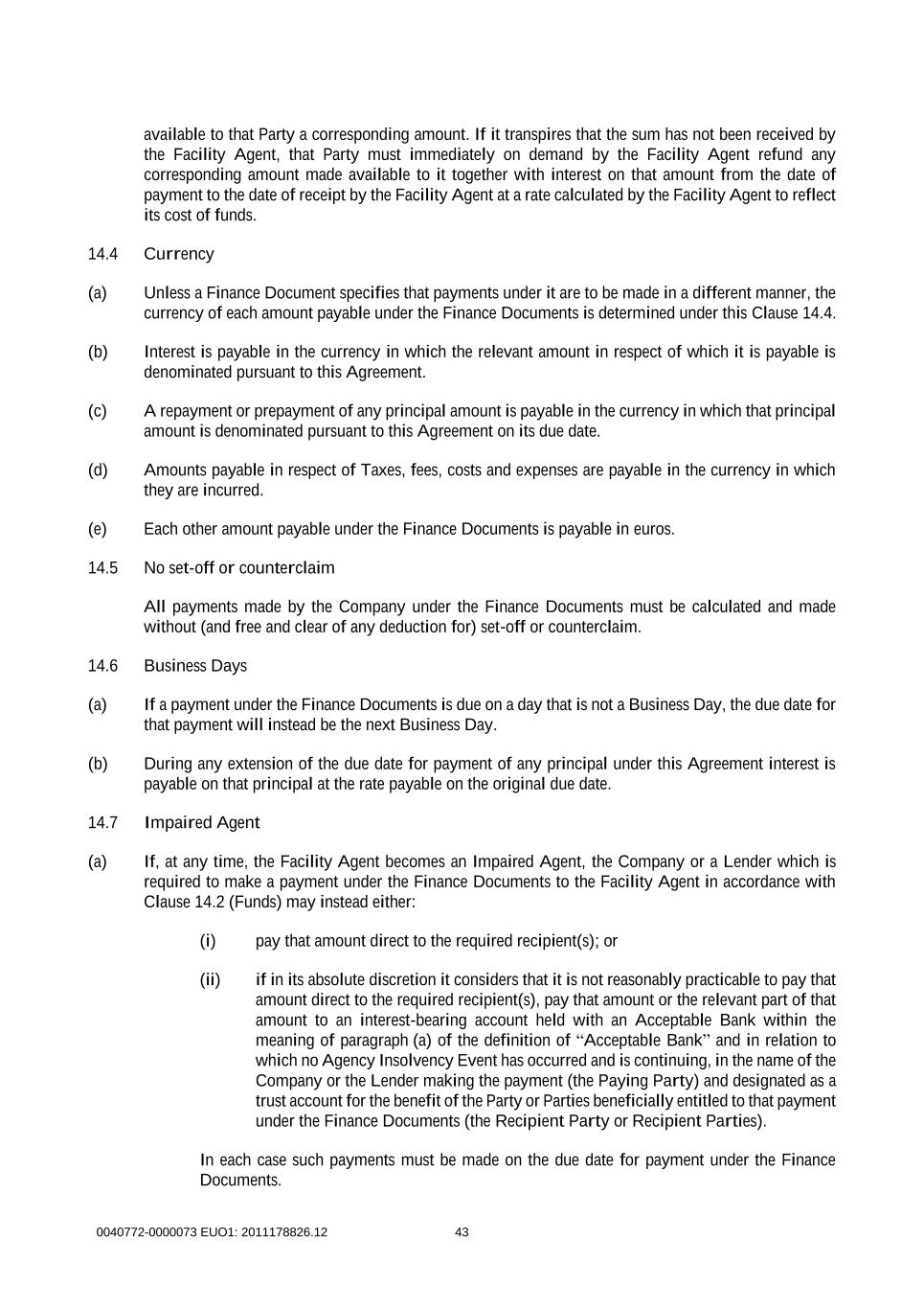 0040772-0000056 EUO3: 2014944768.4 42 (b) Interest is payable in the currency in which the relevant amount in respect of which it is payable is denominated. (c) A repayment or prepayment of any principal amount is payable in the currency in which that principal amount is denominated on its due date. (d) Amounts payable in respect of Taxes, fees, costs and expenses are payable in the currency in which they are incurred. (e) Each other amount payable under the Finance Documents is payable in euros. 18.4 No set-off or counterclaim All payments made by the Company under the Finance Documents must be calculated and made without (and free and clear of any deduction for) set-off or counterclaim. 18.5 Business Days (a) If a payment under the Finance Documents is due on a day that is not a Business Day, the due date for that payment will instead be the next Business Day. (b) During any extension of the due date for payment of any principal under this Agreement interest is payable on that principal at the rate payable on the original due date. 18.6 Partial payments (a) If the Lender receives a payment insufficient to discharge all the amounts then due and payable by the Company under the Finance Documents, the Lender must apply that payment towards the obligations of the Company under the Finance Documents in the following order: (i) first, in or towards payment pro rata of any unpaid fees, costs and expenses of the Lender under the Finance Documents; (ii) secondly, in or towards payment pro rata of any accrued interest or fee due but unpaid under this Agreement; (iii) thirdly, in or towards payment pro rata of any principal amount due but unpaid under this Agreement; and (iv) fourthly, in or towards payment pro rata of any other sum due but unpaid under the Finance Documents. (b) The Lender may vary the order set out in sub-paragraphs (a)(ii) to (iv) above. (c) This Subclause will override any appropriation made by the Company. 18.7 Timing of payments If a Finance Document does not provide for when a particular payment is due, that payment will be due 30 days after receipt by the Company of a claim (accompanied by, if available, separate invoices) signed on behalf of the Lender specifying the amount due, the provision of the Finance Document under which the Company’s liability to pay arises and setting out in reasonable detail a calculation of the amount due.