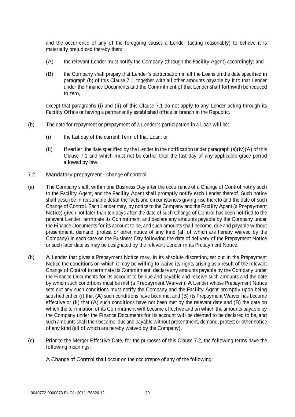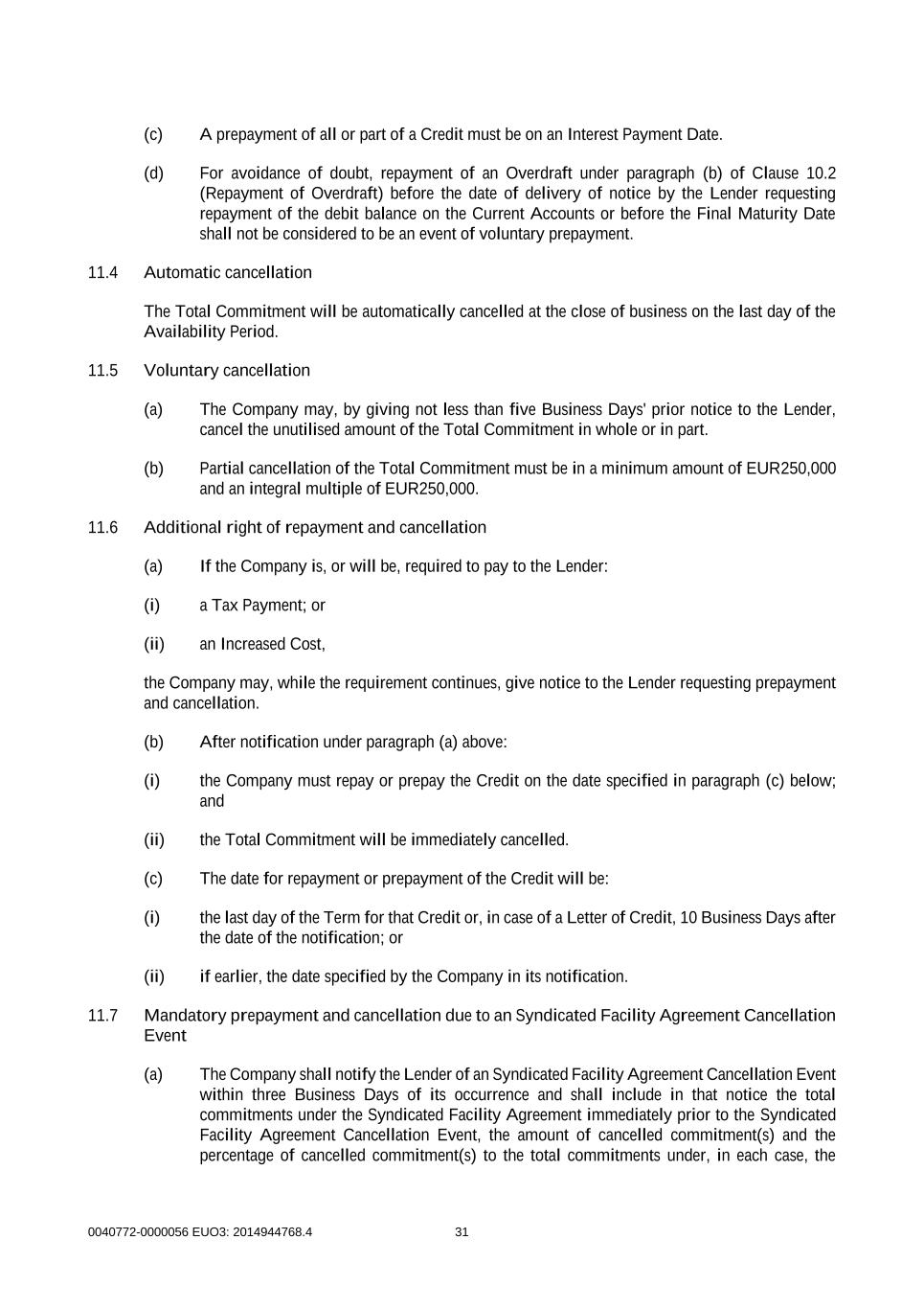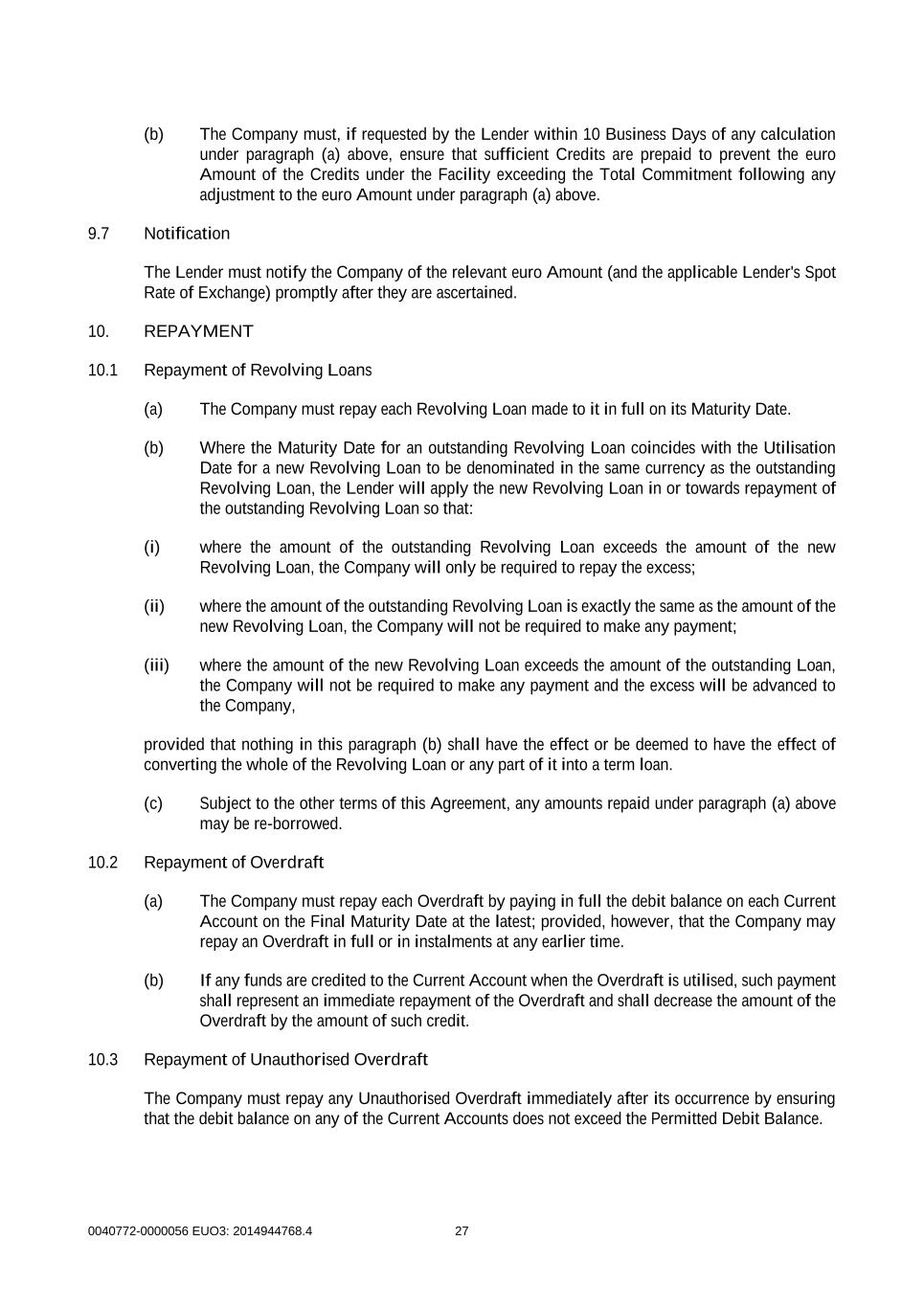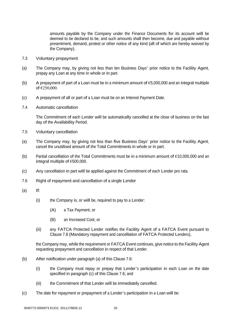 0040772-0000056 EUO3: 2014944768.4 32 Syndicated Facility Agreement (the Cancellation Percentage) and the date of that Syndicated Facility Agreement Cancellation Event. (b) The Total Commitment will be automatically cancelled on the date falling five Business Days following such Syndicated Facility Agreement Cancellation Event in a proportion equal to the Cancellation Percentage. (c) If the amount of any Loans outstanding would exceed the Total Commitment after the cancellation in paragraph (b) above, the Company shall, on the date falling no later than immediately prior to the cancellation of the Total Commitment in accordance with paragraph (a) above, prepay sufficient amounts outstanding under the Loans in order for the amount outstanding to not exceed the Total Commitment after the cancellation in paragraph (b) above. In this Clause 11.7, Syndicated Facility Agreement Cancellation Event means any of the commitments being cancelled, in whole or in part, under the Syndicated Facility Agreement. 11.8 Re-borrowing of Credits Any voluntary prepayment of a Credit under Clause 11.3 (Voluntary prepayment) may be re-borrowed subject to the terms of this Agreement. Any mandatory or involuntary prepayment of a Credit may not be re-borrowed. 11.9 Miscellaneous provisions (a) Any notice of prepayment and/or cancellation under this Agreement is irrevocable and must specify the relevant date(s) and the affected Credits, and, in case of cancellation, if any of the affected Credit is an Overdraft, how the Permitted Debit Balance on the relevant Current Account has been reduced. (b) All prepayments under this Agreement must be made with accrued interest on the amount prepaid. No premium or penalty is payable in respect of any prepayment except for Break Costs. (c) The Lender may agree a shorter notice period for a voluntary prepayment or a voluntary cancellation. (d) No prepayment or cancellation is allowed except in accordance with the express terms of this Agreement. (e) No amount of the Total Commitment cancelled under this Agreement may subsequently be reinstated. 11A. RATE SWITCH 11A.1 Switch to Compounded Reference Rate Subject to Clause 11A.2 (Delayed switch for existing Term Rate Overdrafts and Term Rate Revolving Loans), on and from the Rate Switch Date for a Rate Switch Currency: (a) use of the Compounded Reference Rate will replace the use of the Term Reference Rate for the calculation of interest for Loans in that Rate Switch Currency; and (b) any Loan in that Rate Switch Currency shall be a "Compounded Rate Loan" and Clause 12.3 (Calculation of interest – Compounded Rate Loans) shall apply to each such Loan.