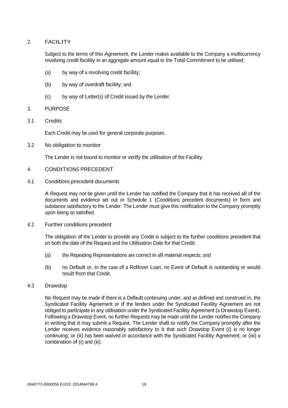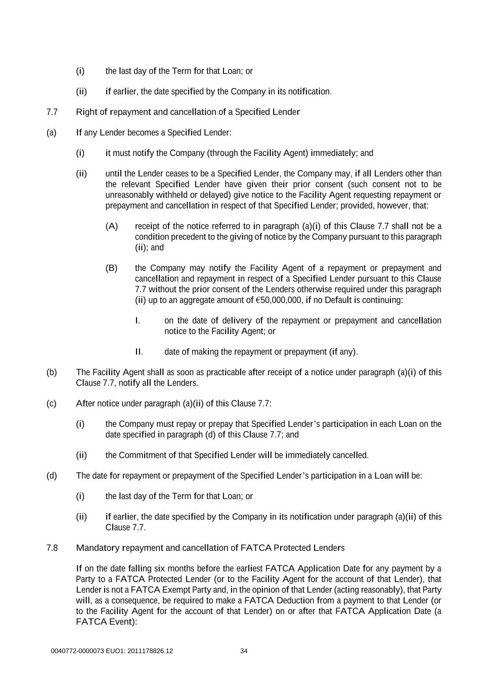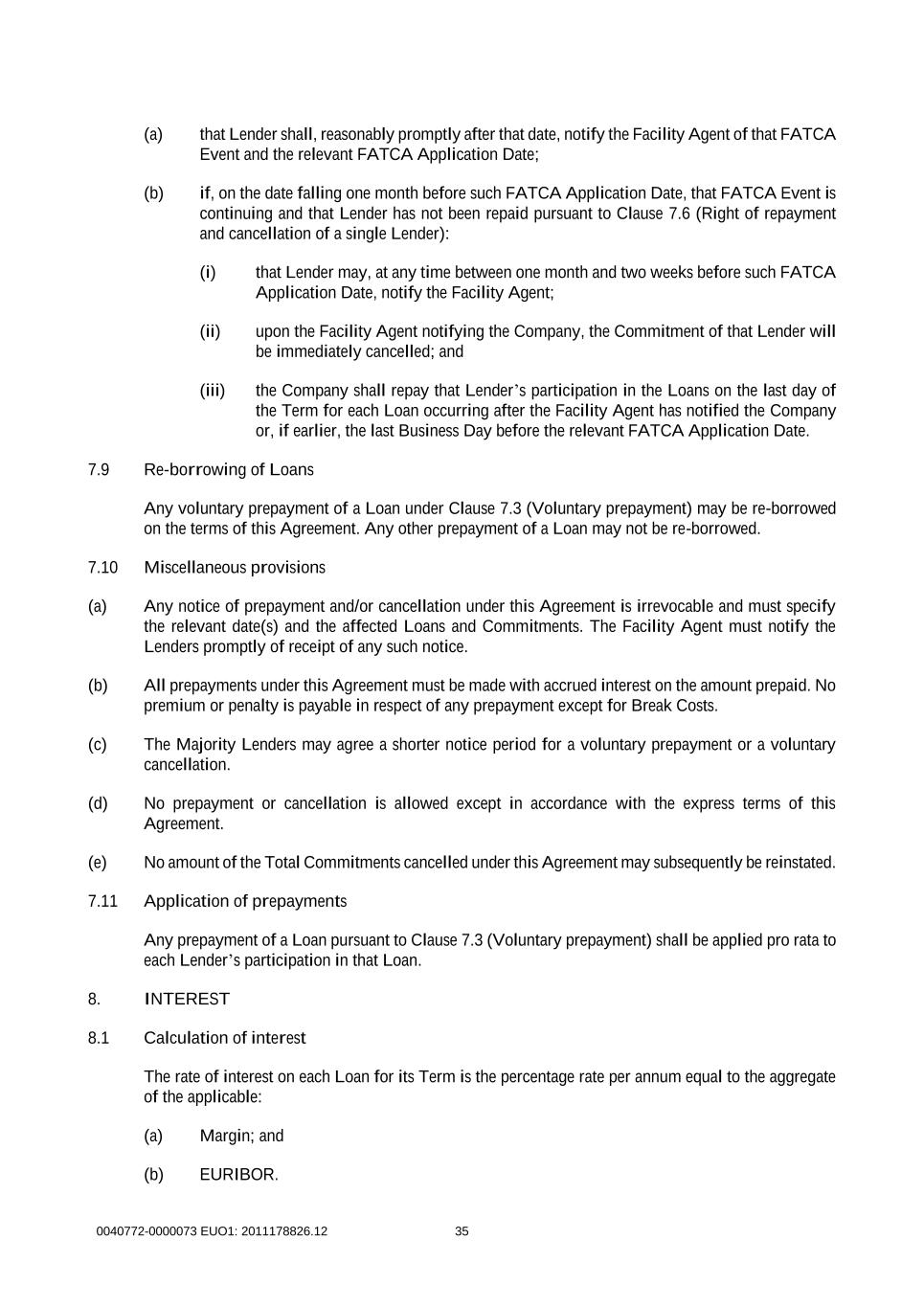 0040772-0000056 EUO3: 2014944768.4 32 Syndicated Facility Agreement (the Cancellation Percentage) and the date of that Syndicated Facility Agreement Cancellation Event. (b) The Total Commitment will be automatically cancelled on the date falling five Business Days following such Syndicated Facility Agreement Cancellation Event in a proportion equal to the Cancellation Percentage. (c) If the amount of any Loans outstanding would exceed the Total Commitment after the cancellation in paragraph (b) above, the Company shall, on the date falling no later than immediately prior to the cancellation of the Total Commitment in accordance with paragraph (a) above, prepay sufficient amounts outstanding under the Loans in order for the amount outstanding to not exceed the Total Commitment after the cancellation in paragraph (b) above. In this Clause 11.7, Syndicated Facility Agreement Cancellation Event means any of the commitments being cancelled, in whole or in part, under the Syndicated Facility Agreement. 11.8 Re-borrowing of Credits Any voluntary prepayment of a Credit under Clause 11.3 (Voluntary prepayment) may be re-borrowed subject to the terms of this Agreement. Any mandatory or involuntary prepayment of a Credit may not be re-borrowed. 11.9 Miscellaneous provisions (a) Any notice of prepayment and/or cancellation under this Agreement is irrevocable and must specify the relevant date(s) and the affected Credits, and, in case of cancellation, if any of the affected Credit is an Overdraft, how the Permitted Debit Balance on the relevant Current Account has been reduced. (b) All prepayments under this Agreement must be made with accrued interest on the amount prepaid. No premium or penalty is payable in respect of any prepayment except for Break Costs. (c) The Lender may agree a shorter notice period for a voluntary prepayment or a voluntary cancellation. (d) No prepayment or cancellation is allowed except in accordance with the express terms of this Agreement. (e) No amount of the Total Commitment cancelled under this Agreement may subsequently be reinstated. 11A. RATE SWITCH 11A.1 Switch to Compounded Reference Rate Subject to Clause 11A.2 (Delayed switch for existing Term Rate Overdrafts and Term Rate Revolving Loans), on and from the Rate Switch Date for a Rate Switch Currency: (a) use of the Compounded Reference Rate will replace the use of the Term Reference Rate for the calculation of interest for Loans in that Rate Switch Currency; and (b) any Loan in that Rate Switch Currency shall be a "Compounded Rate Loan" and Clause 12.3 (Calculation of interest – Compounded Rate Loans) shall apply to each such Loan.