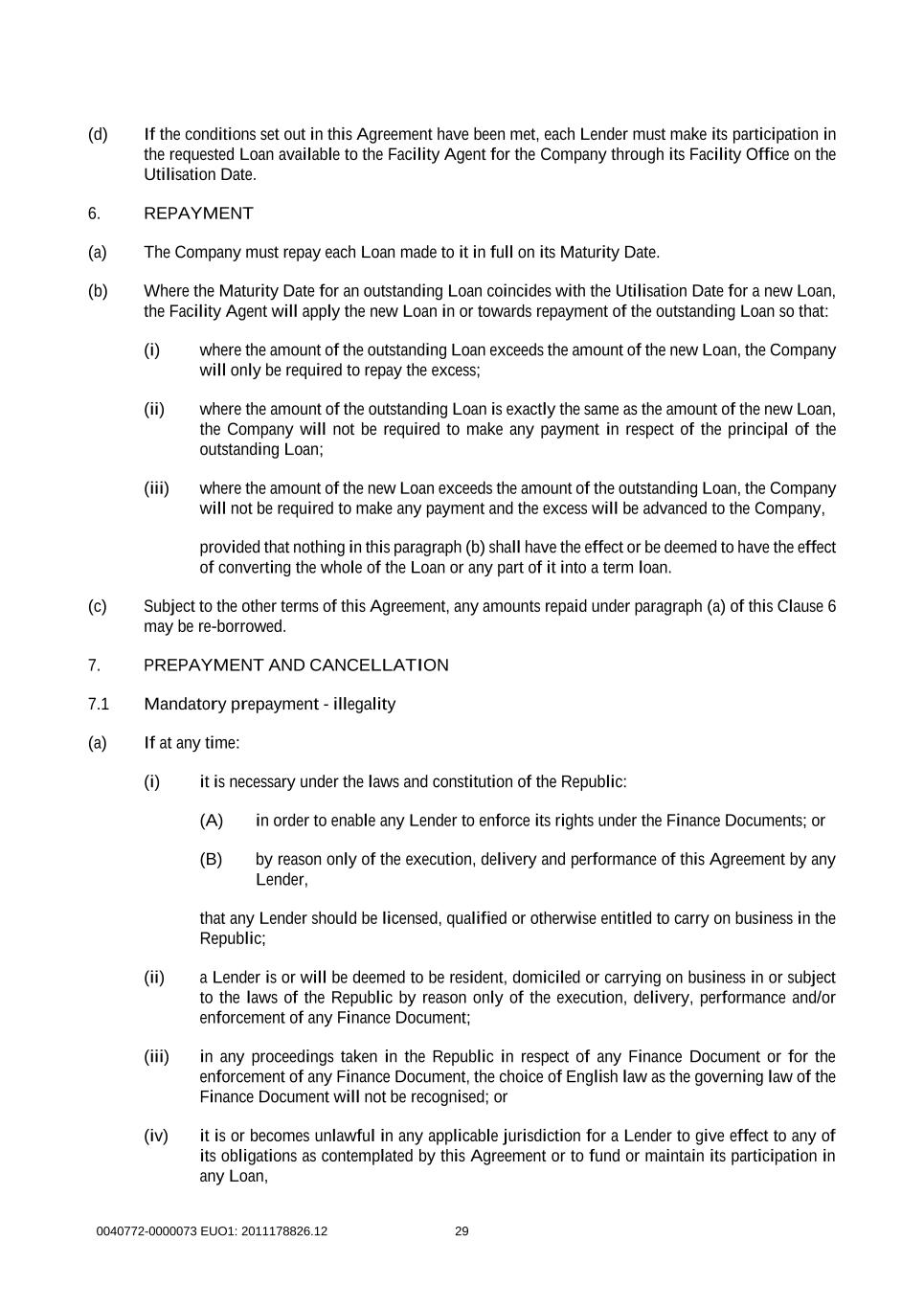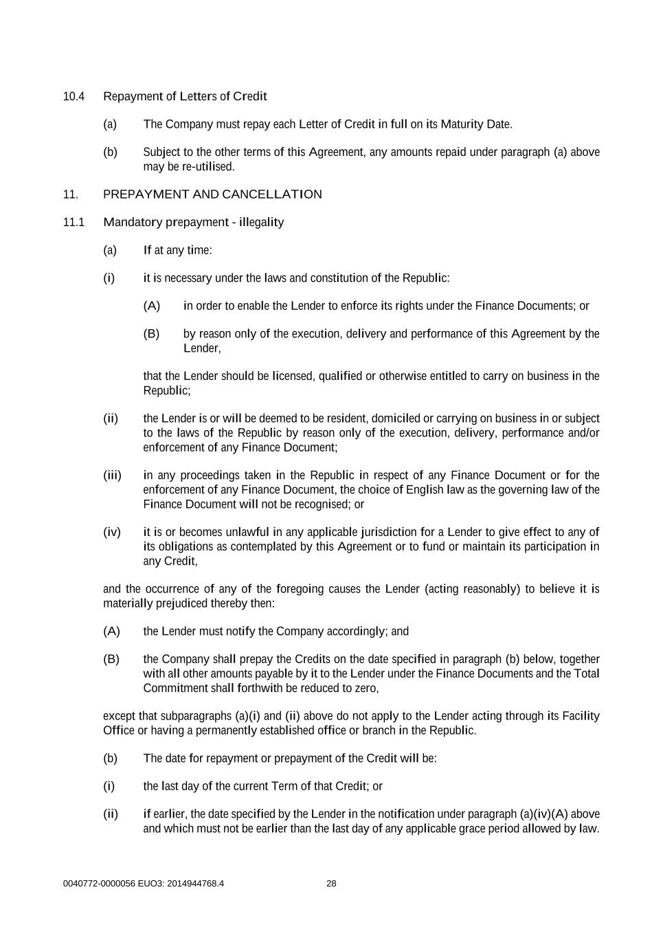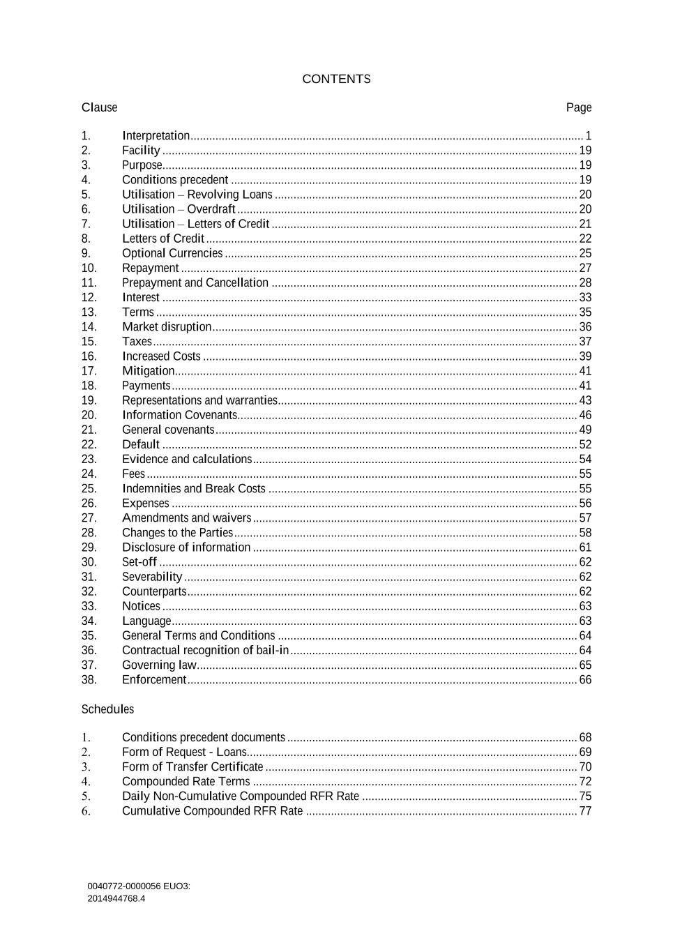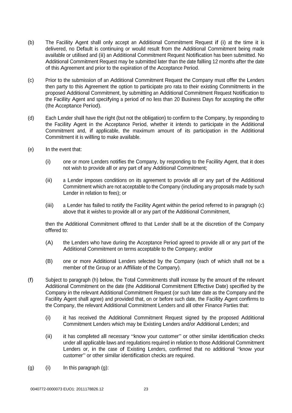 0040772-0000056 EUO3: 2014944768.4 32 Syndicated Facility Agreement (the Cancellation Percentage) and the date of that Syndicated Facility Agreement Cancellation Event. (b) The Total Commitment will be automatically cancelled on the date falling five Business Days following such Syndicated Facility Agreement Cancellation Event in a proportion equal to the Cancellation Percentage. (c) If the amount of any Loans outstanding would exceed the Total Commitment after the cancellation in paragraph (b) above, the Company shall, on the date falling no later than immediately prior to the cancellation of the Total Commitment in accordance with paragraph (a) above, prepay sufficient amounts outstanding under the Loans in order for the amount outstanding to not exceed the Total Commitment after the cancellation in paragraph (b) above. In this Clause 11.7, Syndicated Facility Agreement Cancellation Event means any of the commitments being cancelled, in whole or in part, under the Syndicated Facility Agreement. 11.8 Re-borrowing of Credits Any voluntary prepayment of a Credit under Clause 11.3 (Voluntary prepayment) may be re-borrowed subject to the terms of this Agreement. Any mandatory or involuntary prepayment of a Credit may not be re-borrowed. 11.9 Miscellaneous provisions (a) Any notice of prepayment and/or cancellation under this Agreement is irrevocable and must specify the relevant date(s) and the affected Credits, and, in case of cancellation, if any of the affected Credit is an Overdraft, how the Permitted Debit Balance on the relevant Current Account has been reduced. (b) All prepayments under this Agreement must be made with accrued interest on the amount prepaid. No premium or penalty is payable in respect of any prepayment except for Break Costs. (c) The Lender may agree a shorter notice period for a voluntary prepayment or a voluntary cancellation. (d) No prepayment or cancellation is allowed except in accordance with the express terms of this Agreement. (e) No amount of the Total Commitment cancelled under this Agreement may subsequently be reinstated. 11A. RATE SWITCH 11A.1 Switch to Compounded Reference Rate Subject to Clause 11A.2 (Delayed switch for existing Term Rate Overdrafts and Term Rate Revolving Loans), on and from the Rate Switch Date for a Rate Switch Currency: (a) use of the Compounded Reference Rate will replace the use of the Term Reference Rate for the calculation of interest for Loans in that Rate Switch Currency; and (b) any Loan in that Rate Switch Currency shall be a "Compounded Rate Loan" and Clause 12.3 (Calculation of interest – Compounded Rate Loans) shall apply to each such Loan.