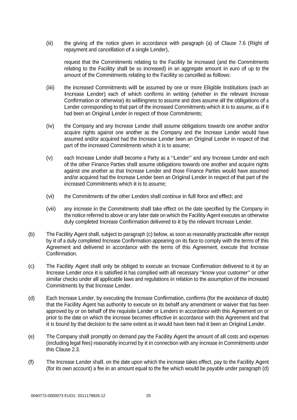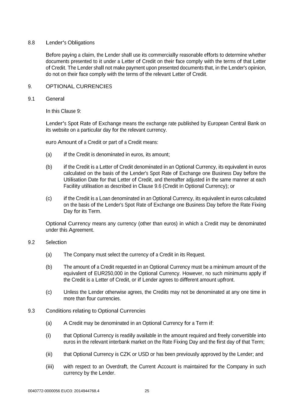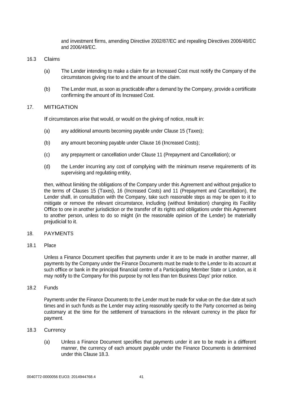 0040772-0000056 EUO3: 2014944768.4 41 and investment firms, amending Directive 2002/87/EC and repealing Directives 2006/48/EC and 2006/49/EC. 16.3 Claims (a) The Lender intending to make a claim for an Increased Cost must notify the Company of the circumstances giving rise to and the amount of the claim. (b) The Lender must, as soon as practicable after a demand by the Company, provide a certificate confirming the amount of its Increased Cost. 17. MITIGATION If circumstances arise that would, or would on the giving of notice, result in: (a) any additional amounts becoming payable under Clause 15 (Taxes); (b) any amount becoming payable under Clause 16 (Increased Costs); (c) any prepayment or cancellation under Clause 11 (Prepayment and Cancellation); or (d) the Lender incurring any cost of complying with the minimum reserve requirements of its supervising and regulating entity, then, without limiting the obligations of the Company under this Agreement and without prejudice to the terms of Clauses 15 (Taxes), 16 (Increased Costs) and 11 (Prepayment and Cancellation), the Lender shall, in consultation with the Company, take such reasonable steps as may be open to it to mitigate or remove the relevant circumstance, including (without limitation) changing its Facility Office to one in another jurisdiction or the transfer of its rights and obligations under this Agreement to another person, unless to do so might (in the reasonable opinion of the Lender) be materially prejudicial to it. 18. PAYMENTS 18.1 Place Unless a Finance Document specifies that payments under it are to be made in another manner, all payments by the Company under the Finance Documents must be made to the Lender to its account at such office or bank in the principal financial centre of a Participating Member State or London, as it may notify to the Company for this purpose by not less than ten Business Days' prior notice. 18.2 Funds Payments under the Finance Documents to the Lender must be made for value on the due date at such times and in such funds as the Lender may acting reasonably specify to the Party concerned as being customary at the time for the settlement of transactions in the relevant currency in the place for payment. 18.3 Currency (a) Unless a Finance Document specifies that payments under it are to be made in a different manner, the currency of each amount payable under the Finance Documents is determined under this Clause 18.3.