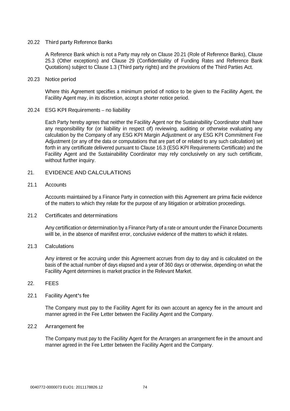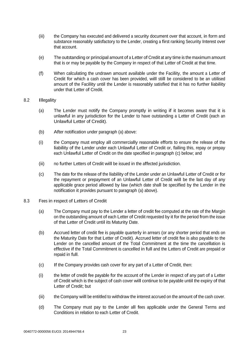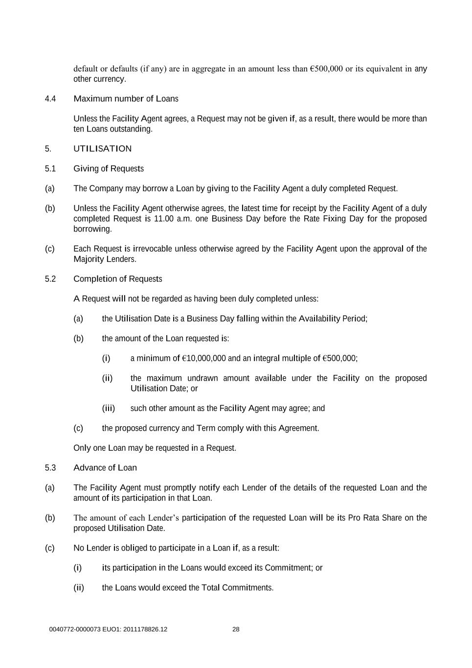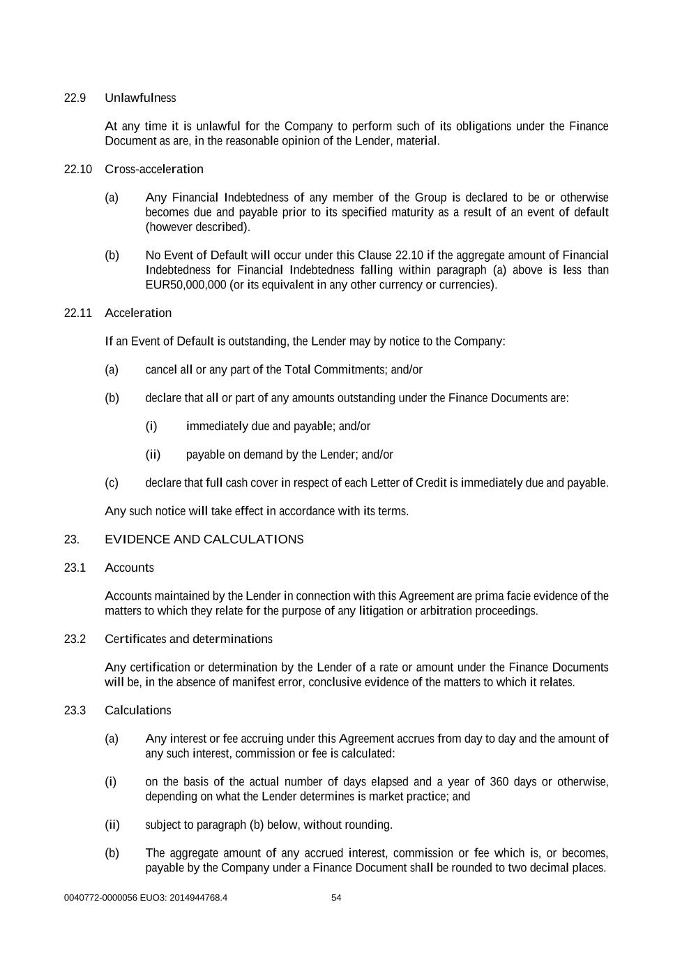 0040772-0000056 EUO3: 2014944768.4 54 22.9 Unlawfulness At any time it is unlawful for the Company to perform such of its obligations under the Finance Document as are, in the reasonable opinion of the Lender, material. 22.10 Cross-acceleration (a) Any Financial Indebtedness of any member of the Group is declared to be or otherwise becomes due and payable prior to its specified maturity as a result of an event of default (however described). (b) No Event of Default will occur under this Clause 22.10 if the aggregate amount of Financial Indebtedness for Financial Indebtedness falling within paragraph (a) above is less than EUR50,000,000 (or its equivalent in any other currency or currencies). 22.11 Acceleration If an Event of Default is outstanding, the Lender may by notice to the Company: (a) cancel all or any part of the Total Commitments; and/or (b) declare that all or part of any amounts outstanding under the Finance Documents are: (i) immediately due and payable; and/or (ii) payable on demand by the Lender; and/or (c) declare that full cash cover in respect of each Letter of Credit is immediately due and payable. Any such notice will take effect in accordance with its terms. 23. EVIDENCE AND CALCULATIONS 23.1 Accounts Accounts maintained by the Lender in connection with this Agreement are prima facie evidence of the matters to which they relate for the purpose of any litigation or arbitration proceedings. 23.2 Certificates and determinations Any certification or determination by the Lender of a rate or amount under the Finance Documents will be, in the absence of manifest error, conclusive evidence of the matters to which it relates. 23.3 Calculations (a) Any interest or fee accruing under this Agreement accrues from day to day and the amount of any such interest, commission or fee is calculated: (i) on the basis of the actual number of days elapsed and a year of 360 days or otherwise, depending on what the Lender determines is market practice; and (ii) subject to paragraph (b) below, without rounding. (b) The aggregate amount of any accrued interest, commission or fee which is, or becomes, payable by the Company under a Finance Document shall be rounded to two decimal places.