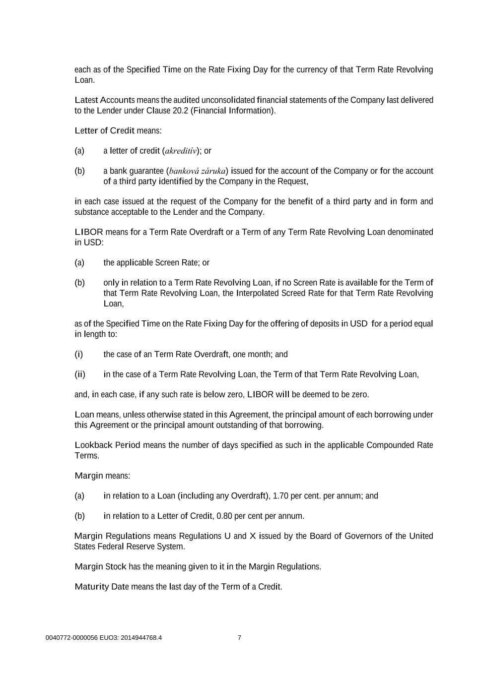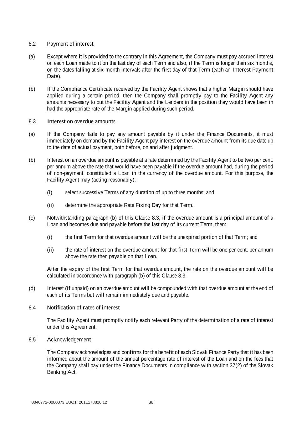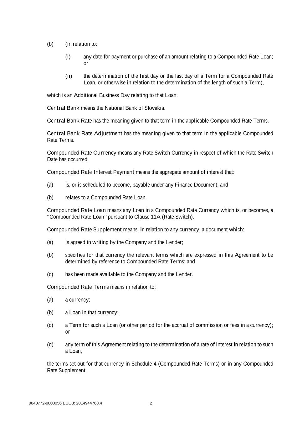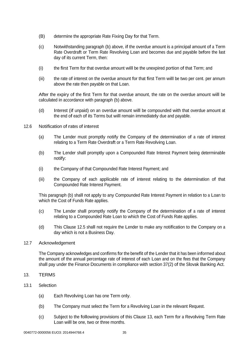 0040772-0000056 EUO3: 2014944768.4 35 (B) determine the appropriate Rate Fixing Day for that Term. (c) Notwithstanding paragraph (b) above, if the overdue amount is a principal amount of a Term Rate Overdraft or Term Rate Revolving Loan and becomes due and payable before the last day of its current Term, then: (i) the first Term for that overdue amount will be the unexpired portion of that Term; and (ii) the rate of interest on the overdue amount for that first Term will be two per cent. per annum above the rate then payable on that Loan. After the expiry of the first Term for that overdue amount, the rate on the overdue amount will be calculated in accordance with paragraph (b) above. (d) Interest (if unpaid) on an overdue amount will be compounded with that overdue amount at the end of each of its Terms but will remain immediately due and payable. 12.6 Notification of rates of interest (a) The Lender must promptly notify the Company of the determination of a rate of interest relating to a Term Rate Overdraft or a Term Rate Revolving Loan. (b) The Lender shall promptly upon a Compounded Rate Interest Payment being determinable notify: (i) the Company of that Compounded Rate Interest Payment; and (ii) the Company of each applicable rate of interest relating to the determination of that Compounded Rate Interest Payment. This paragraph (b) shall not apply to any Compounded Rate Interest Payment in relation to a Loan to which the Cost of Funds Rate applies. (c) The Lender shall promptly notify the Company of the determination of a rate of interest relating to a Compounded Rate Loan to which the Cost of Funds Rate applies. (d) This Clause 12.5 shall not require the Lender to make any notification to the Company on a day which is not a Business Day. 12.7 Acknowledgement The Company acknowledges and confirms for the benefit of the Lender that it has been informed about the amount of the annual percentage rate of interest of each Loan and on the fees that the Company shall pay under the Finance Documents in compliance with section 37(2) of the Slovak Banking Act. 13. TERMS 13.1 Selection (a) Each Revolving Loan has one Term only. (b) The Company must select the Term for a Revolving Loan in the relevant Request. (c) Subject to the following provisions of this Clause 13, each Term for a Revolving Term Rate Loan will be one, two or three months.