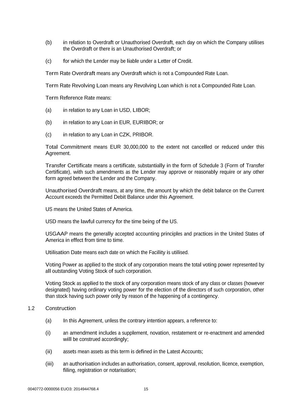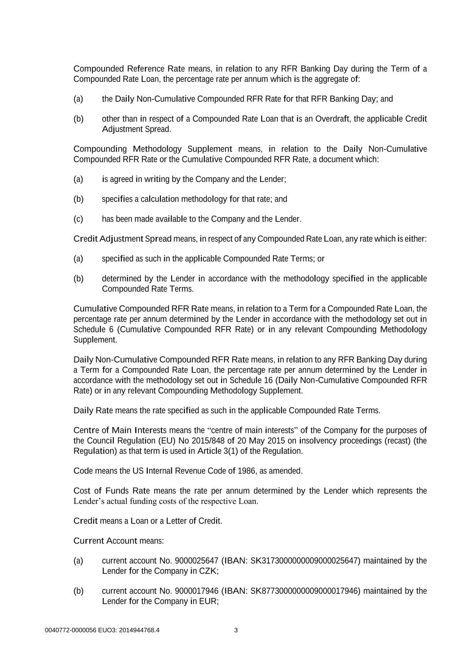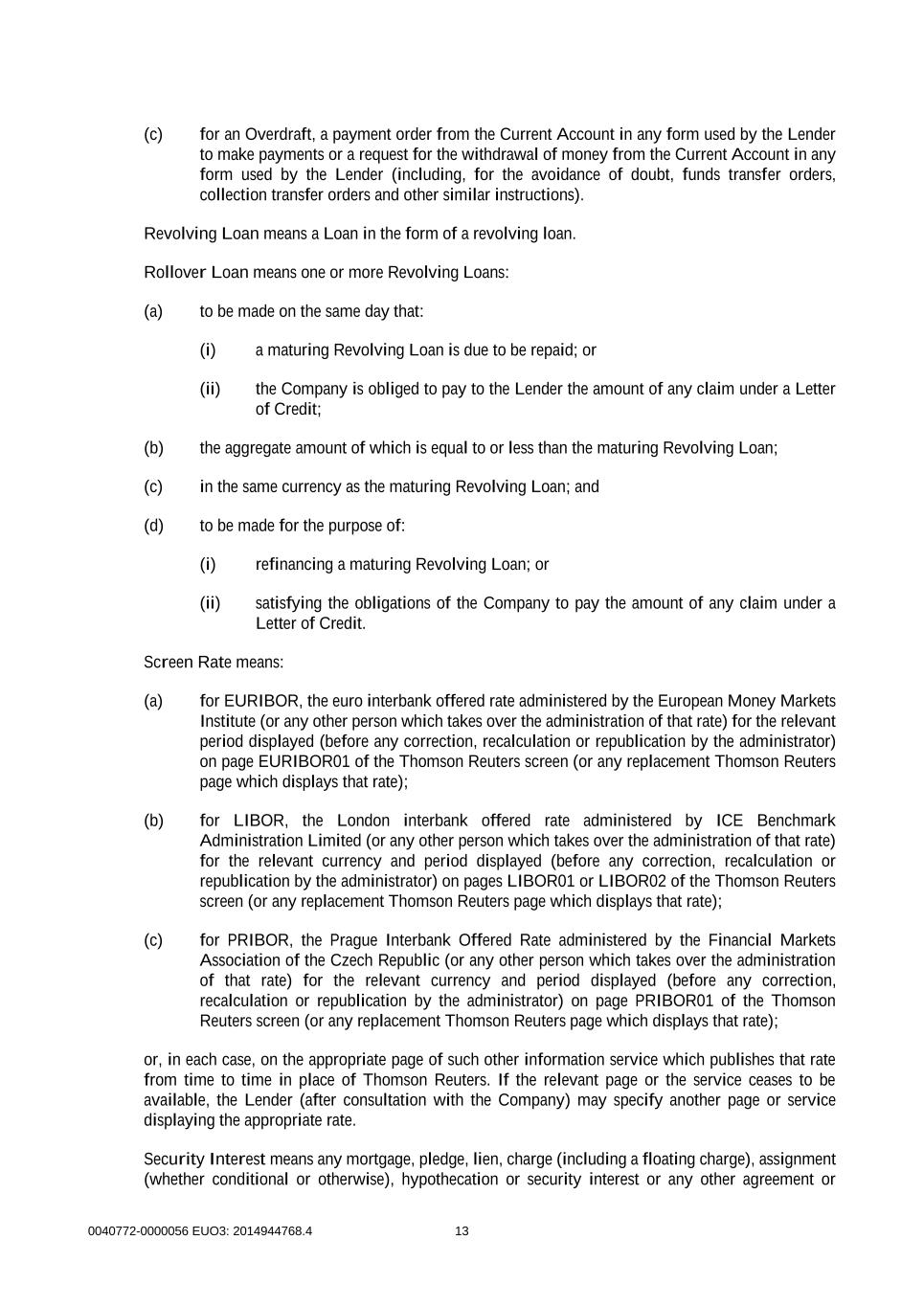 0040772-0000056 EUO3: 2014944768.4 35 (B) determine the appropriate Rate Fixing Day for that Term. (c) Notwithstanding paragraph (b) above, if the overdue amount is a principal amount of a Term Rate Overdraft or Term Rate Revolving Loan and becomes due and payable before the last day of its current Term, then: (i) the first Term for that overdue amount will be the unexpired portion of that Term; and (ii) the rate of interest on the overdue amount for that first Term will be two per cent. per annum above the rate then payable on that Loan. After the expiry of the first Term for that overdue amount, the rate on the overdue amount will be calculated in accordance with paragraph (b) above. (d) Interest (if unpaid) on an overdue amount will be compounded with that overdue amount at the end of each of its Terms but will remain immediately due and payable. 12.6 Notification of rates of interest (a) The Lender must promptly notify the Company of the determination of a rate of interest relating to a Term Rate Overdraft or a Term Rate Revolving Loan. (b) The Lender shall promptly upon a Compounded Rate Interest Payment being determinable notify: (i) the Company of that Compounded Rate Interest Payment; and (ii) the Company of each applicable rate of interest relating to the determination of that Compounded Rate Interest Payment. This paragraph (b) shall not apply to any Compounded Rate Interest Payment in relation to a Loan to which the Cost of Funds Rate applies. (c) The Lender shall promptly notify the Company of the determination of a rate of interest relating to a Compounded Rate Loan to which the Cost of Funds Rate applies. (d) This Clause 12.5 shall not require the Lender to make any notification to the Company on a day which is not a Business Day. 12.7 Acknowledgement The Company acknowledges and confirms for the benefit of the Lender that it has been informed about the amount of the annual percentage rate of interest of each Loan and on the fees that the Company shall pay under the Finance Documents in compliance with section 37(2) of the Slovak Banking Act. 13. TERMS 13.1 Selection (a) Each Revolving Loan has one Term only. (b) The Company must select the Term for a Revolving Loan in the relevant Request. (c) Subject to the following provisions of this Clause 13, each Term for a Revolving Term Rate Loan will be one, two or three months.