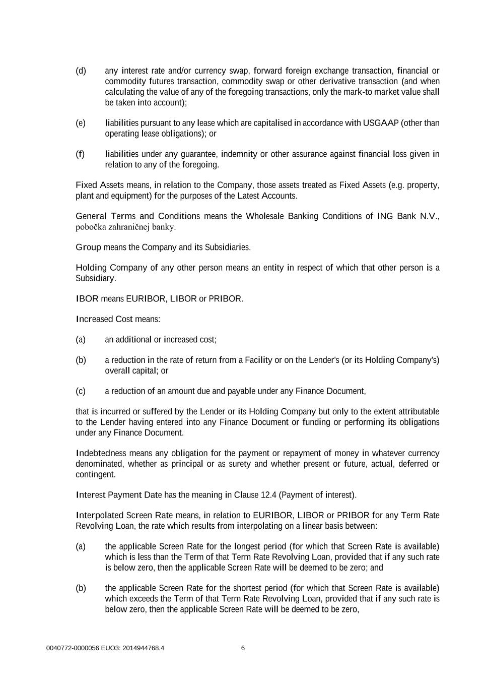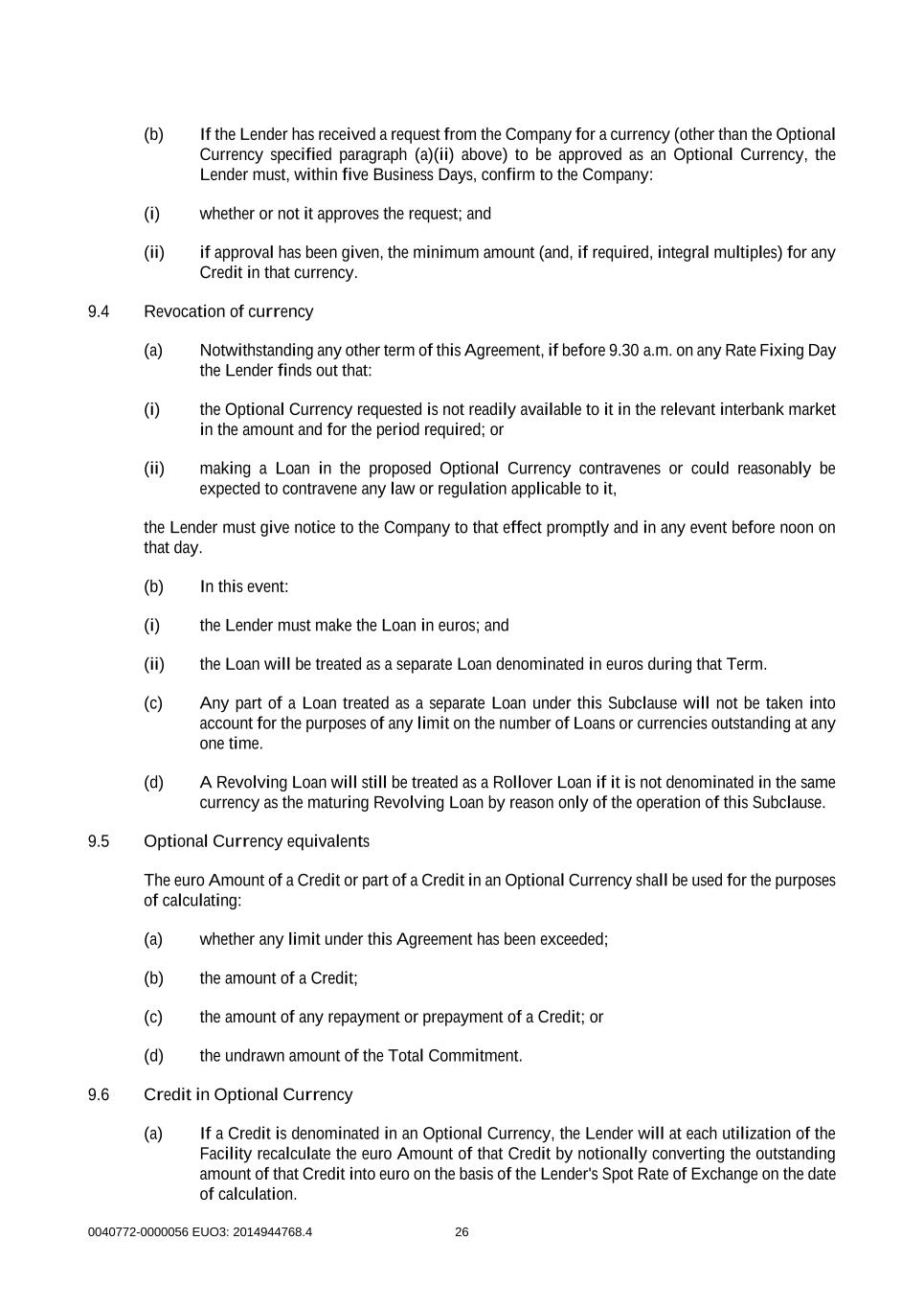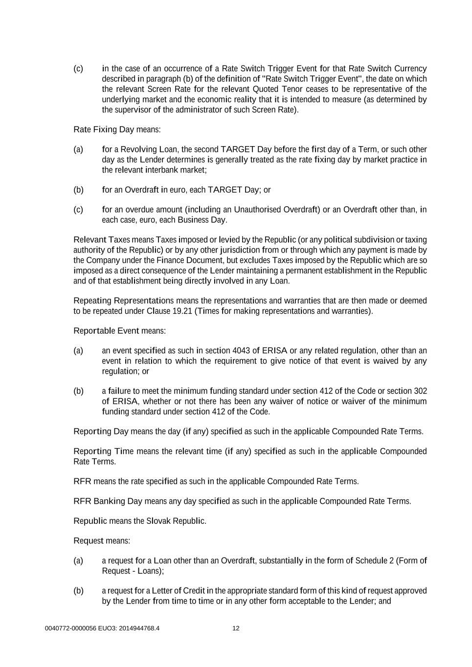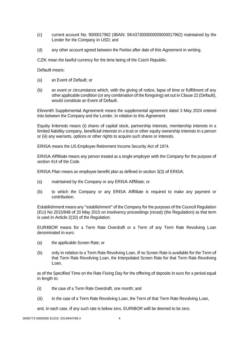 0040772-0000056 EUO3: 2014944768.4 35 (B) determine the appropriate Rate Fixing Day for that Term. (c) Notwithstanding paragraph (b) above, if the overdue amount is a principal amount of a Term Rate Overdraft or Term Rate Revolving Loan and becomes due and payable before the last day of its current Term, then: (i) the first Term for that overdue amount will be the unexpired portion of that Term; and (ii) the rate of interest on the overdue amount for that first Term will be two per cent. per annum above the rate then payable on that Loan. After the expiry of the first Term for that overdue amount, the rate on the overdue amount will be calculated in accordance with paragraph (b) above. (d) Interest (if unpaid) on an overdue amount will be compounded with that overdue amount at the end of each of its Terms but will remain immediately due and payable. 12.6 Notification of rates of interest (a) The Lender must promptly notify the Company of the determination of a rate of interest relating to a Term Rate Overdraft or a Term Rate Revolving Loan. (b) The Lender shall promptly upon a Compounded Rate Interest Payment being determinable notify: (i) the Company of that Compounded Rate Interest Payment; and (ii) the Company of each applicable rate of interest relating to the determination of that Compounded Rate Interest Payment. This paragraph (b) shall not apply to any Compounded Rate Interest Payment in relation to a Loan to which the Cost of Funds Rate applies. (c) The Lender shall promptly notify the Company of the determination of a rate of interest relating to a Compounded Rate Loan to which the Cost of Funds Rate applies. (d) This Clause 12.5 shall not require the Lender to make any notification to the Company on a day which is not a Business Day. 12.7 Acknowledgement The Company acknowledges and confirms for the benefit of the Lender that it has been informed about the amount of the annual percentage rate of interest of each Loan and on the fees that the Company shall pay under the Finance Documents in compliance with section 37(2) of the Slovak Banking Act. 13. TERMS 13.1 Selection (a) Each Revolving Loan has one Term only. (b) The Company must select the Term for a Revolving Loan in the relevant Request. (c) Subject to the following provisions of this Clause 13, each Term for a Revolving Term Rate Loan will be one, two or three months.