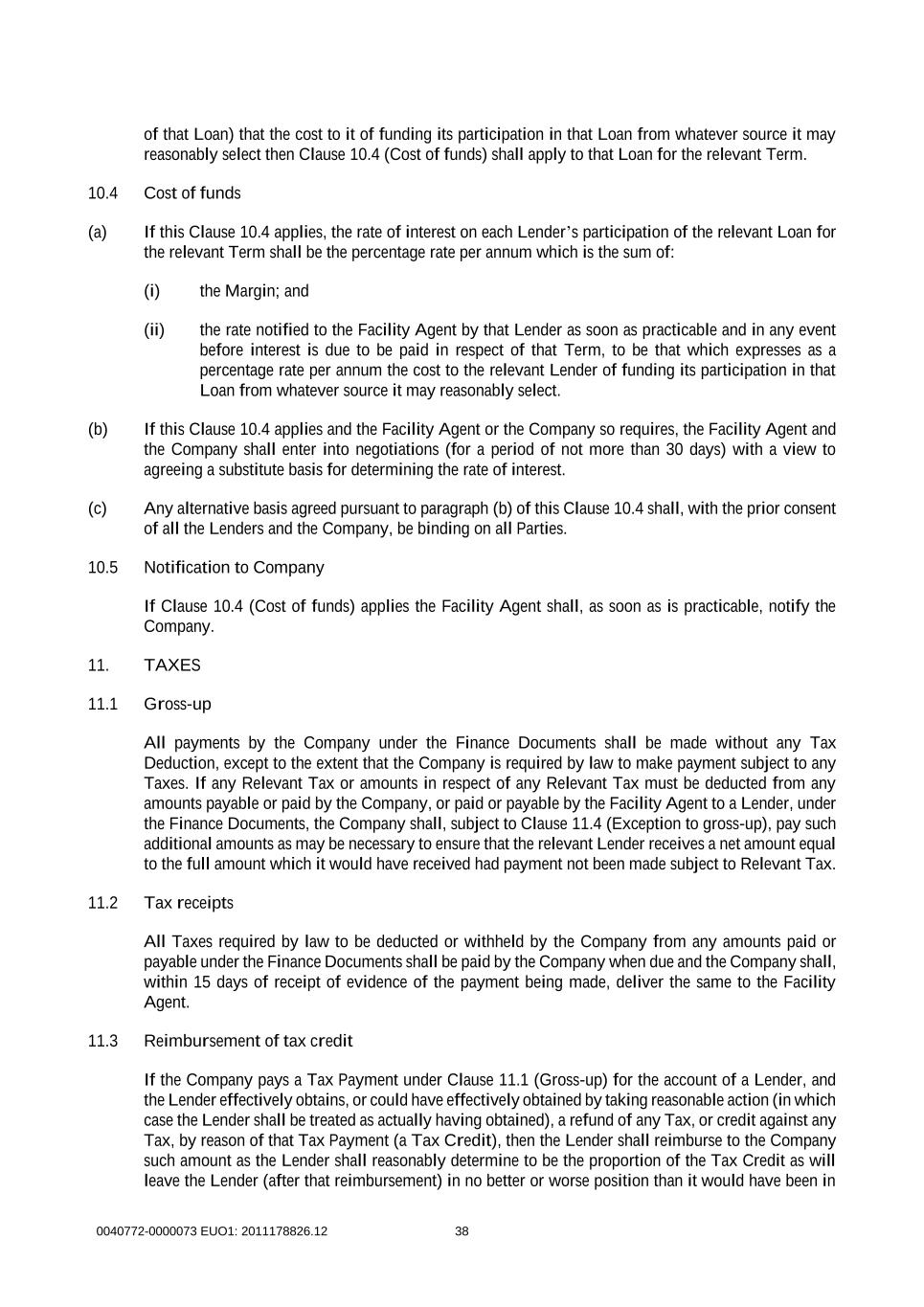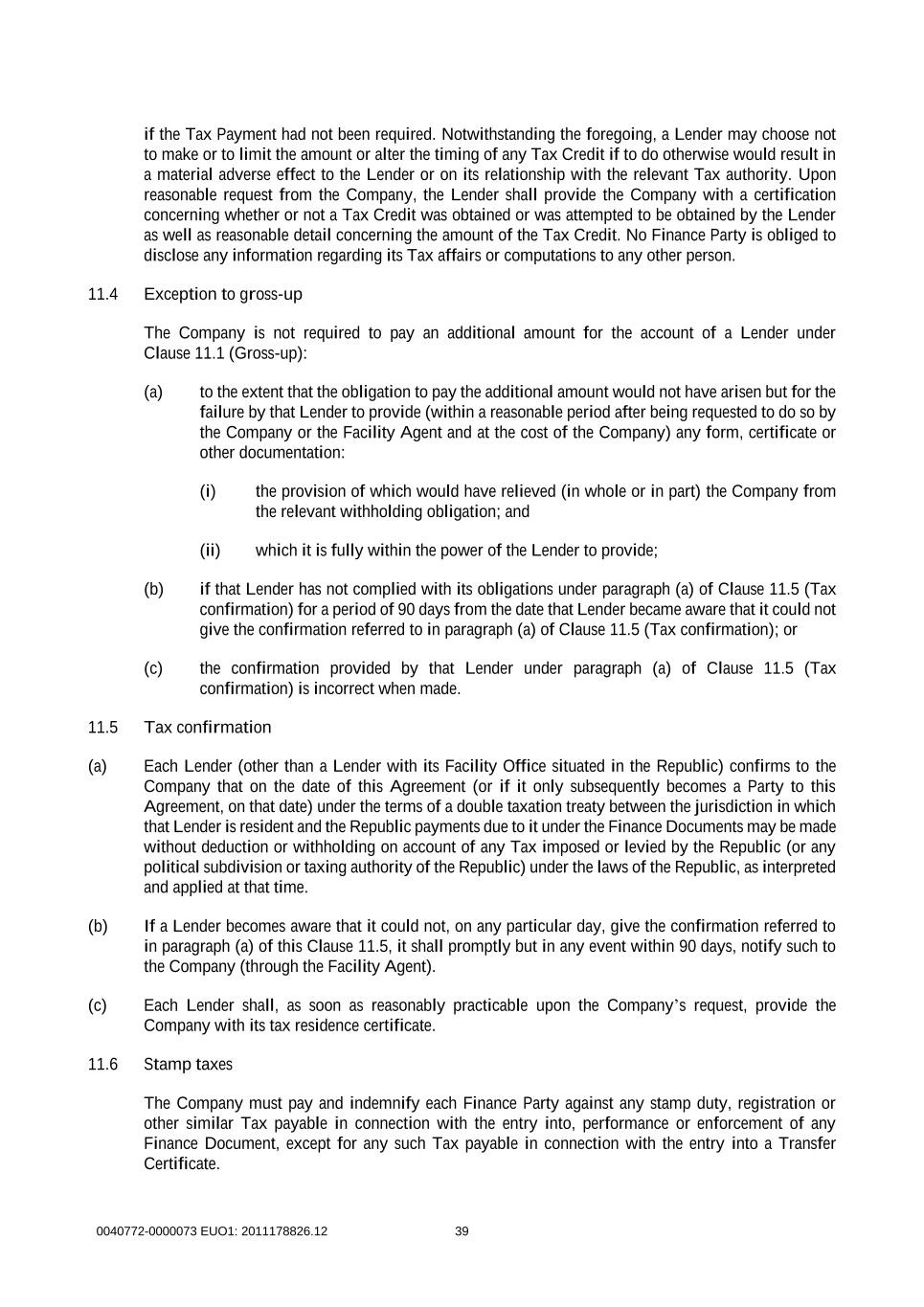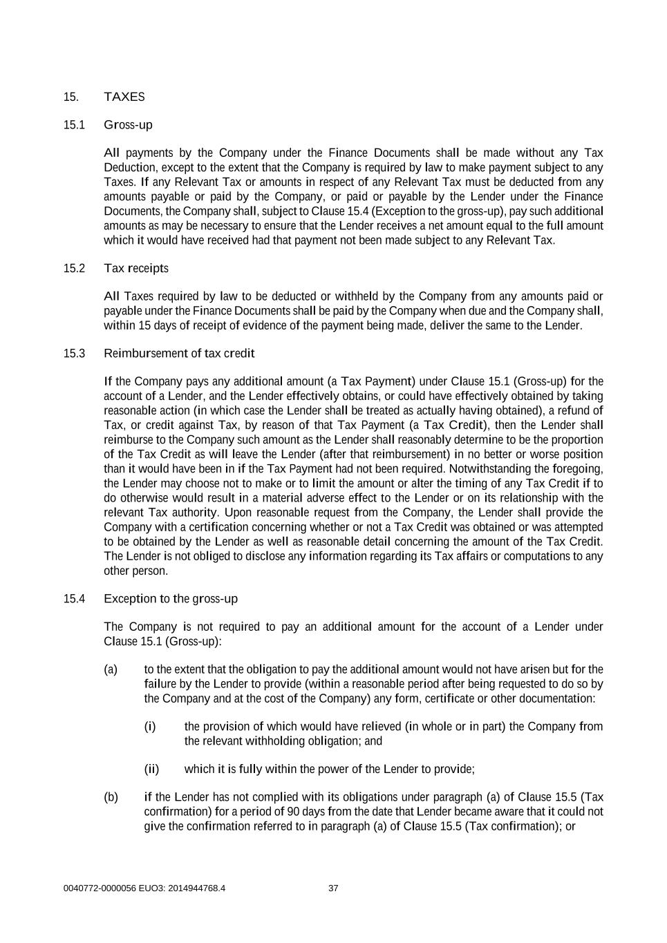 0040772-0000056 EUO3: 2014944768.4 37 15. TAXES 15.1 Gross-up All payments by the Company under the Finance Documents shall be made without any Tax Deduction, except to the extent that the Company is required by law to make payment subject to any Taxes. If any Relevant Tax or amounts in respect of any Relevant Tax must be deducted from any amounts payable or paid by the Company, or paid or payable by the Lender under the Finance Documents, the Company shall, subject to Clause 15.4 (Exception to the gross-up), pay such additional amounts as may be necessary to ensure that the Lender receives a net amount equal to the full amount which it would have received had that payment not been made subject to any Relevant Tax. 15.2 Tax receipts All Taxes required by law to be deducted or withheld by the Company from any amounts paid or payable under the Finance Documents shall be paid by the Company when due and the Company shall, within 15 days of receipt of evidence of the payment being made, deliver the same to the Lender. 15.3 Reimbursement of tax credit If the Company pays any additional amount (a Tax Payment) under Clause 15.1 (Gross-up) for the account of a Lender, and the Lender effectively obtains, or could have effectively obtained by taking reasonable action (in which case the Lender shall be treated as actually having obtained), a refund of Tax, or credit against Tax, by reason of that Tax Payment (a Tax Credit), then the Lender shall reimburse to the Company such amount as the Lender shall reasonably determine to be the proportion of the Tax Credit as will leave the Lender (after that reimbursement) in no better or worse position than it would have been in if the Tax Payment had not been required. Notwithstanding the foregoing, the Lender may choose not to make or to limit the amount or alter the timing of any Tax Credit if to do otherwise would result in a material adverse effect to the Lender or on its relationship with the relevant Tax authority. Upon reasonable request from the Company, the Lender shall provide the Company with a certification concerning whether or not a Tax Credit was obtained or was attempted to be obtained by the Lender as well as reasonable detail concerning the amount of the Tax Credit. The Lender is not obliged to disclose any information regarding its Tax affairs or computations to any other person. 15.4 Exception to the gross-up The Company is not required to pay an additional amount for the account of a Lender under Clause 15.1 (Gross-up): (a) to the extent that the obligation to pay the additional amount would not have arisen but for the failure by the Lender to provide (within a reasonable period after being requested to do so by the Company and at the cost of the Company) any form, certificate or other documentation: (i) the provision of which would have relieved (in whole or in part) the Company from the relevant withholding obligation; and (ii) which it is fully within the power of the Lender to provide; (b) if the Lender has not complied with its obligations under paragraph (a) of Clause 15.5 (Tax confirmation) for a period of 90 days from the date that Lender became aware that it could not give the confirmation referred to in paragraph (a) of Clause 15.5 (Tax confirmation); or