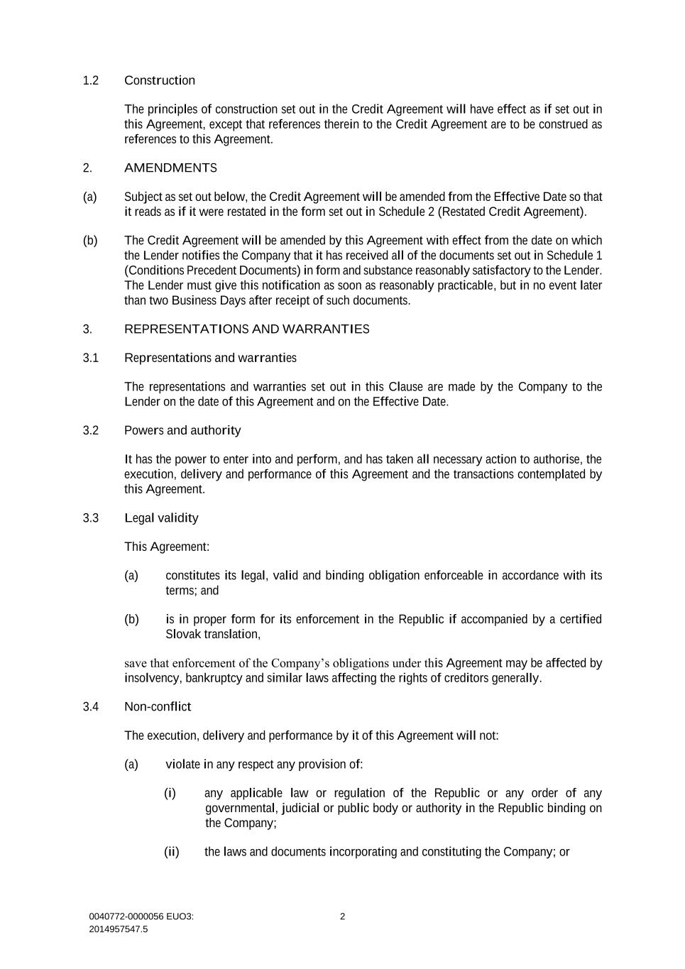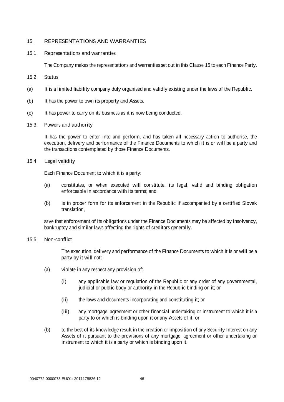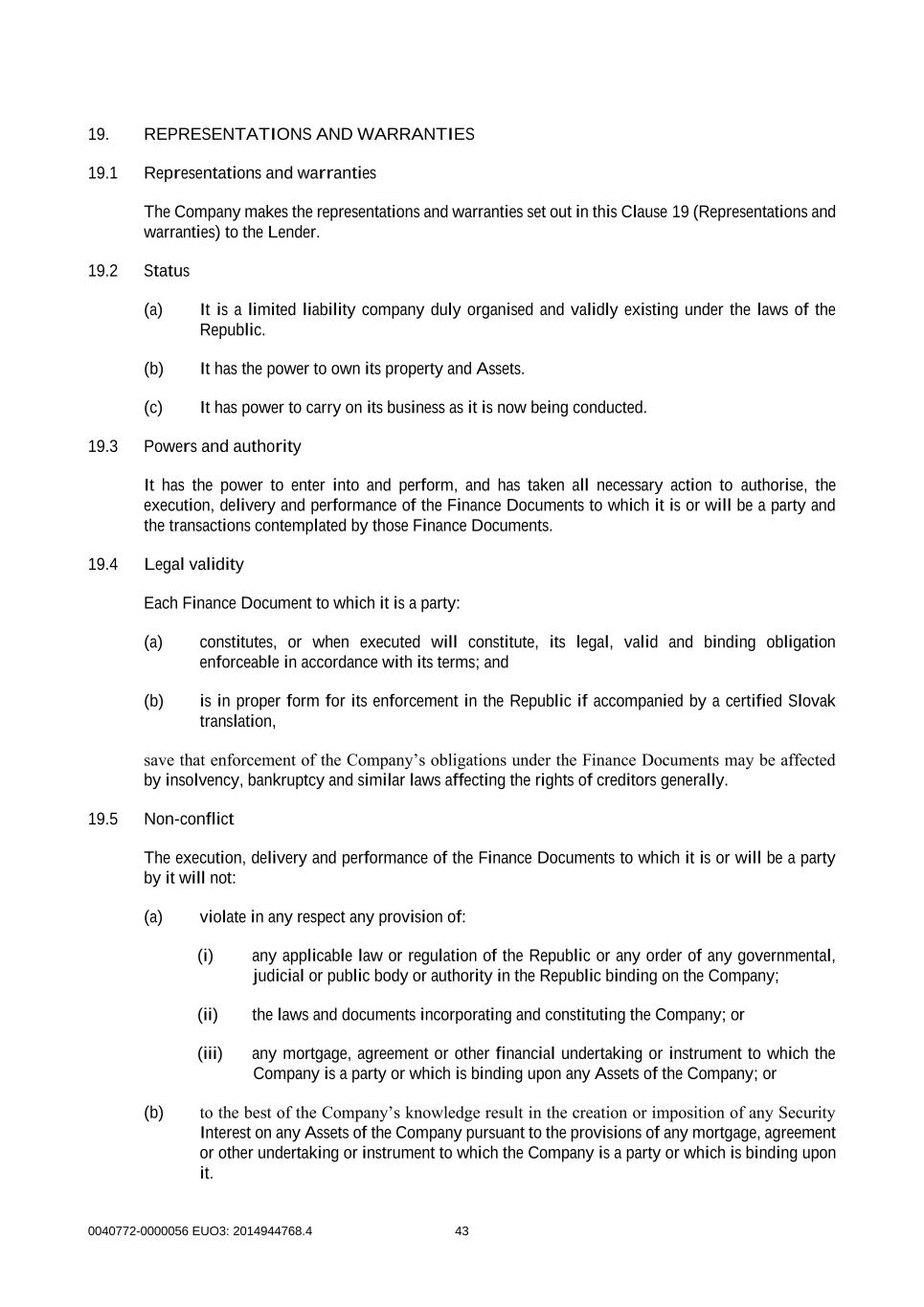 0040772-0000056 EUO3: 2014944768.4 43 19. REPRESENTATIONS AND WARRANTIES 19.1 Representations and warranties The Company makes the representations and warranties set out in this Clause 19 (Representations and warranties) to the Lender. 19.2 Status (a) It is a limited liability company duly organised and validly existing under the laws of the Republic. (b) It has the power to own its property and Assets. (c) It has power to carry on its business as it is now being conducted. 19.3 Powers and authority It has the power to enter into and perform, and has taken all necessary action to authorise, the execution, delivery and performance of the Finance Documents to which it is or will be a party and the transactions contemplated by those Finance Documents. 19.4 Legal validity Each Finance Document to which it is a party: (a) constitutes, or when executed will constitute, its legal, valid and binding obligation enforceable in accordance with its terms; and (b) is in proper form for its enforcement in the Republic if accompanied by a certified Slovak translation, save that enforcement of the Company’s obligations under the Finance Documents may be affected by insolvency, bankruptcy and similar laws affecting the rights of creditors generally. 19.5 Non-conflict The execution, delivery and performance of the Finance Documents to which it is or will be a party by it will not: (a) violate in any respect any provision of: (i) any applicable law or regulation of the Republic or any order of any governmental, judicial or public body or authority in the Republic binding on the Company; (ii) the laws and documents incorporating and constituting the Company; or (iii) any mortgage, agreement or other financial undertaking or instrument to which the Company is a party or which is binding upon any Assets of the Company; or (b) to the best of the Company’s knowledge result in the creation or imposition of any Security Interest on any Assets of the Company pursuant to the provisions of any mortgage, agreement or other undertaking or instrument to which the Company is a party or which is binding upon it.