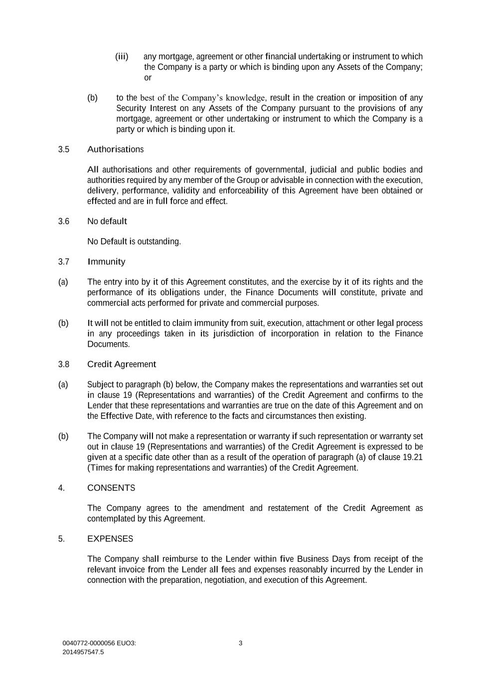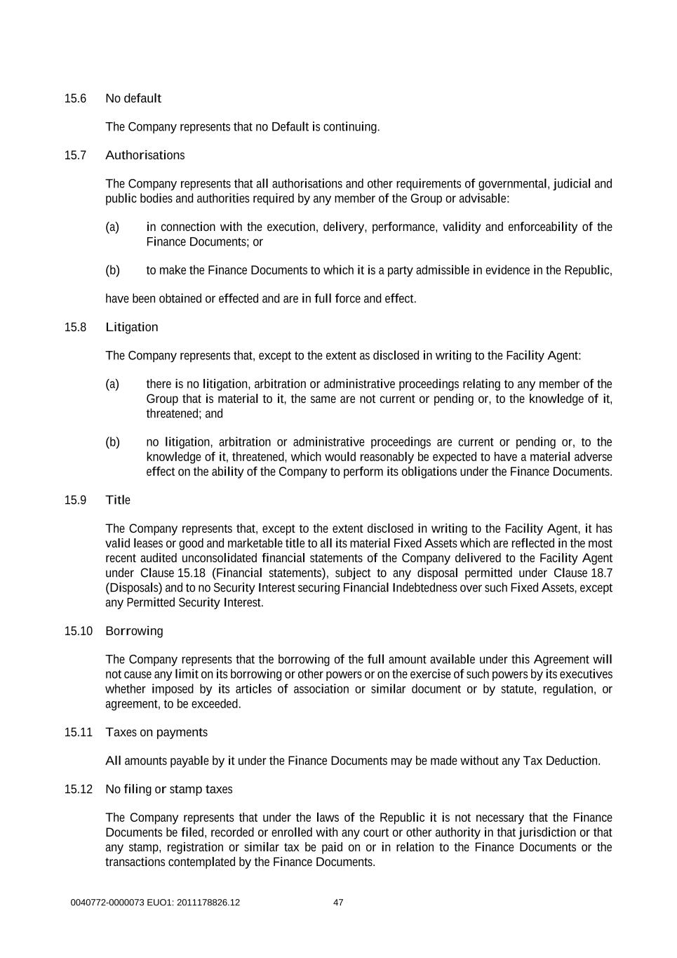 0040772-0000056 EUO3: 2014944768.4 44 19.6 No default No Default is outstanding. 19.7 Authorisations All authorisations and other requirements of governmental, judicial and public bodies and authorities required by any member of the Group or advisable in connection with the execution, delivery, performance, validity and enforceability of the Finance Documents have been obtained or effected and are in full force and effect. 19.8 Litigation Except to the extent as disclosed in writing to the Lender: (a) there is no litigation, arbitration or administrative proceedings relating to any member of the Group that is material to the Company, the same are not current or pending or, to the knowledge of the Company, threatened; and (b) no litigation, arbitration or administrative proceedings are current or pending or, to the knowledge of the Company, threatened, which would reasonably be expected to have a material adverse effect on the ability of the Company to perform its obligations under the Finance Documents. 19.9 Title Except to the extent disclosed in writing to the Lender, it has valid leases or good and marketable title to all its material Fixed Assets which are reflected in the most recent audited unconsolidated financial statements of the Company delivered to the Lender under Clause 20.2 (Financial Information), subject to any disposal permitted under Clause 21.7 (Disposals) and to no Security Interest securing Financial Indebtedness over such Fixed Assets, except any Permitted Security Interest. 19.10 Borrowing limits The borrowing of the full amount available under this Agreement will not cause any limit on its borrowing or other powers or on the exercise of such powers by its board of directors whether imposed by the Company's Articles of Association or similar document or by statute, regulation, or agreement, to be exceeded. 19.11 Immunity Subject to any general provisions of law with respect to immunity of certain assets from attachment and from execution, referred to in any legal opinion required under this Agreement, it is not entitled to claim immunity from suit, attachment, enforcement or other legal process in the Republic. 19.12 Solvency (a) It is not insolvent (v úpadku); and (b) it has not taken any action nor, so far as it is aware have any steps been taken or legal proceedings been started or threatened against it for winding-up, dissolution, reorganisation, or bankruptcy the enforcement of any encumbrance over its assets or for the appointment of a receiver, administrative receiver or administrator, trustee or similar officer of it or of any or all of its assets or revenues.