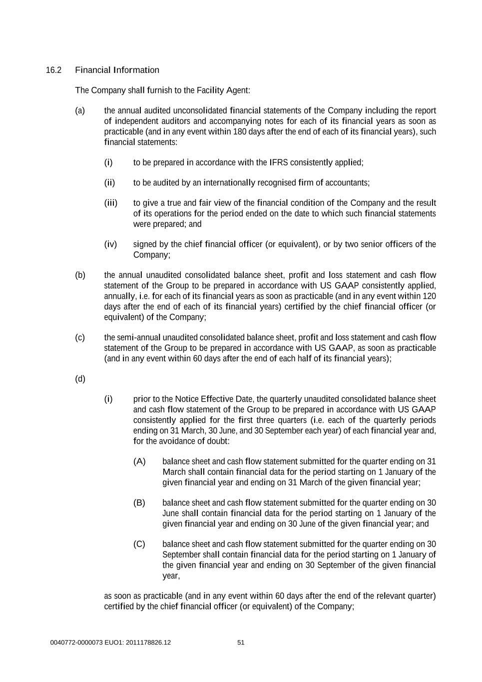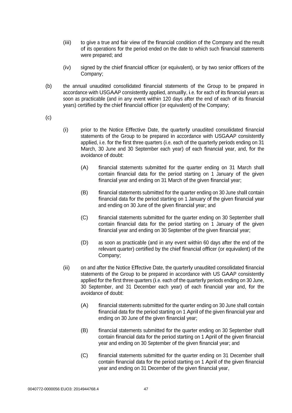 0040772-0000056 EUO3: 2014944768.4 47 (iii) to give a true and fair view of the financial condition of the Company and the result of its operations for the period ended on the date to which such financial statements were prepared; and (iv) signed by the chief financial officer (or equivalent), or by two senior officers of the Company; (b) the annual unaudited consolidated financial statements of the Group to be prepared in accordance with USGAAP consistently applied, annually, i.e. for each of its financial years as soon as practicable (and in any event within 120 days after the end of each of its financial years) certified by the chief financial officer (or equivalent) of the Company; (c) (i) prior to the Notice Effective Date, the quarterly unaudited consolidated financial statements of the Group to be prepared in accordance with USGAAP consistently applied, i.e. for the first three quarters (i.e. each of the quarterly periods ending on 31 March, 30 June and 30 September each year) of each financial year, and, for the avoidance of doubt: (A) financial statements submitted for the quarter ending on 31 March shall contain financial data for the period starting on 1 January of the given financial year and ending on 31 March of the given financial year; (B) financial statements submitted for the quarter ending on 30 June shall contain financial data for the period starting on 1 January of the given financial year and ending on 30 June of the given financial year; and (C) financial statements submitted for the quarter ending on 30 September shall contain financial data for the period starting on 1 January of the given financial year and ending on 30 September of the given financial year; (D) as soon as practicable (and in any event within 60 days after the end of the relevant quarter) certified by the chief financial officer (or equivalent) of the Company; (ii) on and after the Notice Effective Date, the quarterly unaudited consolidated financial statements of the Group to be prepared in accordance with US GAAP consistently applied for the first three quarters (i.e. each of the quarterly periods ending on 30 June, 30 September, and 31 December each year) of each financial year and, for the avoidance of doubt: (A) financial statements submitted for the quarter ending on 30 June shall contain financial data for the period starting on 1 April of the given financial year and ending on 30 June of the given financial year; (B) financial statements submitted for the quarter ending on 30 September shall contain financial data for the period starting on 1 April of the given financial year and ending on 30 September of the given financial year; and (C) financial statements submitted for the quarter ending on 31 December shall contain financial data for the period starting on 1 April of the given financial year and ending on 31 December of the given financial year,
