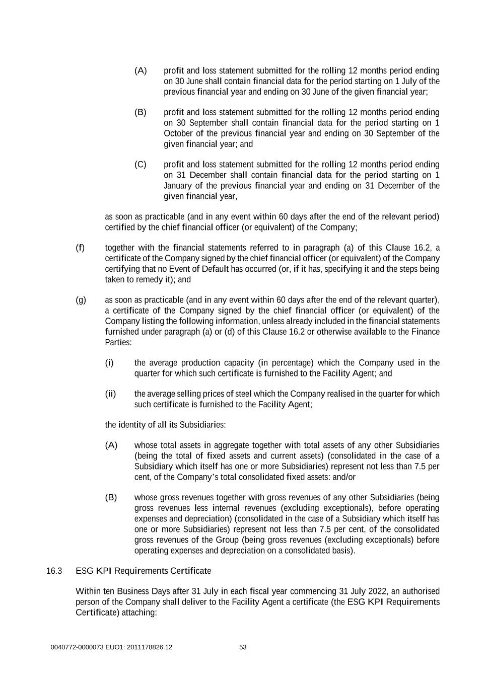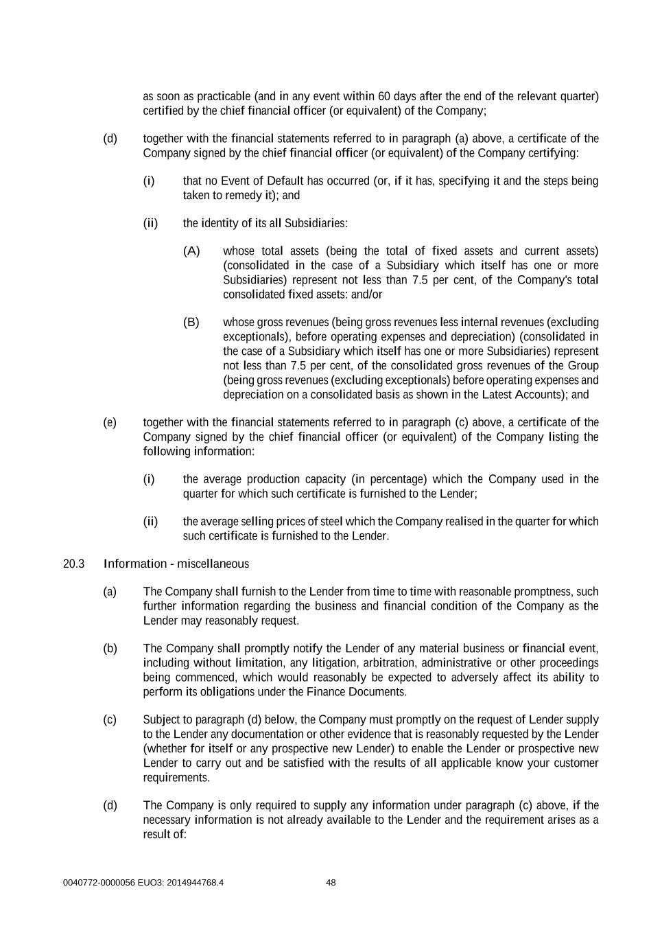 0040772-0000056 EUO3: 2014944768.4 48 as soon as practicable (and in any event within 60 days after the end of the relevant quarter) certified by the chief financial officer (or equivalent) of the Company; (d) together with the financial statements referred to in paragraph (a) above, a certificate of the Company signed by the chief financial officer (or equivalent) of the Company certifying: (i) that no Event of Default has occurred (or, if it has, specifying it and the steps being taken to remedy it); and (ii) the identity of its all Subsidiaries: (A) whose total assets (being the total of fixed assets and current assets) (consolidated in the case of a Subsidiary which itself has one or more Subsidiaries) represent not less than 7.5 per cent, of the Company's total consolidated fixed assets: and/or (B) whose gross revenues (being gross revenues less internal revenues (excluding exceptionals), before operating expenses and depreciation) (consolidated in the case of a Subsidiary which itself has one or more Subsidiaries) represent not less than 7.5 per cent, of the consolidated gross revenues of the Group (being gross revenues (excluding exceptionals) before operating expenses and depreciation on a consolidated basis as shown in the Latest Accounts); and (e) together with the financial statements referred to in paragraph (c) above, a certificate of the Company signed by the chief financial officer (or equivalent) of the Company listing the following information: (i) the average production capacity (in percentage) which the Company used in the quarter for which such certificate is furnished to the Lender; (ii) the average selling prices of steel which the Company realised in the quarter for which such certificate is furnished to the Lender. 20.3 Information - miscellaneous (a) The Company shall furnish to the Lender from time to time with reasonable promptness, such further information regarding the business and financial condition of the Company as the Lender may reasonably request. (b) The Company shall promptly notify the Lender of any material business or financial event, including without limitation, any litigation, arbitration, administrative or other proceedings being commenced, which would reasonably be expected to adversely affect its ability to perform its obligations under the Finance Documents. (c) Subject to paragraph (d) below, the Company must promptly on the request of Lender supply to the Lender any documentation or other evidence that is reasonably requested by the Lender (whether for itself or any prospective new Lender) to enable the Lender or prospective new Lender to carry out and be satisfied with the results of all applicable know your customer requirements. (d) The Company is only required to supply any information under paragraph (c) above, if the necessary information is not already available to the Lender and the requirement arises as a result of: