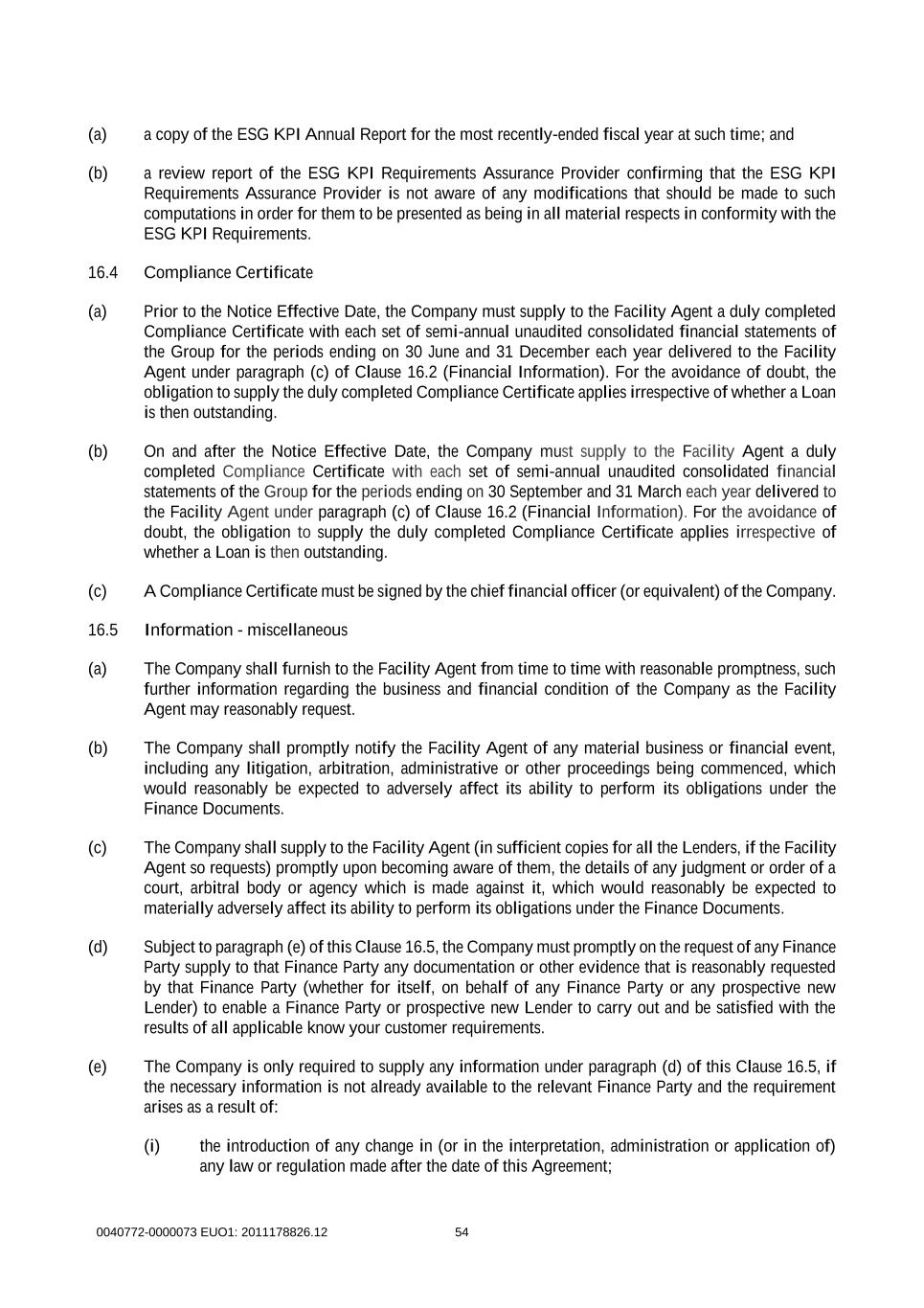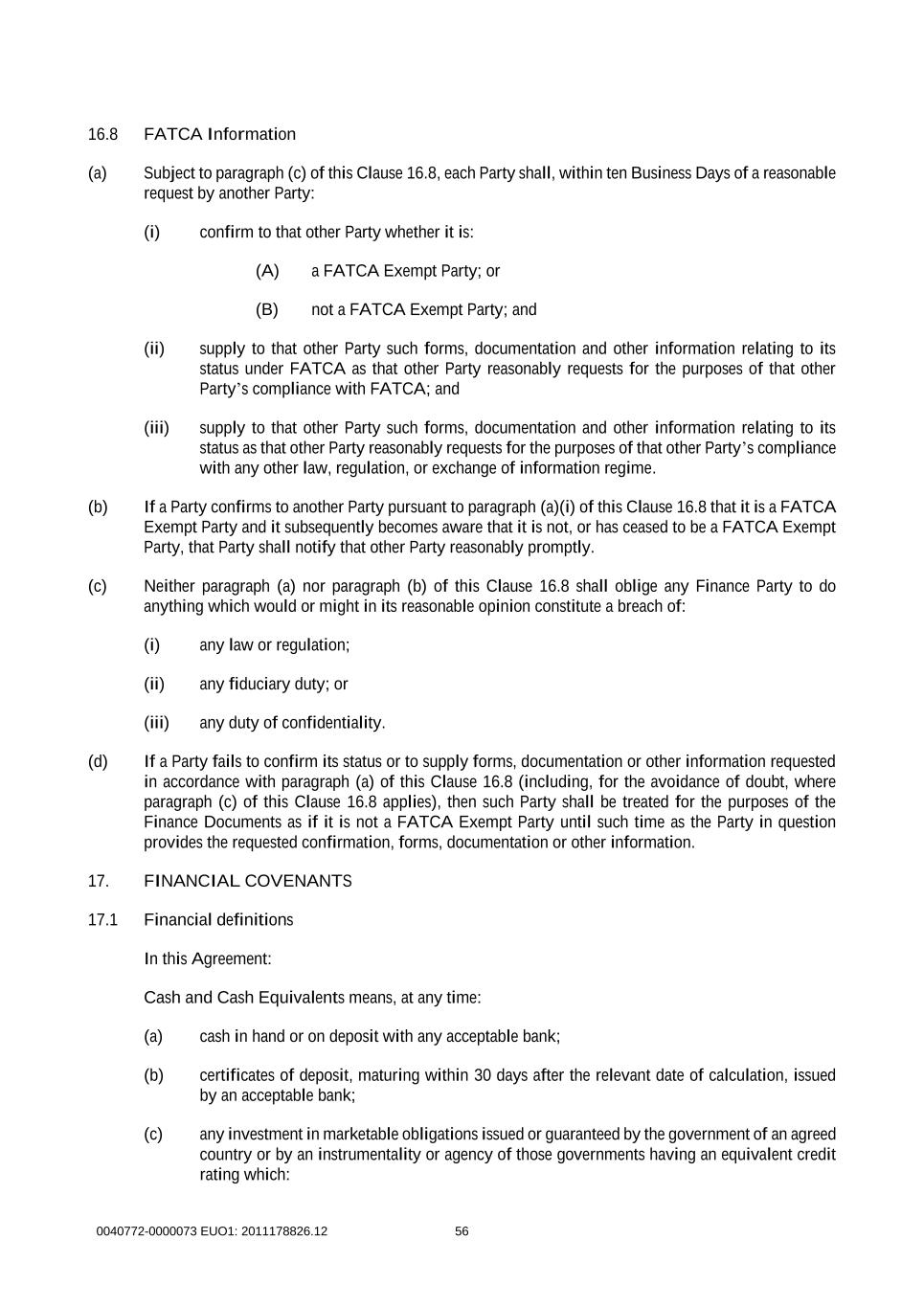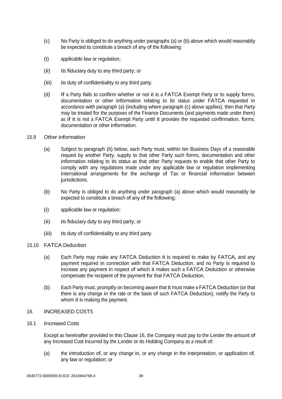 0040772-0000056 EUO3: 2014944768.4 39 (c) No Party is obliged to do anything under paragraphs (a) or (b) above which would reasonably be expected to constitute a breach of any of the following: (i) applicable law or regulation; (ii) its fiduciary duty to any third party; or (iii) its duty of confidentiality to any third party. (d) If a Party fails to confirm whether or not it is a FATCA Exempt Party or to supply forms, documentation or other information relating to its status under FATCA requested in accordance with paragraph (a) (including where paragraph (c) above applies), then that Party may be treated for the purposes of the Finance Documents (and payments made under them) as if it is not a FATCA Exempt Party until it provides the requested confirmation, forms, documentation or other information. 15.9 Other information (a) Subject to paragraph (b) below, each Party must, within ten Business Days of a reasonable request by another Party, supply to that other Party such forms, documentation and other information relating to its status as that other Party requests to enable that other Party to comply with any regulations made under any applicable law or regulation implementing international arrangements for the exchange of Tax or financial information between jurisdictions. (b) No Party is obliged to do anything under paragraph (a) above which would reasonably be expected to constitute a breach of any of the following: (i) applicable law or regulation; (ii) its fiduciary duty to any third party; or (iii) its duty of confidentiality to any third party. 15.10 FATCA Deduction (a) Each Party may make any FATCA Deduction it is required to make by FATCA, and any payment required in connection with that FATCA Deduction, and no Party is required to increase any payment in respect of which it makes such a FATCA Deduction or otherwise compensate the recipient of the payment for that FATCA Deduction. (b) Each Party must, promptly on becoming aware that it must make a FATCA Deduction (or that there is any change in the rate or the basis of such FATCA Deduction), notify the Party to whom it is making the payment. 16. INCREASED COSTS 16.1 Increased Costs Except as hereinafter provided in this Clause 16, the Company must pay to the Lender the amount of any Increased Cost incurred by the Lender or its Holding Company as a result of: (a) the introduction of, or any change in, or any change in the interpretation, or application of, any law or regulation; or