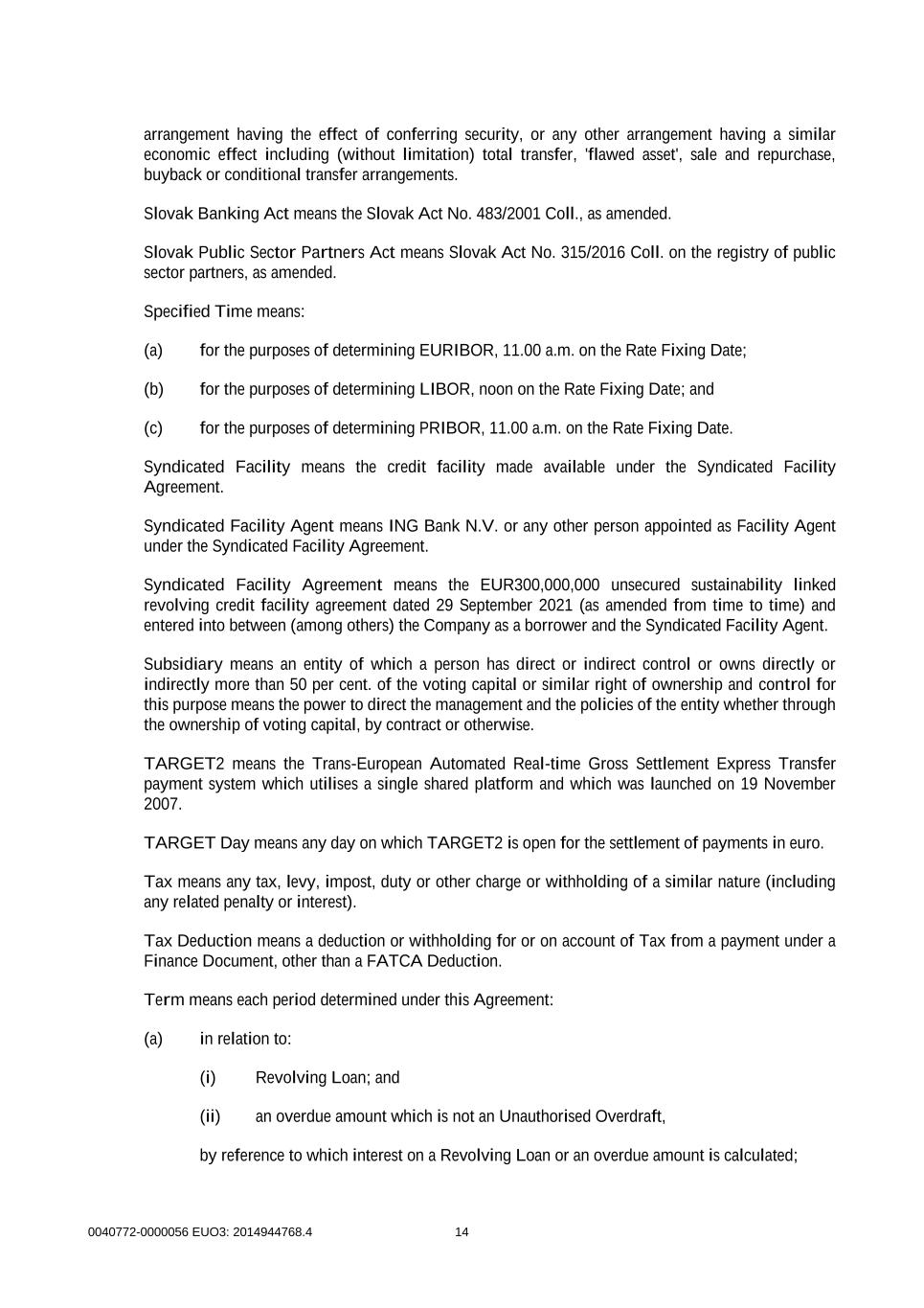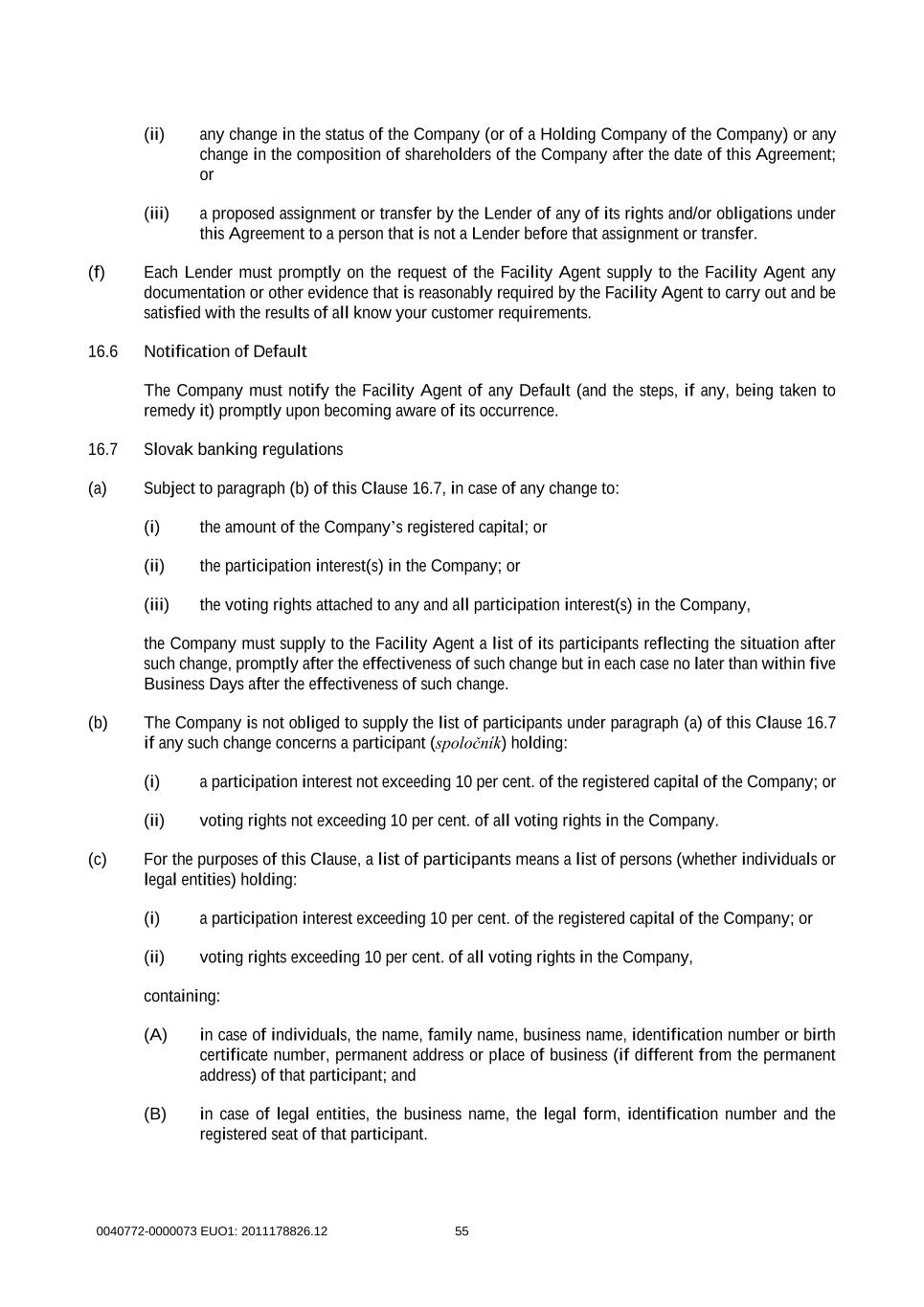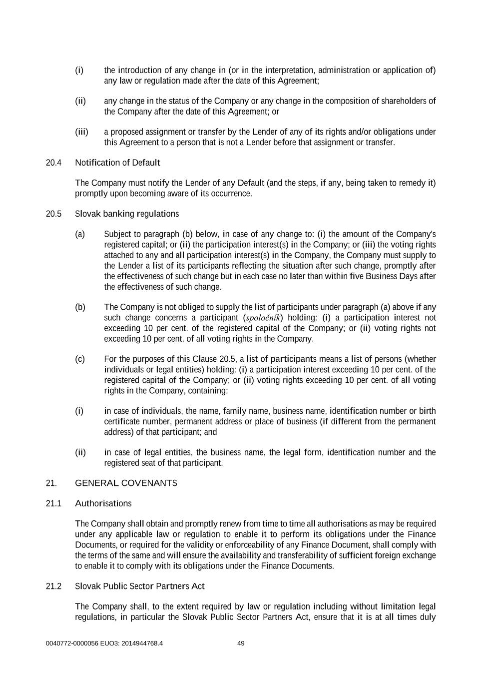 0040772-0000056 EUO3: 2014944768.4 49 (i) the introduction of any change in (or in the interpretation, administration or application of) any law or regulation made after the date of this Agreement; (ii) any change in the status of the Company or any change in the composition of shareholders of the Company after the date of this Agreement; or (iii) a proposed assignment or transfer by the Lender of any of its rights and/or obligations under this Agreement to a person that is not a Lender before that assignment or transfer. 20.4 Notification of Default The Company must notify the Lender of any Default (and the steps, if any, being taken to remedy it) promptly upon becoming aware of its occurrence. 20.5 Slovak banking regulations (a) Subject to paragraph (b) below, in case of any change to: (i) the amount of the Company's registered capital; or (ii) the participation interest(s) in the Company; or (iii) the voting rights attached to any and all participation interest(s) in the Company, the Company must supply to the Lender a list of its participants reflecting the situation after such change, promptly after the effectiveness of such change but in each case no later than within five Business Days after the effectiveness of such change. (b) The Company is not obliged to supply the list of participants under paragraph (a) above if any such change concerns a participant (spoločník) holding: (i) a participation interest not exceeding 10 per cent. of the registered capital of the Company; or (ii) voting rights not exceeding 10 per cent. of all voting rights in the Company. (c) For the purposes of this Clause 20.5, a list of participants means a list of persons (whether individuals or legal entities) holding: (i) a participation interest exceeding 10 per cent. of the registered capital of the Company; or (ii) voting rights exceeding 10 per cent. of all voting rights in the Company, containing: (i) in case of individuals, the name, family name, business name, identification number or birth certificate number, permanent address or place of business (if different from the permanent address) of that participant; and (ii) in case of legal entities, the business name, the legal form, identification number and the registered seat of that participant. 21. GENERAL COVENANTS 21.1 Authorisations The Company shall obtain and promptly renew from time to time all authorisations as may be required under any applicable law or regulation to enable it to perform its obligations under the Finance Documents, or required for the validity or enforceability of any Finance Document, shall comply with the terms of the same and will ensure the availability and transferability of sufficient foreign exchange to enable it to comply with its obligations under the Finance Documents. 21.2 Slovak Public Sector Partners Act The Company shall, to the extent required by law or regulation including without limitation legal regulations, in particular the Slovak Public Sector Partners Act, ensure that it is at all times duly