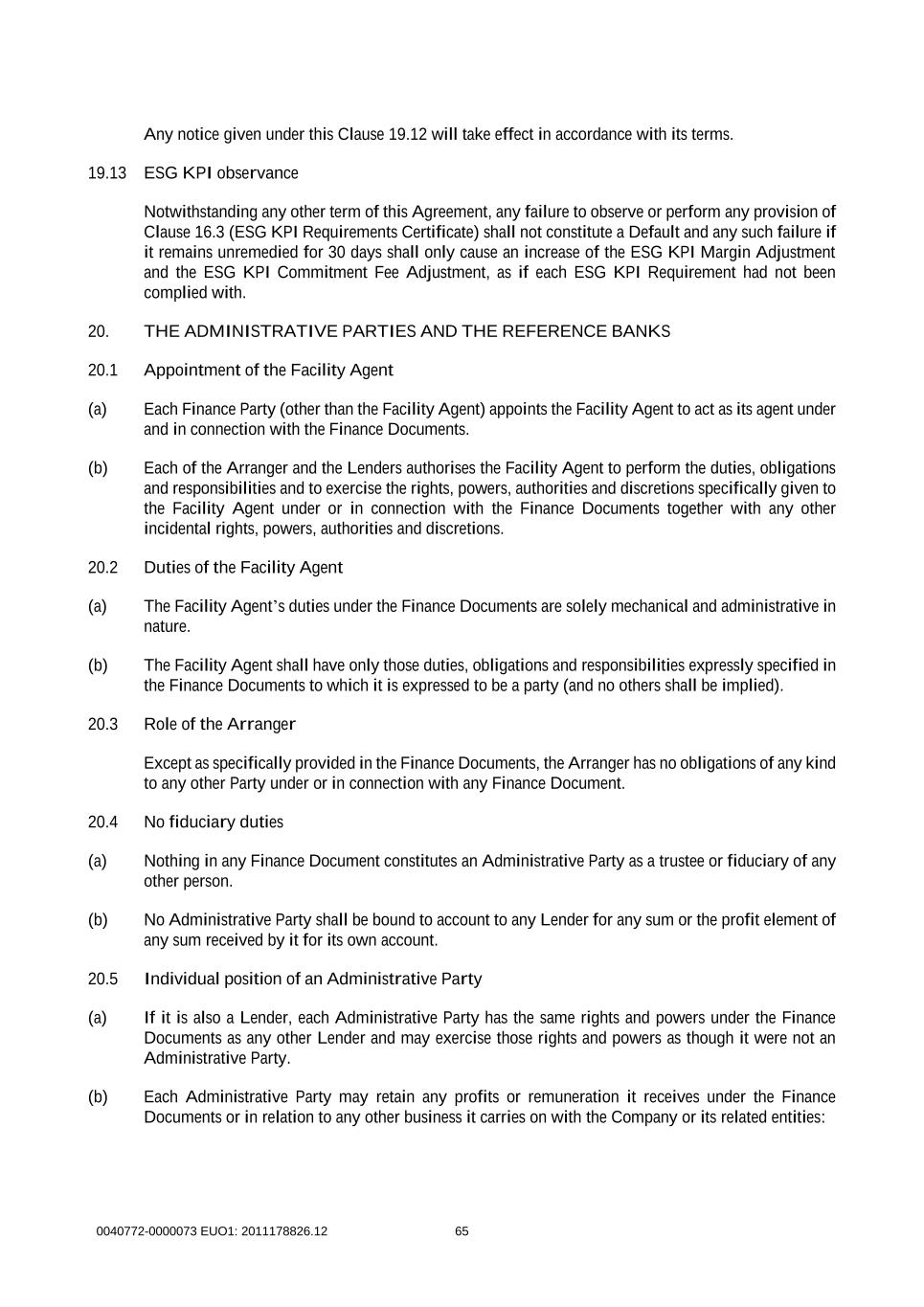 0040772-0000056 EUO3: 2014944768.4 57 27. AMENDMENTS AND WAIVERS Any term of the Finance Documents may be amended or waived with the agreement of the Company and the Lender. 27.1 Change of currency If a change in any currency of a country occurs (including where there is more than one currency or currency unit recognised at the same time as the lawful currency of a country), the Finance Documents will be amended to the extent the Lender (acting reasonably and after consultation with the Company) determines is necessary to reflect the change. 27.2 Waivers and remedies cumulative The rights of the Lender under the Finance Documents: (a) may be exercised as often as necessary; (b) are cumulative and not exclusive of its rights under the general law; and (c) may be waived only in writing and specifically. Delay in exercising or non-exercise of any right is not a waiver of that right. 27.3 Changes to reference rates (a) Any amendment or waiver which relates to: (i) providing for the use of a Replacement Reference Rate; and (ii) aligning any provision of any Finance Document to the use of that Replacement Reference Rate; (A) enabling that Replacement Reference Rate to be used for the calculation of interest under this Agreement (including, without limitation, any consequential changes required to enable that Replacement Reference Rate to be used for the purposes of this Agreement); (B) implementing market conventions applicable to that Replacement Reference Rate; (C) providing for appropriate fallback (and market disruption) provisions for that Replacement Reference Rate; or (D) adjusting the pricing to reduce or eliminate, to the extent reasonably practicable, any transfer of economic value from one Party to another as a result of the application of that Replacement Reference Rate (and if any adjustment or method for calculating any adjustment has been formally designated, nominated or recommended by the Relevant Nominating Body, the adjustment shall be determined on the basis of that designation, nomination or recommendation), may be made with the consent of the Lender and the Company.