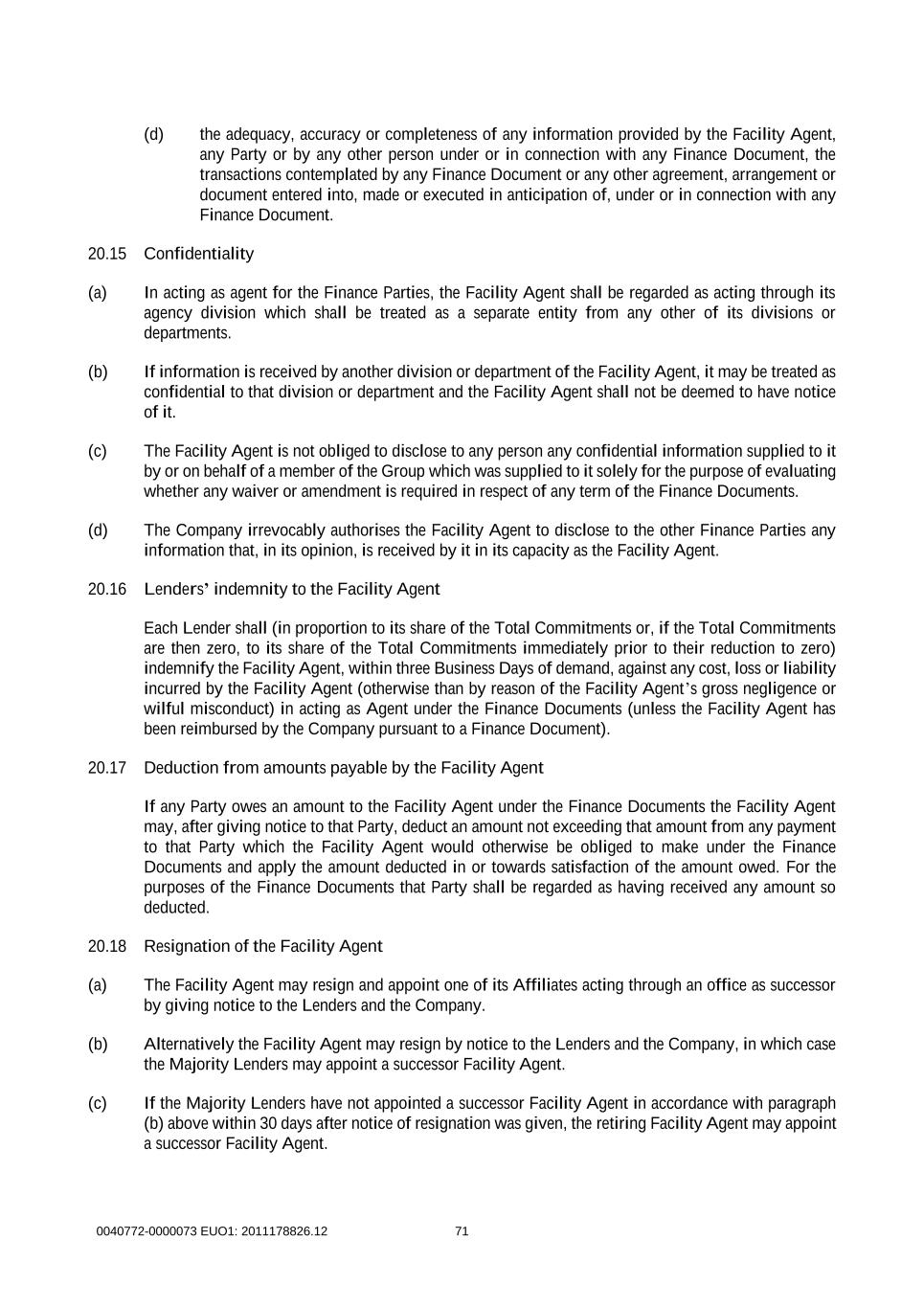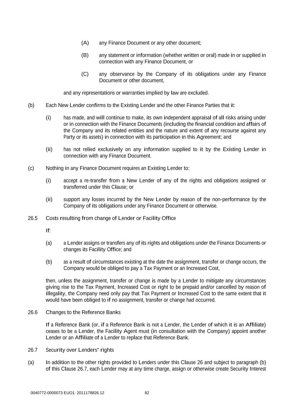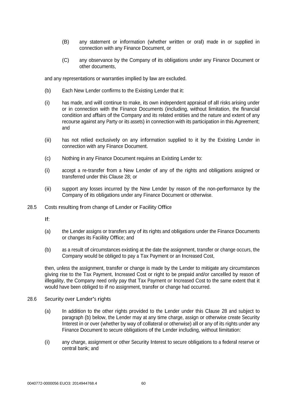 0040772-0000056 EUO3: 2014944768.4 60 (B) any statement or information (whether written or oral) made in or supplied in connection with any Finance Document, or (C) any observance by the Company of its obligations under any Finance Document or other documents, and any representations or warranties implied by law are excluded. (b) Each New Lender confirms to the Existing Lender that it: (i) has made, and will continue to make, its own independent appraisal of all risks arising under or in connection with the Finance Documents (including, without limitation, the financial condition and affairs of the Company and its related entities and the nature and extent of any recourse against any Party or its assets) in connection with its participation in this Agreement; and (ii) has not relied exclusively on any information supplied to it by the Existing Lender in connection with any Finance Document. (c) Nothing in any Finance Document requires an Existing Lender to: (i) accept a re-transfer from a New Lender of any of the rights and obligations assigned or transferred under this Clause 28; or (ii) support any losses incurred by the New Lender by reason of the non-performance by the Company of its obligations under any Finance Document or otherwise. 28.5 Costs resulting from change of Lender or Facility Office If: (a) the Lender assigns or transfers any of its rights and obligations under the Finance Documents or changes its Facility Office; and (b) as a result of circumstances existing at the date the assignment, transfer or change occurs, the Company would be obliged to pay a Tax Payment or an Increased Cost, then, unless the assignment, transfer or change is made by the Lender to mitigate any circumstances giving rise to the Tax Payment, Increased Cost or right to be prepaid and/or cancelled by reason of illegality, the Company need only pay that Tax Payment or Increased Cost to the same extent that it would have been obliged to if no assignment, transfer or change had occurred. 28.6 Security over Lender's rights (a) In addition to the other rights provided to the Lender under this Clause 28 and subject to paragraph (b) below, the Lender may at any time charge, assign or otherwise create Security Interest in or over (whether by way of collateral or otherwise) all or any of its rights under any Finance Document to secure obligations of the Lender including, without limitation: (i) any charge, assignment or other Security Interest to secure obligations to a federal reserve or central bank; and