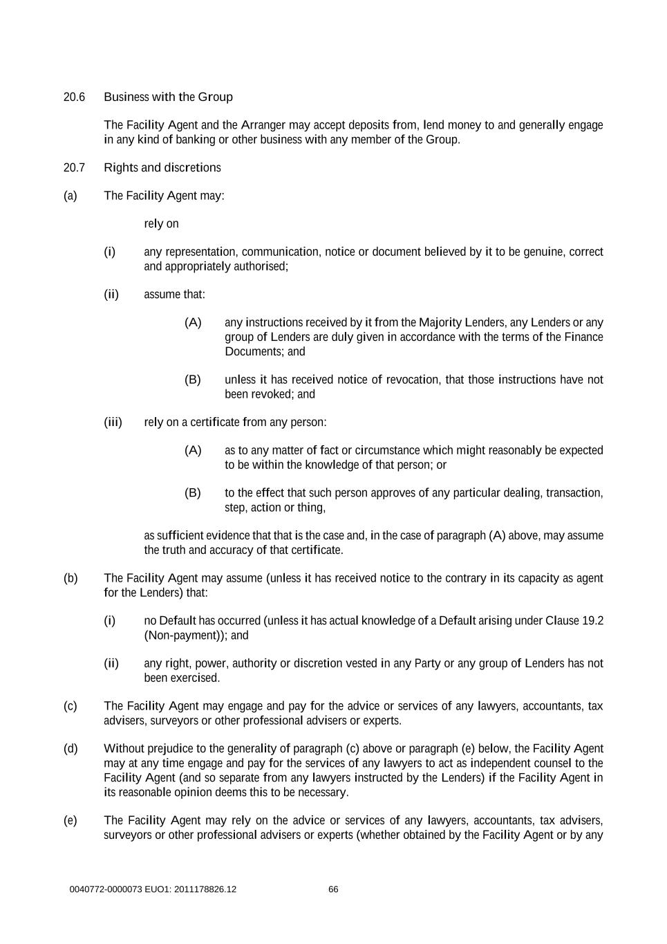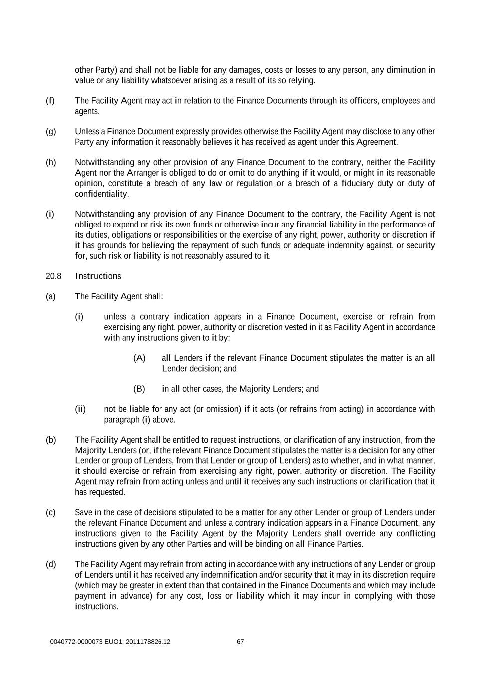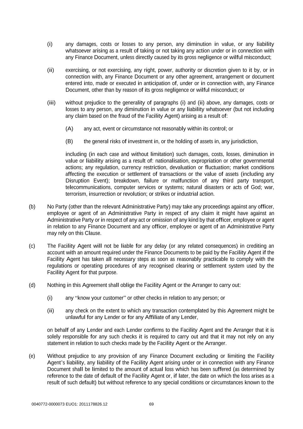 0040772-0000056 EUO3: 2014944768.4 60 (B) any statement or information (whether written or oral) made in or supplied in connection with any Finance Document, or (C) any observance by the Company of its obligations under any Finance Document or other documents, and any representations or warranties implied by law are excluded. (b) Each New Lender confirms to the Existing Lender that it: (i) has made, and will continue to make, its own independent appraisal of all risks arising under or in connection with the Finance Documents (including, without limitation, the financial condition and affairs of the Company and its related entities and the nature and extent of any recourse against any Party or its assets) in connection with its participation in this Agreement; and (ii) has not relied exclusively on any information supplied to it by the Existing Lender in connection with any Finance Document. (c) Nothing in any Finance Document requires an Existing Lender to: (i) accept a re-transfer from a New Lender of any of the rights and obligations assigned or transferred under this Clause 28; or (ii) support any losses incurred by the New Lender by reason of the non-performance by the Company of its obligations under any Finance Document or otherwise. 28.5 Costs resulting from change of Lender or Facility Office If: (a) the Lender assigns or transfers any of its rights and obligations under the Finance Documents or changes its Facility Office; and (b) as a result of circumstances existing at the date the assignment, transfer or change occurs, the Company would be obliged to pay a Tax Payment or an Increased Cost, then, unless the assignment, transfer or change is made by the Lender to mitigate any circumstances giving rise to the Tax Payment, Increased Cost or right to be prepaid and/or cancelled by reason of illegality, the Company need only pay that Tax Payment or Increased Cost to the same extent that it would have been obliged to if no assignment, transfer or change had occurred. 28.6 Security over Lender's rights (a) In addition to the other rights provided to the Lender under this Clause 28 and subject to paragraph (b) below, the Lender may at any time charge, assign or otherwise create Security Interest in or over (whether by way of collateral or otherwise) all or any of its rights under any Finance Document to secure obligations of the Lender including, without limitation: (i) any charge, assignment or other Security Interest to secure obligations to a federal reserve or central bank; and