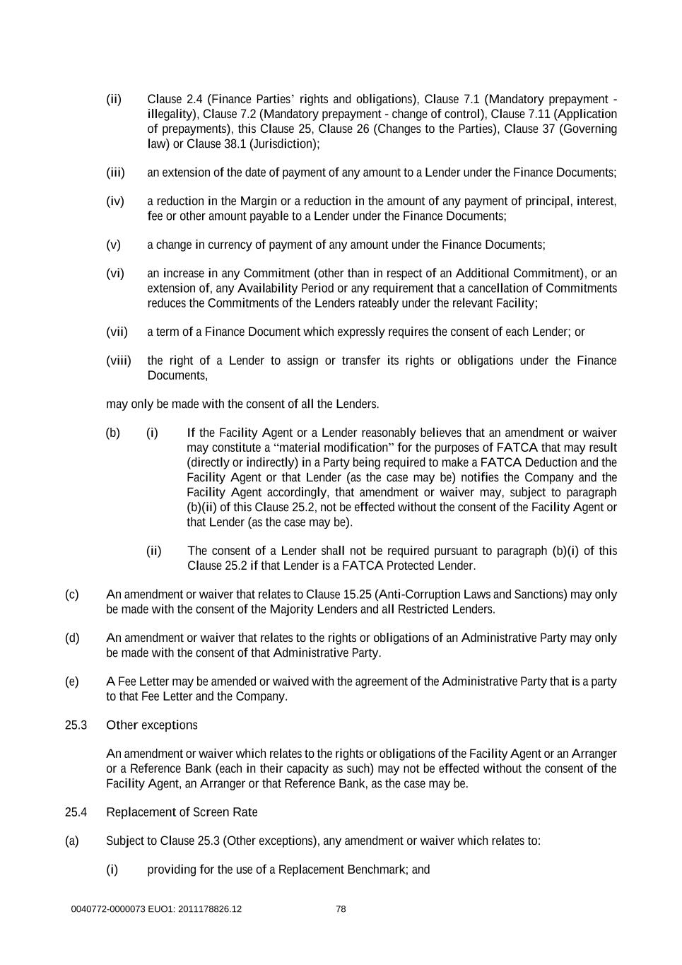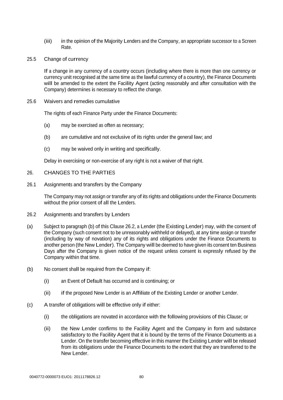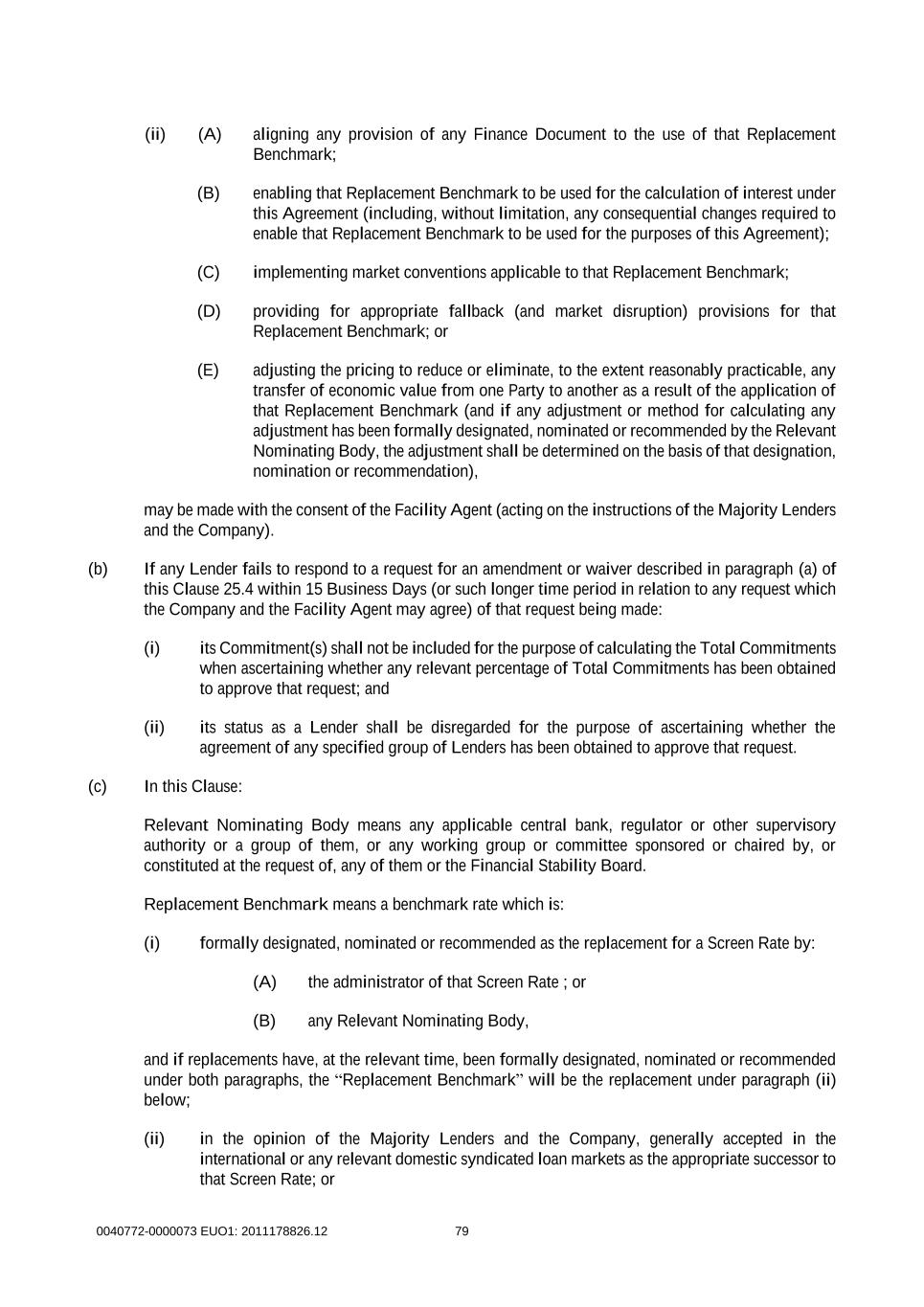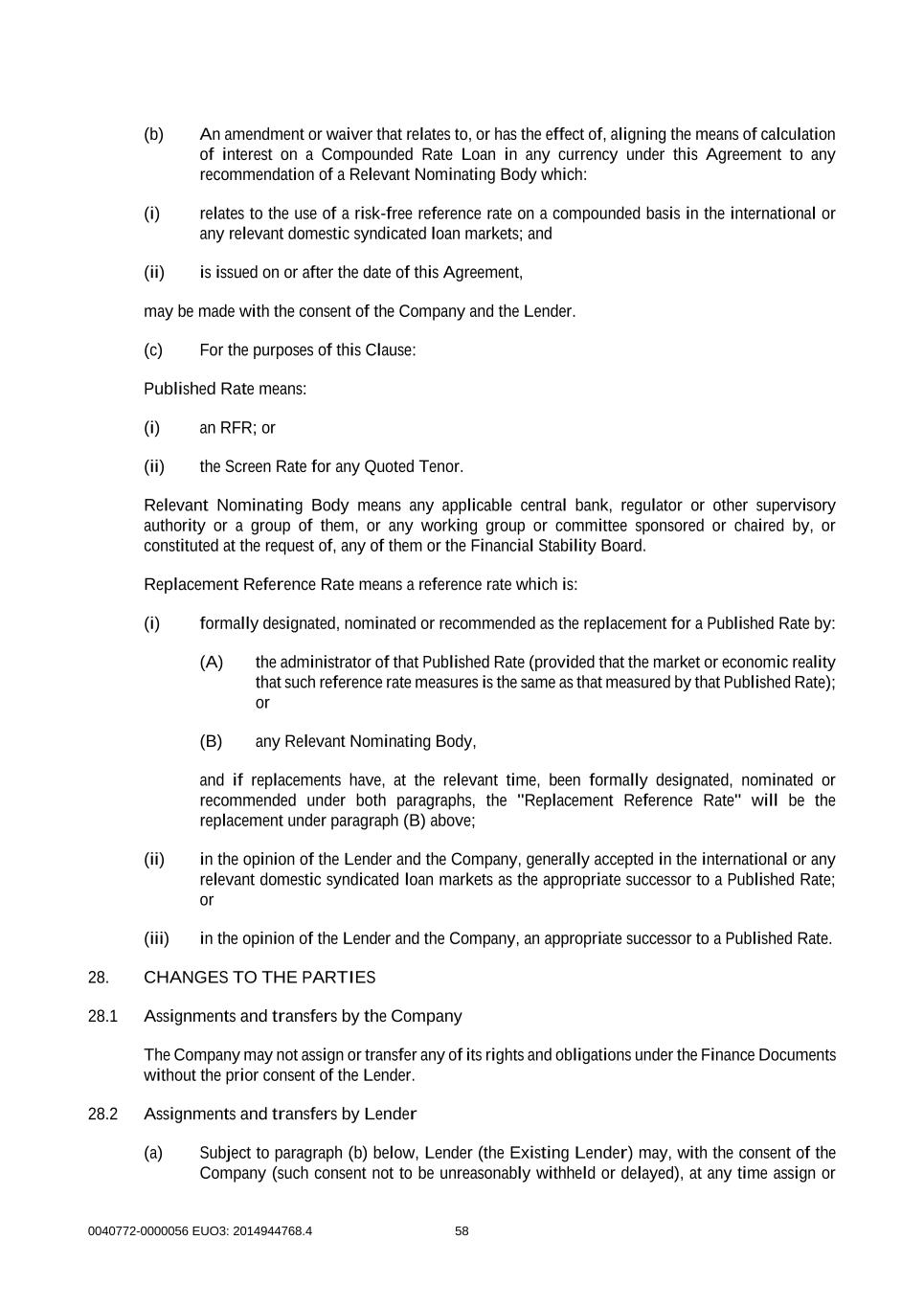 0040772-0000056 EUO3: 2014944768.4 58 (b) An amendment or waiver that relates to, or has the effect of, aligning the means of calculation of interest on a Compounded Rate Loan in any currency under this Agreement to any recommendation of a Relevant Nominating Body which: (i) relates to the use of a risk-free reference rate on a compounded basis in the international or any relevant domestic syndicated loan markets; and (ii) is issued on or after the date of this Agreement, may be made with the consent of the Company and the Lender. (c) For the purposes of this Clause: Published Rate means: (i) an RFR; or (ii) the Screen Rate for any Quoted Tenor. Relevant Nominating Body means any applicable central bank, regulator or other supervisory authority or a group of them, or any working group or committee sponsored or chaired by, or constituted at the request of, any of them or the Financial Stability Board. Replacement Reference Rate means a reference rate which is: (i) formally designated, nominated or recommended as the replacement for a Published Rate by: (A) the administrator of that Published Rate (provided that the market or economic reality that such reference rate measures is the same as that measured by that Published Rate); or (B) any Relevant Nominating Body, and if replacements have, at the relevant time, been formally designated, nominated or recommended under both paragraphs, the "Replacement Reference Rate" will be the replacement under paragraph (B) above; (ii) in the opinion of the Lender and the Company, generally accepted in the international or any relevant domestic syndicated loan markets as the appropriate successor to a Published Rate; or (iii) in the opinion of the Lender and the Company, an appropriate successor to a Published Rate. 28. CHANGES TO THE PARTIES 28.1 Assignments and transfers by the Company The Company may not assign or transfer any of its rights and obligations under the Finance Documents without the prior consent of the Lender. 28.2 Assignments and transfers by Lender (a) Subject to paragraph (b) below, Lender (the Existing Lender) may, with the consent of the Company (such consent not to be unreasonably withheld or delayed), at any time assign or