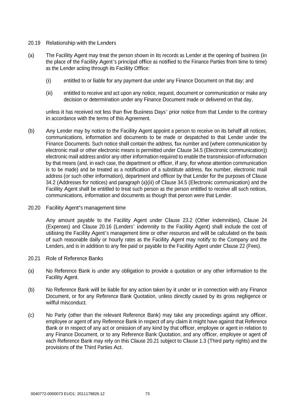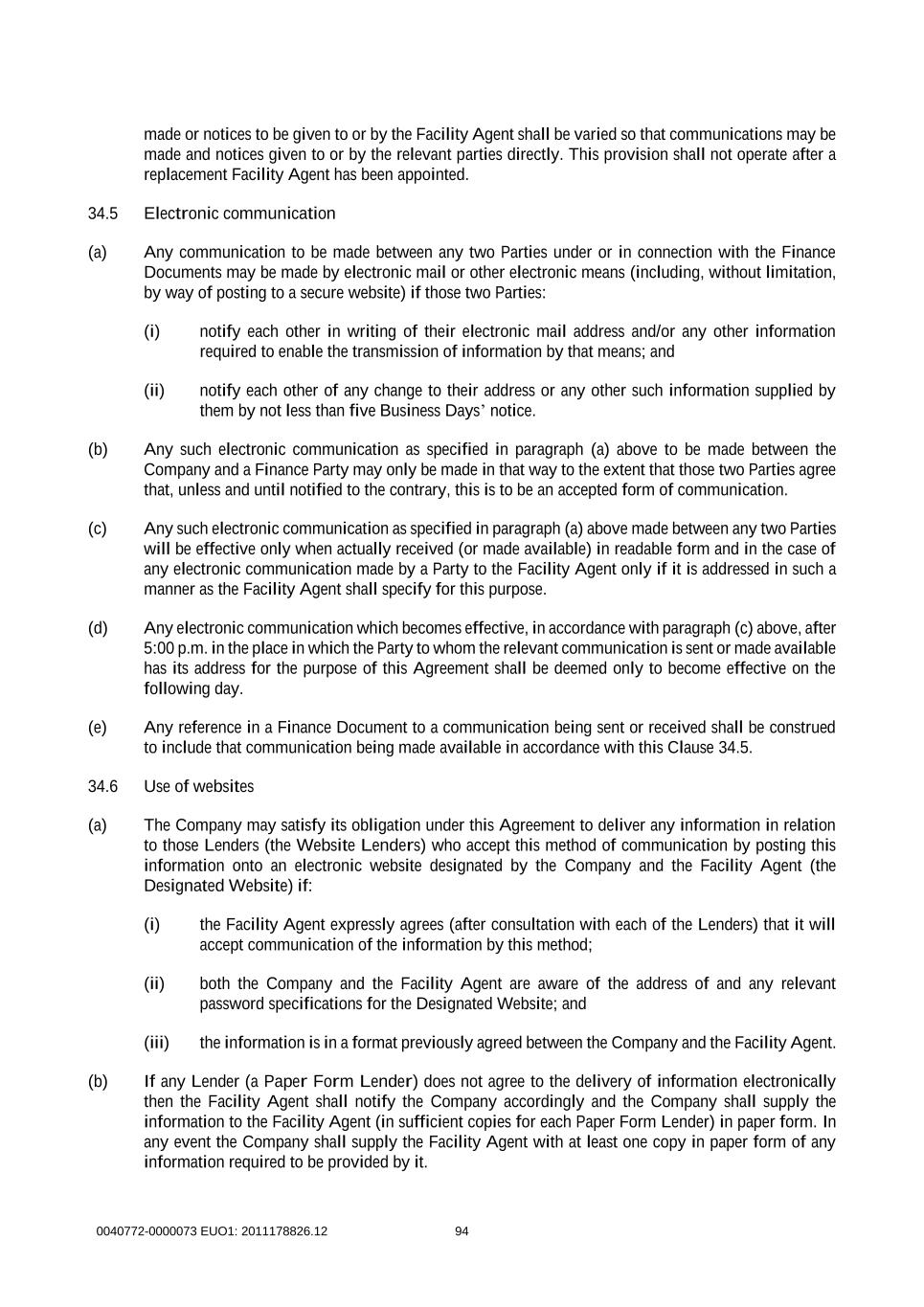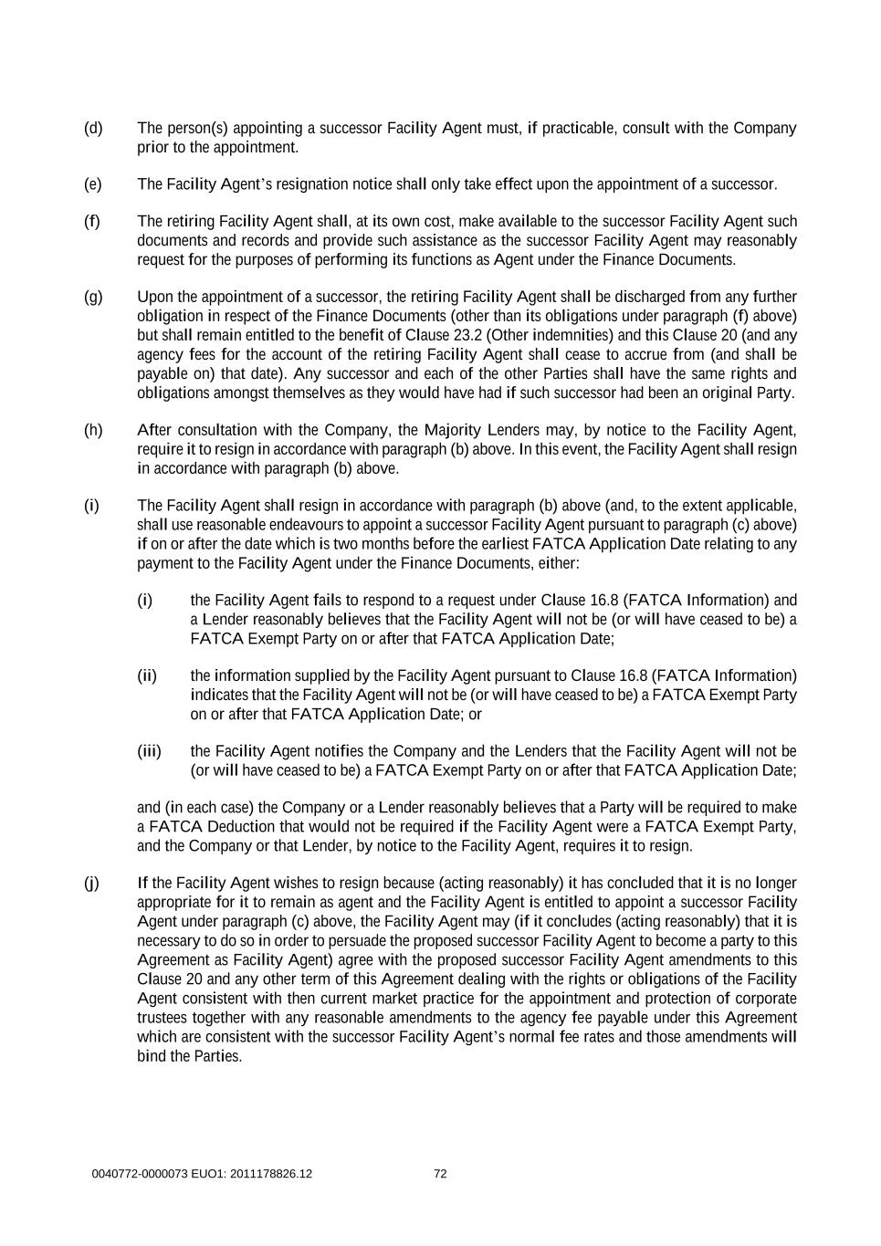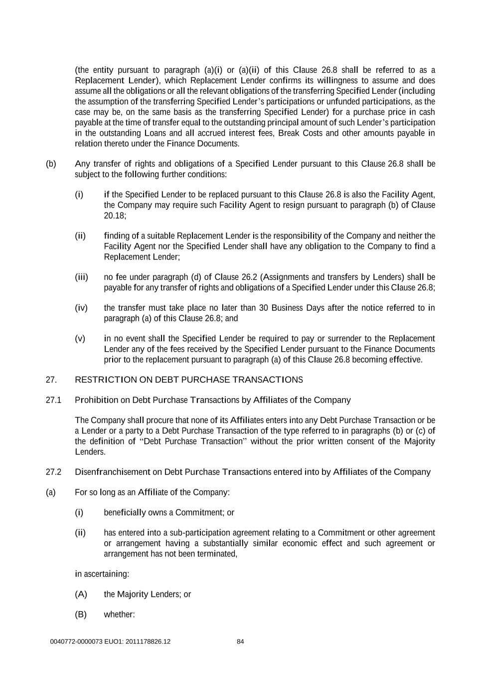 0040772-0000056 EUO3: 2014944768.4 58 (b) An amendment or waiver that relates to, or has the effect of, aligning the means of calculation of interest on a Compounded Rate Loan in any currency under this Agreement to any recommendation of a Relevant Nominating Body which: (i) relates to the use of a risk-free reference rate on a compounded basis in the international or any relevant domestic syndicated loan markets; and (ii) is issued on or after the date of this Agreement, may be made with the consent of the Company and the Lender. (c) For the purposes of this Clause: Published Rate means: (i) an RFR; or (ii) the Screen Rate for any Quoted Tenor. Relevant Nominating Body means any applicable central bank, regulator or other supervisory authority or a group of them, or any working group or committee sponsored or chaired by, or constituted at the request of, any of them or the Financial Stability Board. Replacement Reference Rate means a reference rate which is: (i) formally designated, nominated or recommended as the replacement for a Published Rate by: (A) the administrator of that Published Rate (provided that the market or economic reality that such reference rate measures is the same as that measured by that Published Rate); or (B) any Relevant Nominating Body, and if replacements have, at the relevant time, been formally designated, nominated or recommended under both paragraphs, the "Replacement Reference Rate" will be the replacement under paragraph (B) above; (ii) in the opinion of the Lender and the Company, generally accepted in the international or any relevant domestic syndicated loan markets as the appropriate successor to a Published Rate; or (iii) in the opinion of the Lender and the Company, an appropriate successor to a Published Rate. 28. CHANGES TO THE PARTIES 28.1 Assignments and transfers by the Company The Company may not assign or transfer any of its rights and obligations under the Finance Documents without the prior consent of the Lender. 28.2 Assignments and transfers by Lender (a) Subject to paragraph (b) below, Lender (the Existing Lender) may, with the consent of the Company (such consent not to be unreasonably withheld or delayed), at any time assign or