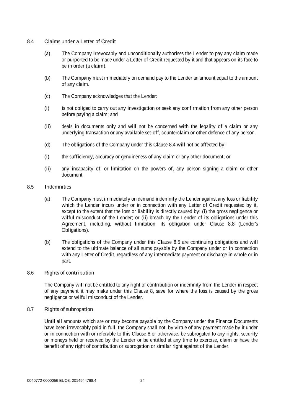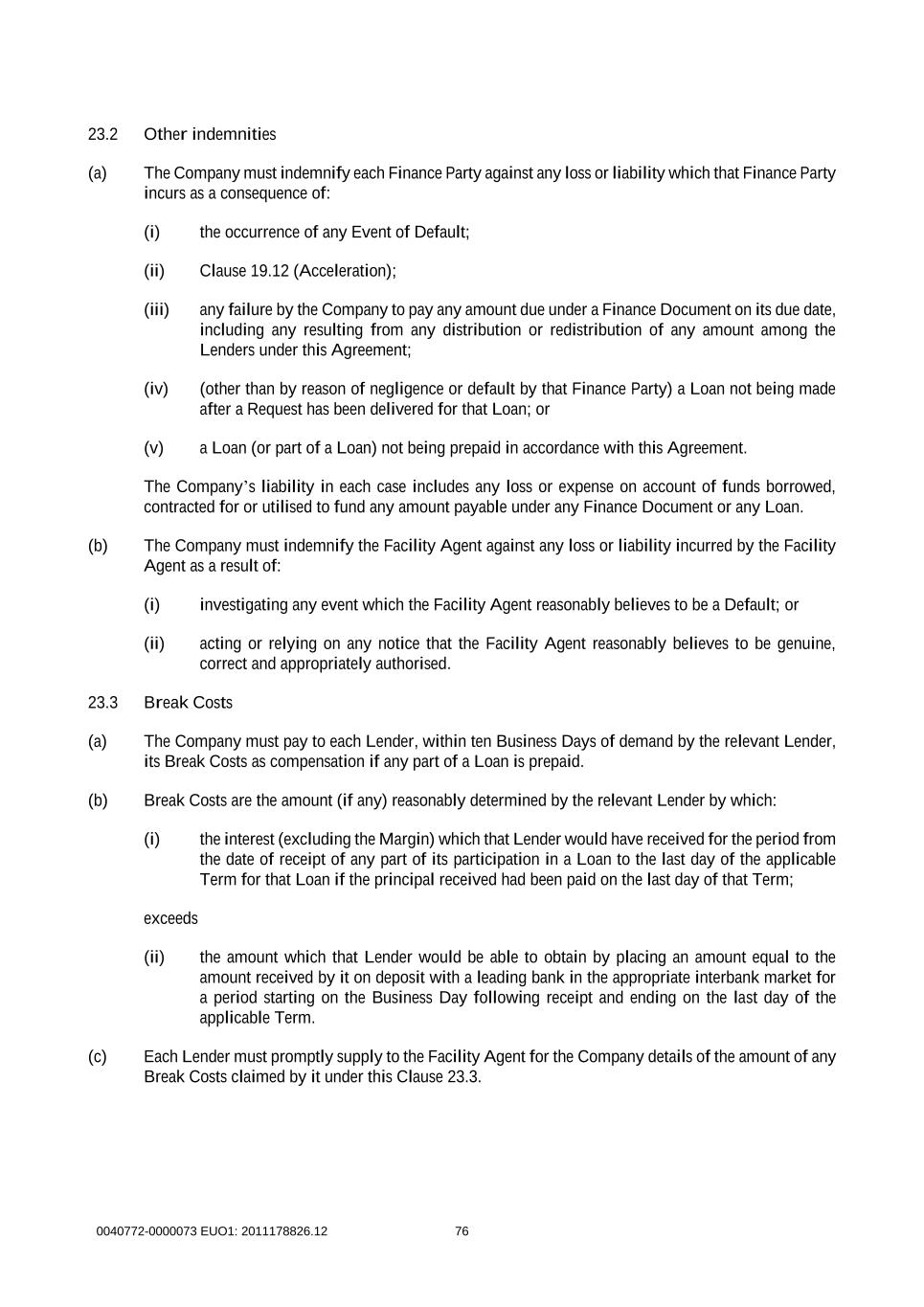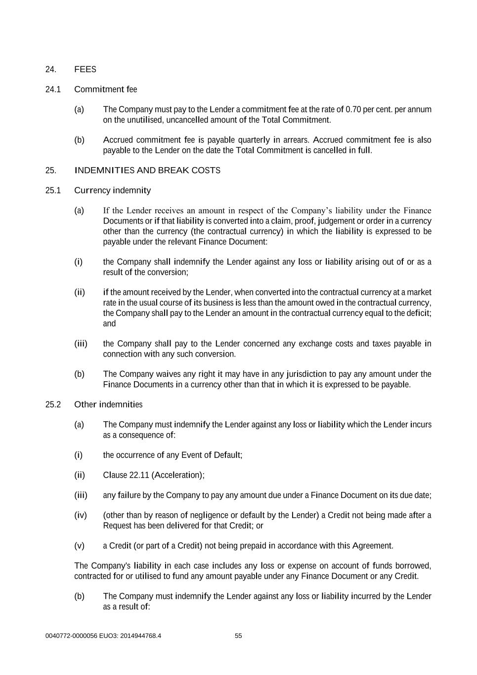 0040772-0000056 EUO3: 2014944768.4 55 24. FEES 24.1 Commitment fee (a) The Company must pay to the Lender a commitment fee at the rate of 0.70 per cent. per annum on the unutilised, uncancelled amount of the Total Commitment. (b) Accrued commitment fee is payable quarterly in arrears. Accrued commitment fee is also payable to the Lender on the date the Total Commitment is cancelled in full. 25. INDEMNITIES AND BREAK COSTS 25.1 Currency indemnity (a) If the Lender receives an amount in respect of the Company’s liability under the Finance Documents or if that liability is converted into a claim, proof, judgement or order in a currency other than the currency (the contractual currency) in which the liability is expressed to be payable under the relevant Finance Document: (i) the Company shall indemnify the Lender against any loss or liability arising out of or as a result of the conversion; (ii) if the amount received by the Lender, when converted into the contractual currency at a market rate in the usual course of its business is less than the amount owed in the contractual currency, the Company shall pay to the Lender an amount in the contractual currency equal to the deficit; and (iii) the Company shall pay to the Lender concerned any exchange costs and taxes payable in connection with any such conversion. (b) The Company waives any right it may have in any jurisdiction to pay any amount under the Finance Documents in a currency other than that in which it is expressed to be payable. 25.2 Other indemnities (a) The Company must indemnify the Lender against any loss or liability which the Lender incurs as a consequence of: (i) the occurrence of any Event of Default; (ii) Clause 22.11 (Acceleration); (iii) any failure by the Company to pay any amount due under a Finance Document on its due date; (iv) (other than by reason of negligence or default by the Lender) a Credit not being made after a Request has been delivered for that Credit; or (v) a Credit (or part of a Credit) not being prepaid in accordance with this Agreement. The Company's liability in each case includes any loss or expense on account of funds borrowed, contracted for or utilised to fund any amount payable under any Finance Document or any Credit. (b) The Company must indemnify the Lender against any loss or liability incurred by the Lender as a result of: