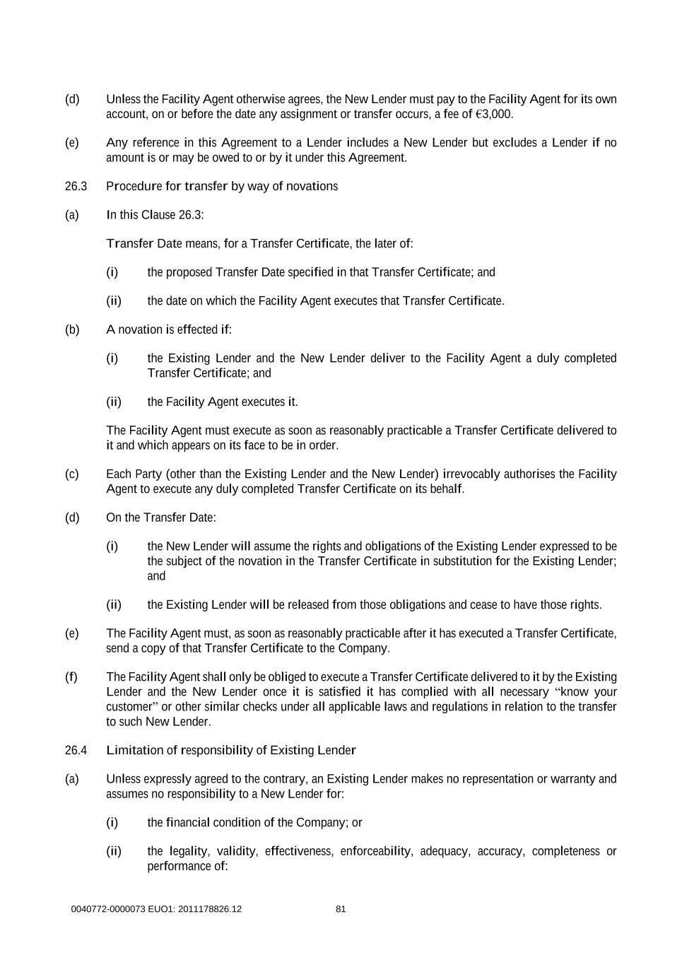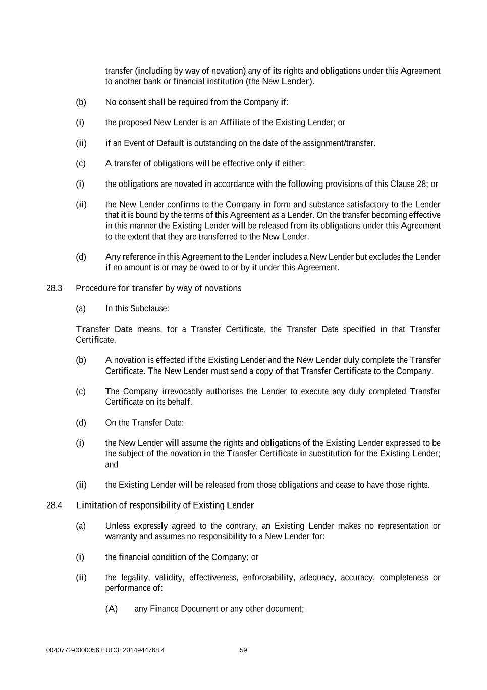 0040772-0000056 EUO3: 2014944768.4 59 transfer (including by way of novation) any of its rights and obligations under this Agreement to another bank or financial institution (the New Lender). (b) No consent shall be required from the Company if: (i) the proposed New Lender is an Affiliate of the Existing Lender; or (ii) if an Event of Default is outstanding on the date of the assignment/transfer. (c) A transfer of obligations will be effective only if either: (i) the obligations are novated in accordance with the following provisions of this Clause 28; or (ii) the New Lender confirms to the Company in form and substance satisfactory to the Lender that it is bound by the terms of this Agreement as a Lender. On the transfer becoming effective in this manner the Existing Lender will be released from its obligations under this Agreement to the extent that they are transferred to the New Lender. (d) Any reference in this Agreement to the Lender includes a New Lender but excludes the Lender if no amount is or may be owed to or by it under this Agreement. 28.3 Procedure for transfer by way of novations (a) In this Subclause: Transfer Date means, for a Transfer Certificate, the Transfer Date specified in that Transfer Certificate. (b) A novation is effected if the Existing Lender and the New Lender duly complete the Transfer Certificate. The New Lender must send a copy of that Transfer Certificate to the Company. (c) The Company irrevocably authorises the Lender to execute any duly completed Transfer Certificate on its behalf. (d) On the Transfer Date: (i) the New Lender will assume the rights and obligations of the Existing Lender expressed to be the subject of the novation in the Transfer Certificate in substitution for the Existing Lender; and (ii) the Existing Lender will be released from those obligations and cease to have those rights. 28.4 Limitation of responsibility of Existing Lender (a) Unless expressly agreed to the contrary, an Existing Lender makes no representation or warranty and assumes no responsibility to a New Lender for: (i) the financial condition of the Company; or (ii) the legality, validity, effectiveness, enforceability, adequacy, accuracy, completeness or performance of: (A) any Finance Document or any other document;