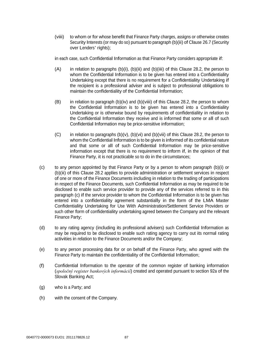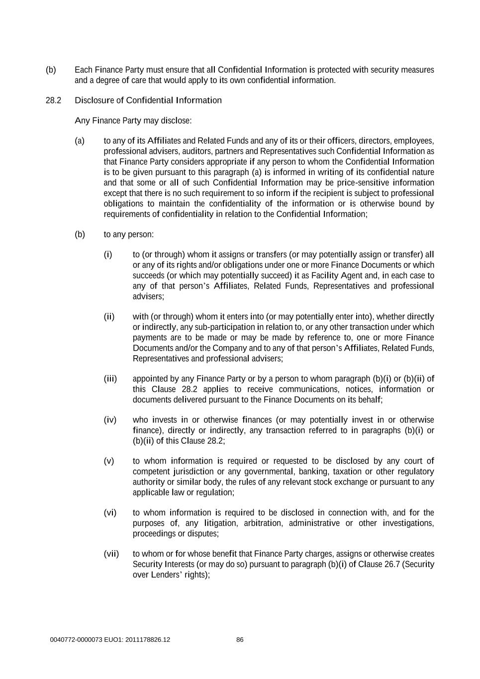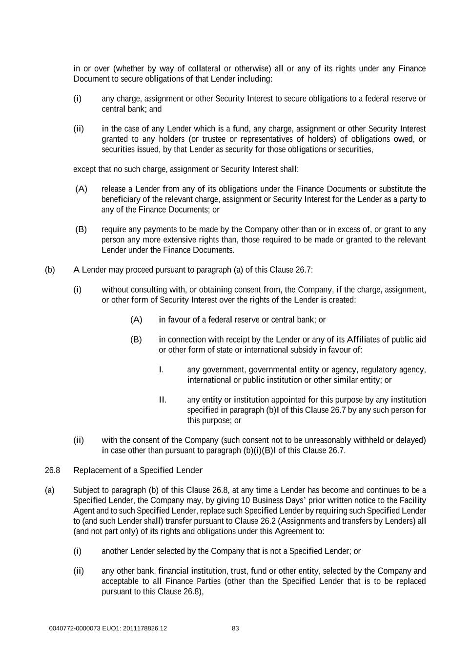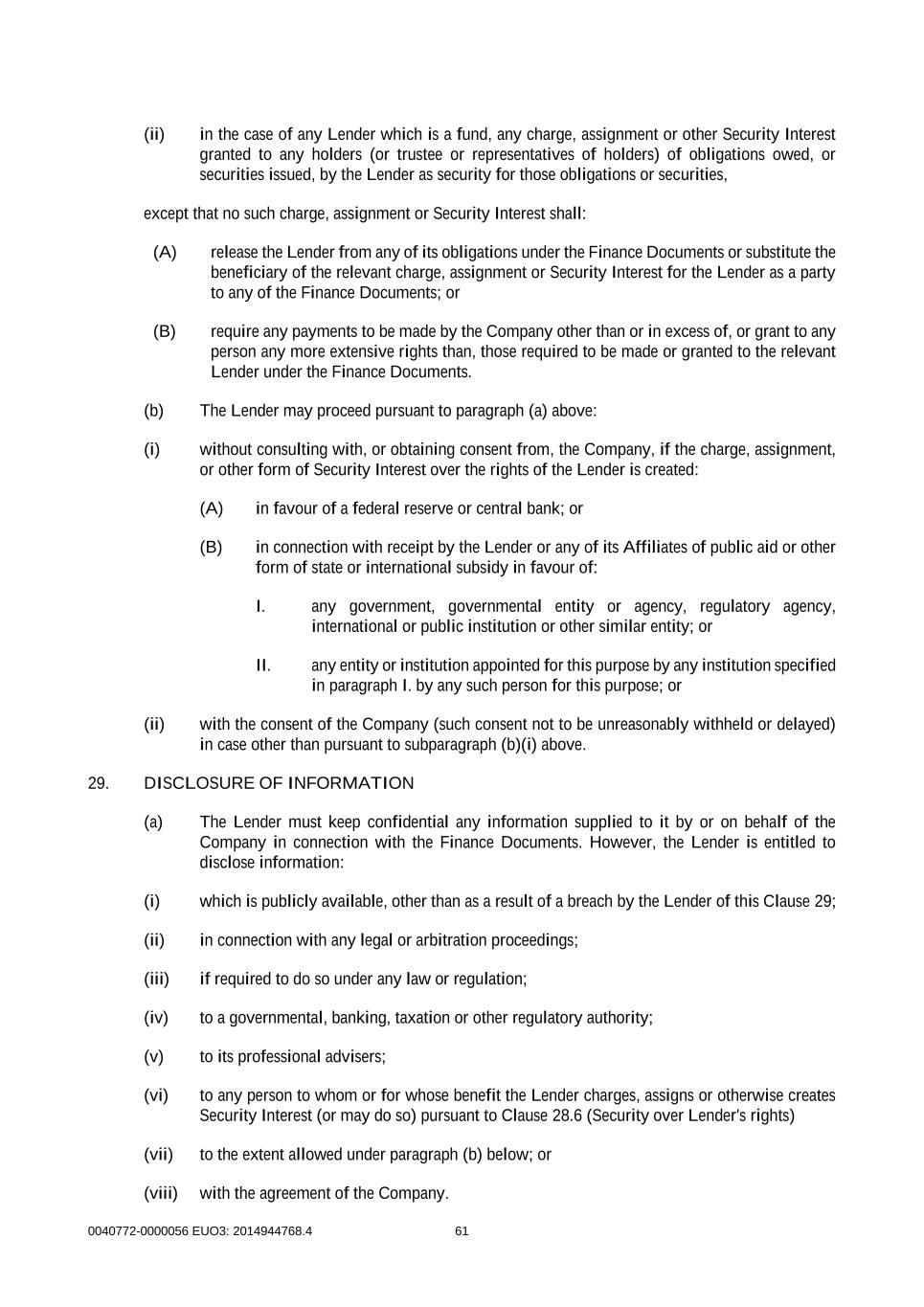 0040772-0000056 EUO3: 2014944768.4 61 (ii) in the case of any Lender which is a fund, any charge, assignment or other Security Interest granted to any holders (or trustee or representatives of holders) of obligations owed, or securities issued, by the Lender as security for those obligations or securities, except that no such charge, assignment or Security Interest shall: (A) release the Lender from any of its obligations under the Finance Documents or substitute the beneficiary of the relevant charge, assignment or Security Interest for the Lender as a party to any of the Finance Documents; or (B) require any payments to be made by the Company other than or in excess of, or grant to any person any more extensive rights than, those required to be made or granted to the relevant Lender under the Finance Documents. (b) The Lender may proceed pursuant to paragraph (a) above: (i) without consulting with, or obtaining consent from, the Company, if the charge, assignment, or other form of Security Interest over the rights of the Lender is created: (A) in favour of a federal reserve or central bank; or (B) in connection with receipt by the Lender or any of its Affiliates of public aid or other form of state or international subsidy in favour of: I. any government, governmental entity or agency, regulatory agency, international or public institution or other similar entity; or II. any entity or institution appointed for this purpose by any institution specified in paragraph I. by any such person for this purpose; or (ii) with the consent of the Company (such consent not to be unreasonably withheld or delayed) in case other than pursuant to subparagraph (b)(i) above. 29. DISCLOSURE OF INFORMATION (a) The Lender must keep confidential any information supplied to it by or on behalf of the Company in connection with the Finance Documents. However, the Lender is entitled to disclose information: (i) which is publicly available, other than as a result of a breach by the Lender of this Clause 29; (ii) in connection with any legal or arbitration proceedings; (iii) if required to do so under any law or regulation; (iv) to a governmental, banking, taxation or other regulatory authority; (v) to its professional advisers; (vi) to any person to whom or for whose benefit the Lender charges, assigns or otherwise creates Security Interest (or may do so) pursuant to Clause 28.6 (Security over Lender's rights) (vii) to the extent allowed under paragraph (b) below; or (viii) with the agreement of the Company.