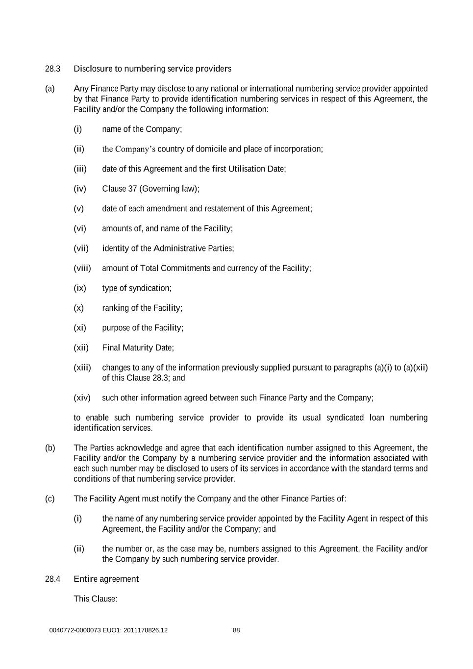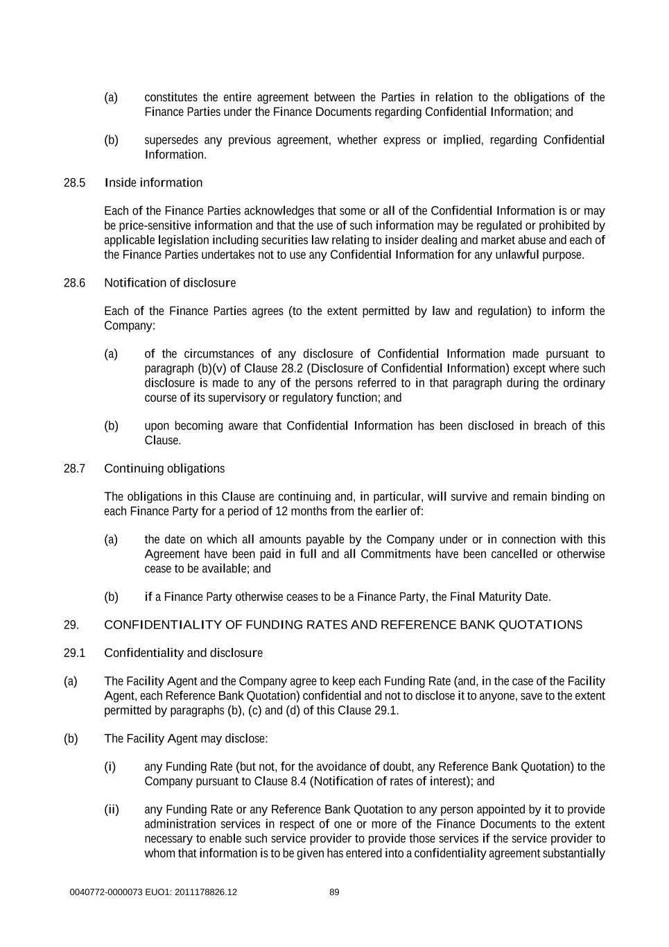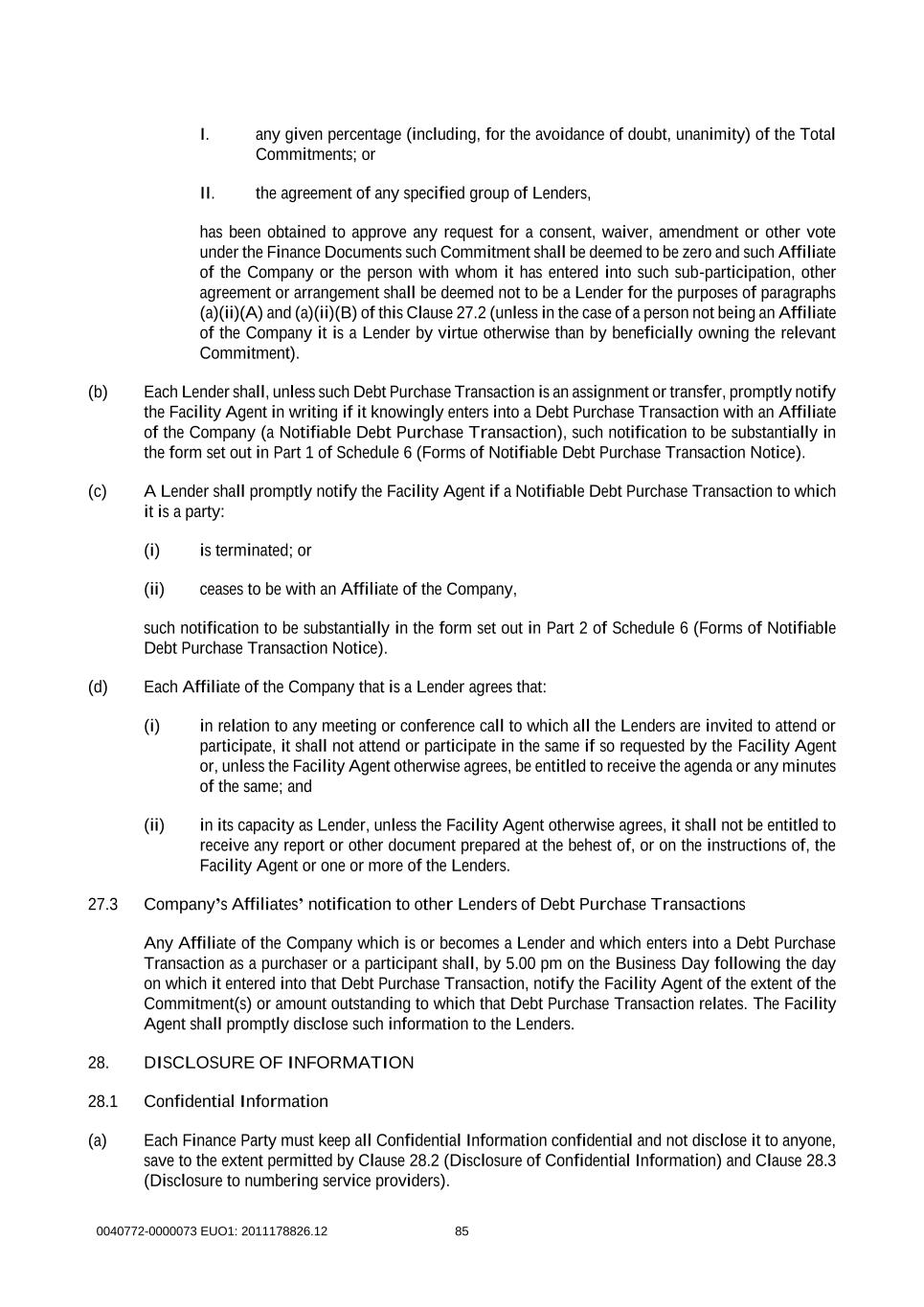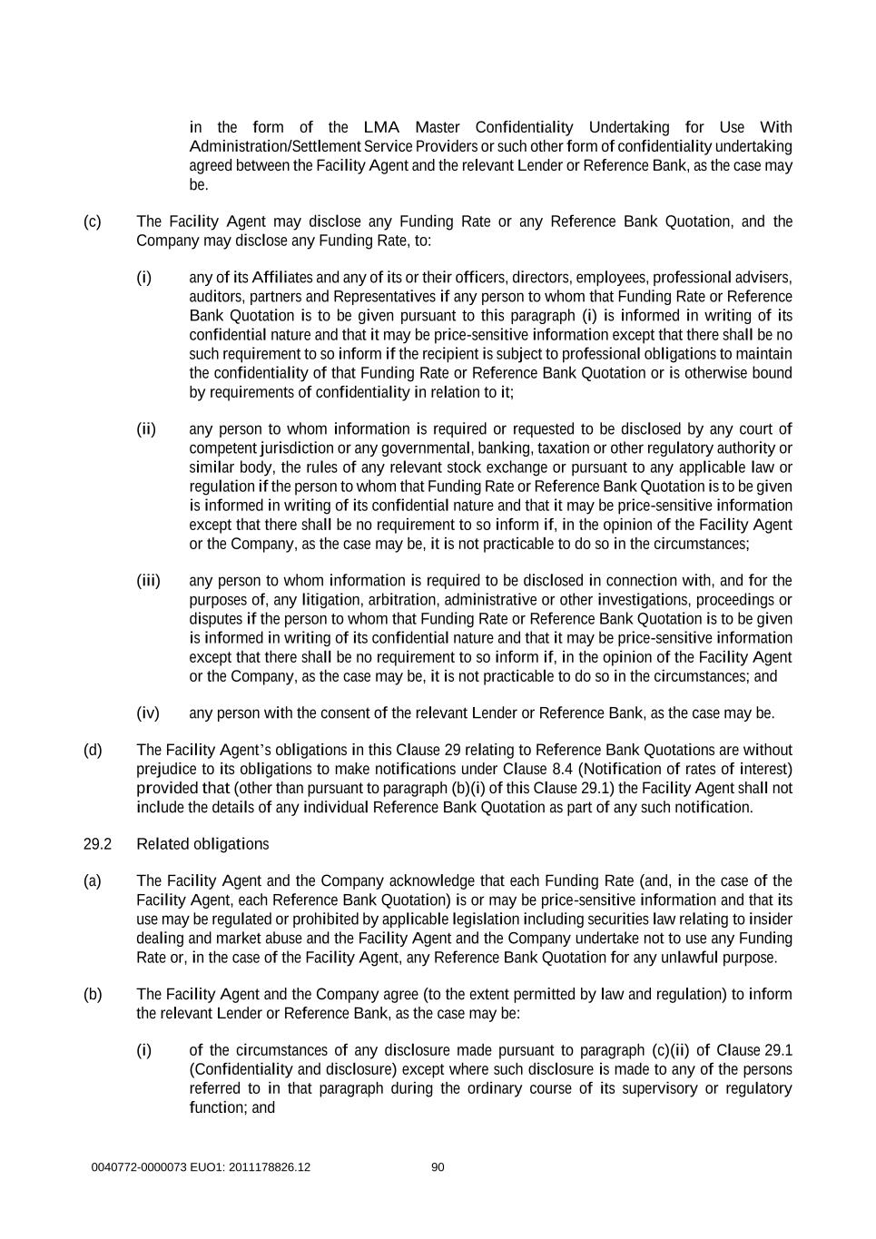 0040772-0000056 EUO3: 2014944768.4 61 (ii) in the case of any Lender which is a fund, any charge, assignment or other Security Interest granted to any holders (or trustee or representatives of holders) of obligations owed, or securities issued, by the Lender as security for those obligations or securities, except that no such charge, assignment or Security Interest shall: (A) release the Lender from any of its obligations under the Finance Documents or substitute the beneficiary of the relevant charge, assignment or Security Interest for the Lender as a party to any of the Finance Documents; or (B) require any payments to be made by the Company other than or in excess of, or grant to any person any more extensive rights than, those required to be made or granted to the relevant Lender under the Finance Documents. (b) The Lender may proceed pursuant to paragraph (a) above: (i) without consulting with, or obtaining consent from, the Company, if the charge, assignment, or other form of Security Interest over the rights of the Lender is created: (A) in favour of a federal reserve or central bank; or (B) in connection with receipt by the Lender or any of its Affiliates of public aid or other form of state or international subsidy in favour of: I. any government, governmental entity or agency, regulatory agency, international or public institution or other similar entity; or II. any entity or institution appointed for this purpose by any institution specified in paragraph I. by any such person for this purpose; or (ii) with the consent of the Company (such consent not to be unreasonably withheld or delayed) in case other than pursuant to subparagraph (b)(i) above. 29. DISCLOSURE OF INFORMATION (a) The Lender must keep confidential any information supplied to it by or on behalf of the Company in connection with the Finance Documents. However, the Lender is entitled to disclose information: (i) which is publicly available, other than as a result of a breach by the Lender of this Clause 29; (ii) in connection with any legal or arbitration proceedings; (iii) if required to do so under any law or regulation; (iv) to a governmental, banking, taxation or other regulatory authority; (v) to its professional advisers; (vi) to any person to whom or for whose benefit the Lender charges, assigns or otherwise creates Security Interest (or may do so) pursuant to Clause 28.6 (Security over Lender's rights) (vii) to the extent allowed under paragraph (b) below; or (viii) with the agreement of the Company.