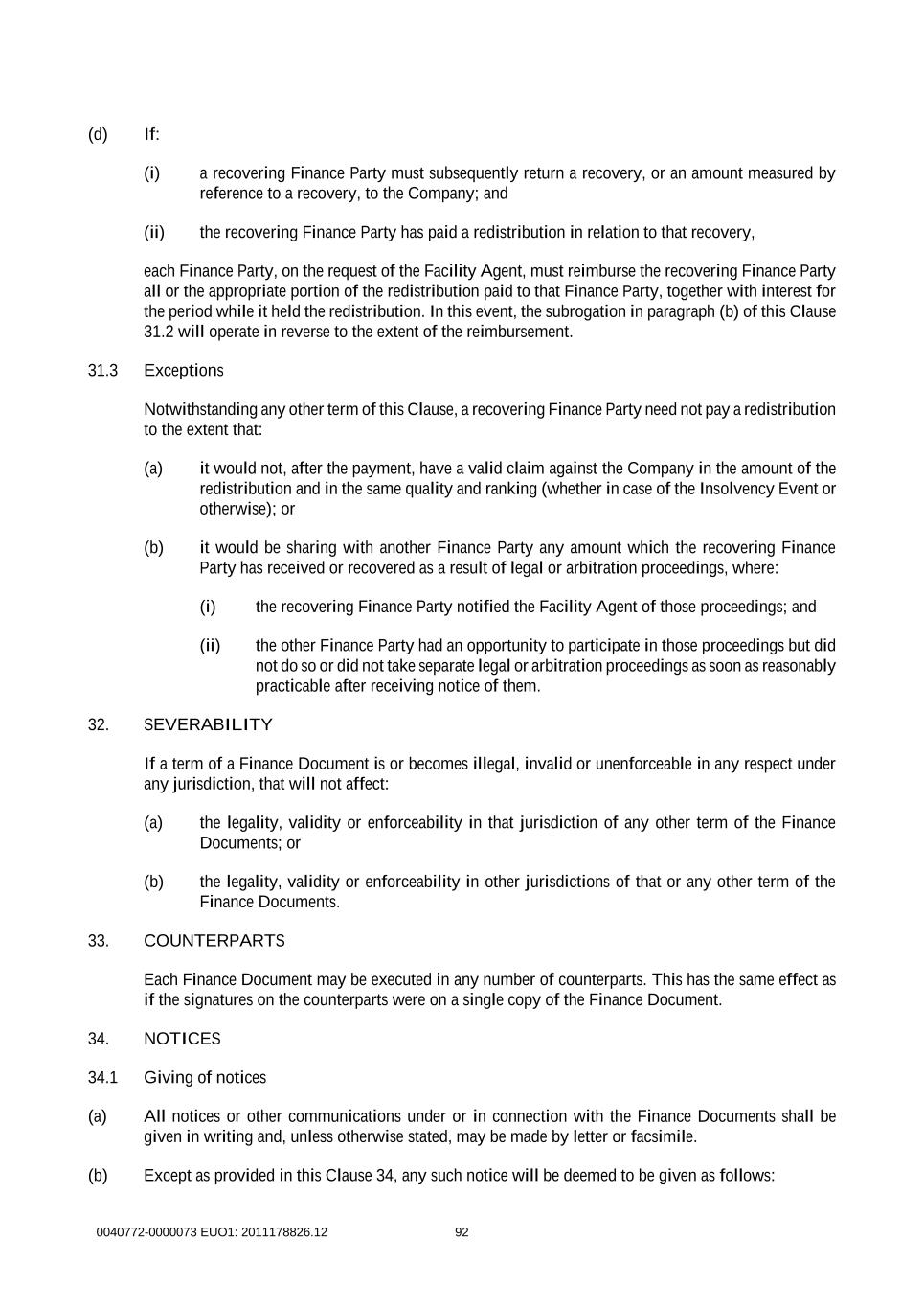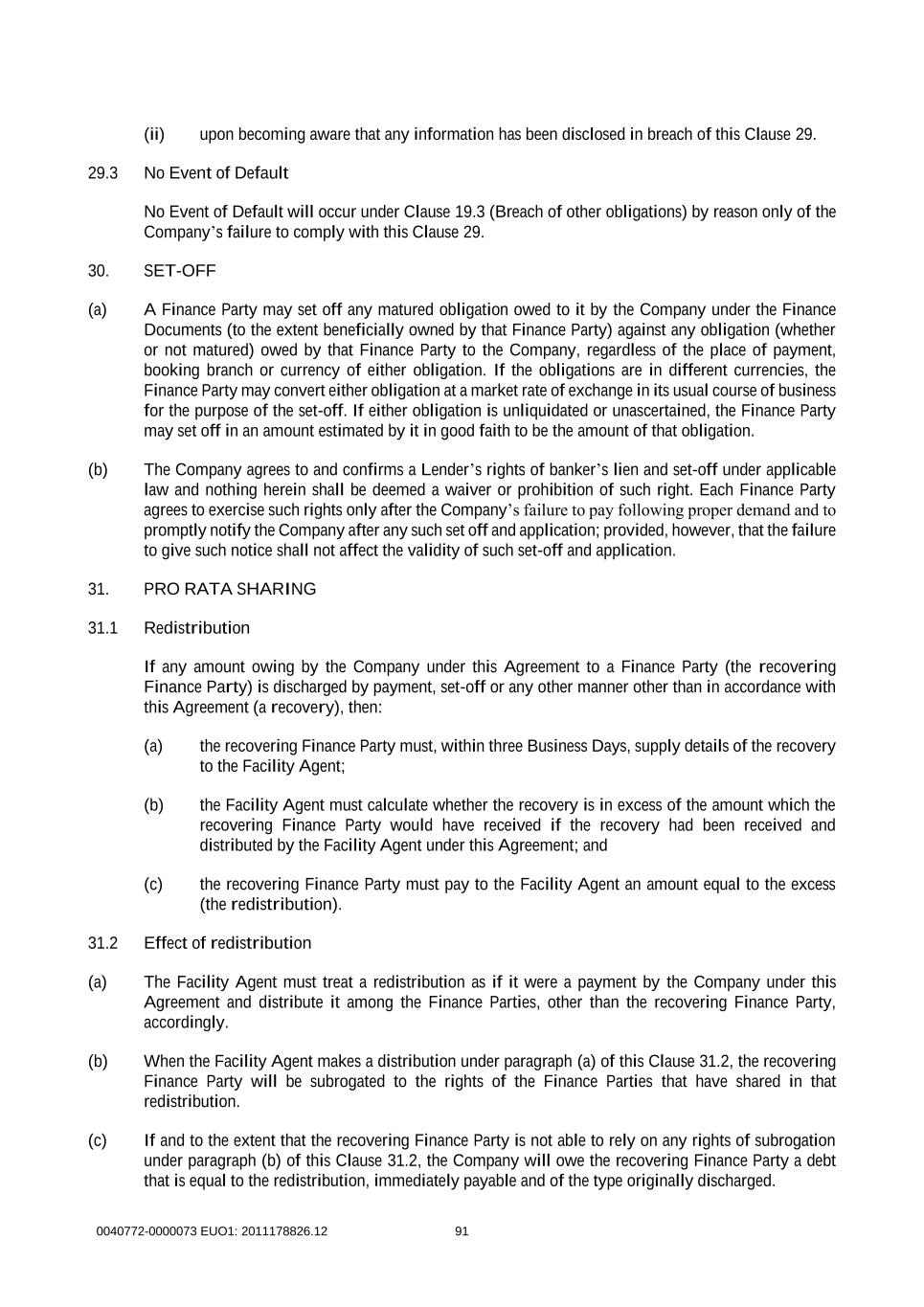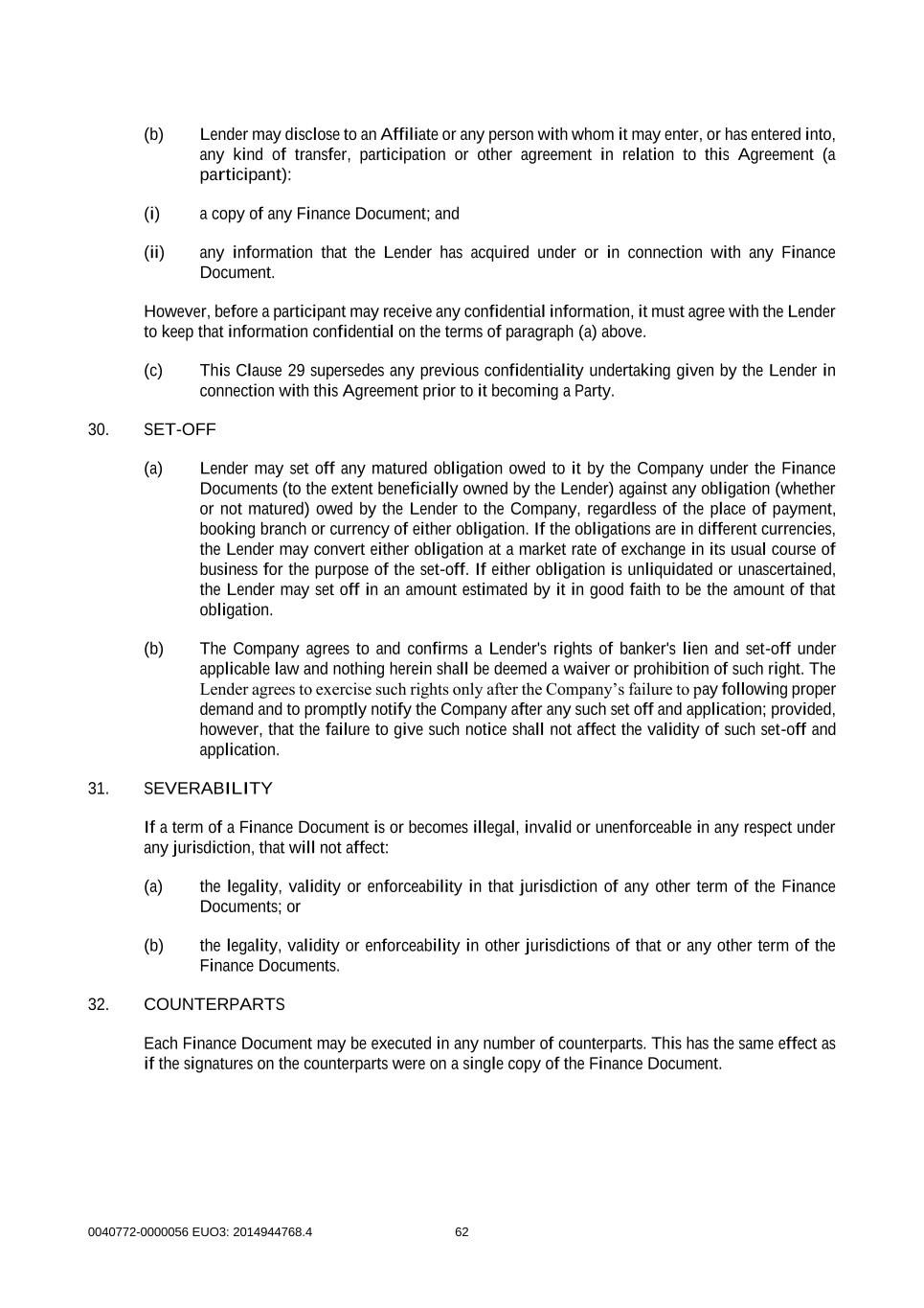 0040772-0000056 EUO3: 2014944768.4 62 (b) Lender may disclose to an Affiliate or any person with whom it may enter, or has entered into, any kind of transfer, participation or other agreement in relation to this Agreement (a participant): (i) a copy of any Finance Document; and (ii) any information that the Lender has acquired under or in connection with any Finance Document. However, before a participant may receive any confidential information, it must agree with the Lender to keep that information confidential on the terms of paragraph (a) above. (c) This Clause 29 supersedes any previous confidentiality undertaking given by the Lender in connection with this Agreement prior to it becoming a Party. 30. SET-OFF (a) Lender may set off any matured obligation owed to it by the Company under the Finance Documents (to the extent beneficially owned by the Lender) against any obligation (whether or not matured) owed by the Lender to the Company, regardless of the place of payment, booking branch or currency of either obligation. If the obligations are in different currencies, the Lender may convert either obligation at a market rate of exchange in its usual course of business for the purpose of the set-off. If either obligation is unliquidated or unascertained, the Lender may set off in an amount estimated by it in good faith to be the amount of that obligation. (b) The Company agrees to and confirms a Lender's rights of banker's lien and set-off under applicable law and nothing herein shall be deemed a waiver or prohibition of such right. The Lender agrees to exercise such rights only after the Company’s failure to pay following proper demand and to promptly notify the Company after any such set off and application; provided, however, that the failure to give such notice shall not affect the validity of such set-off and application. 31. SEVERABILITY If a term of a Finance Document is or becomes illegal, invalid or unenforceable in any respect under any jurisdiction, that will not affect: (a) the legality, validity or enforceability in that jurisdiction of any other term of the Finance Documents; or (b) the legality, validity or enforceability in other jurisdictions of that or any other term of the Finance Documents. 32. COUNTERPARTS Each Finance Document may be executed in any number of counterparts. This has the same effect as if the signatures on the counterparts were on a single copy of the Finance Document.