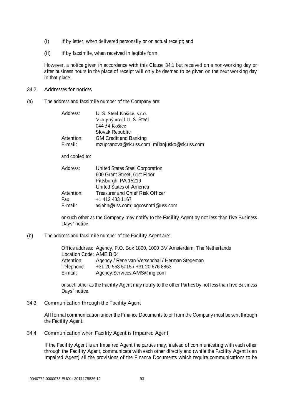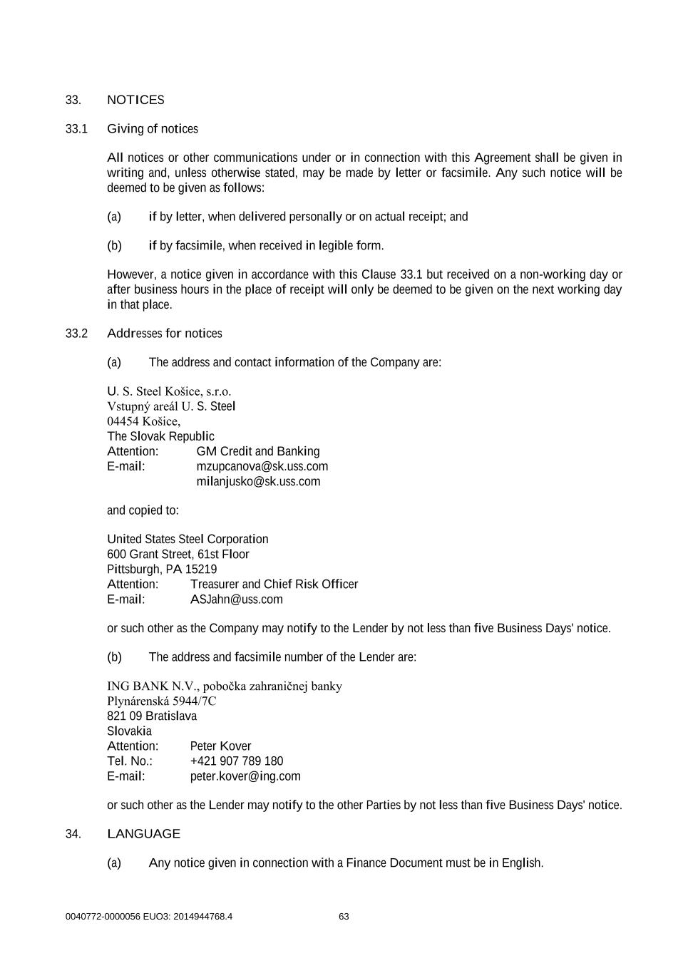 0040772-0000056 EUO3: 2014944768.4 63 33. NOTICES 33.1 Giving of notices All notices or other communications under or in connection with this Agreement shall be given in writing and, unless otherwise stated, may be made by letter or facsimile. Any such notice will be deemed to be given as follows: (a) if by letter, when delivered personally or on actual receipt; and (b) if by facsimile, when received in legible form. However, a notice given in accordance with this Clause 33.1 but received on a non-working day or after business hours in the place of receipt will only be deemed to be given on the next working day in that place. 33.2 Addresses for notices (a) The address and contact information of the Company are: U. S. Steel Košice, s.r.o. Vstupný areál U. S. Steel 04454 Košice, The Slovak Republic Attention: GM Credit and Banking E-mail: mzupcanova@sk.uss.com milanjusko@sk.uss.com and copied to: United States Steel Corporation 600 Grant Street, 61st Floor Pittsburgh, PA 15219 Attention: Treasurer and Chief Risk Officer E-mail: ASJahn@uss.com or such other as the Company may notify to the Lender by not less than five Business Days' notice. (b) The address and facsimile number of the Lender are: ING BANK N.V., pobočka zahraničnej banky Plynárenská 5944/7C 821 09 Bratislava Slovakia Attention: Peter Kover Tel. No.: +421 907 789 180 E-mail: peter.kover@ing.com or such other as the Lender may notify to the other Parties by not less than five Business Days' notice. 34. LANGUAGE (a) Any notice given in connection with a Finance Document must be in English.